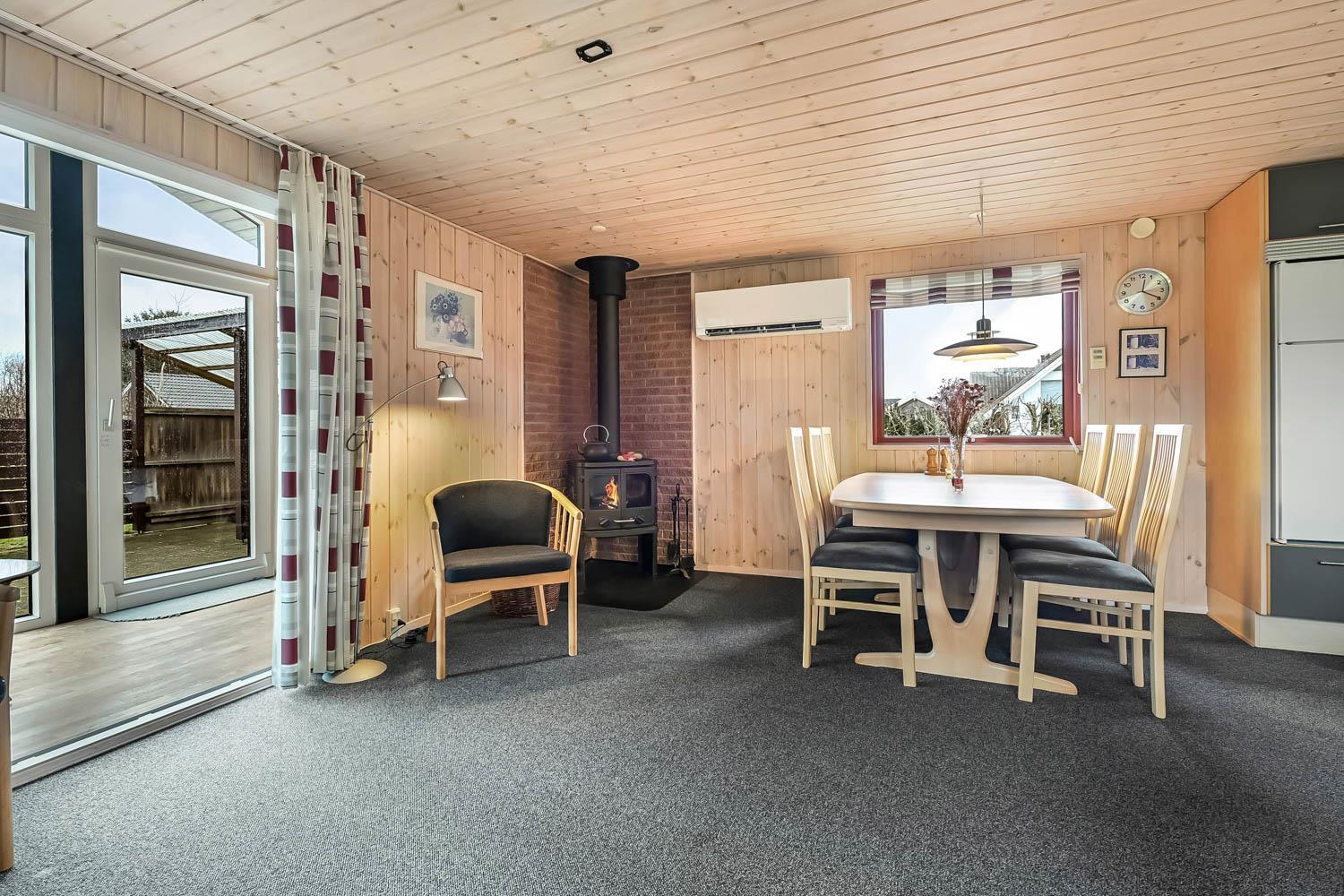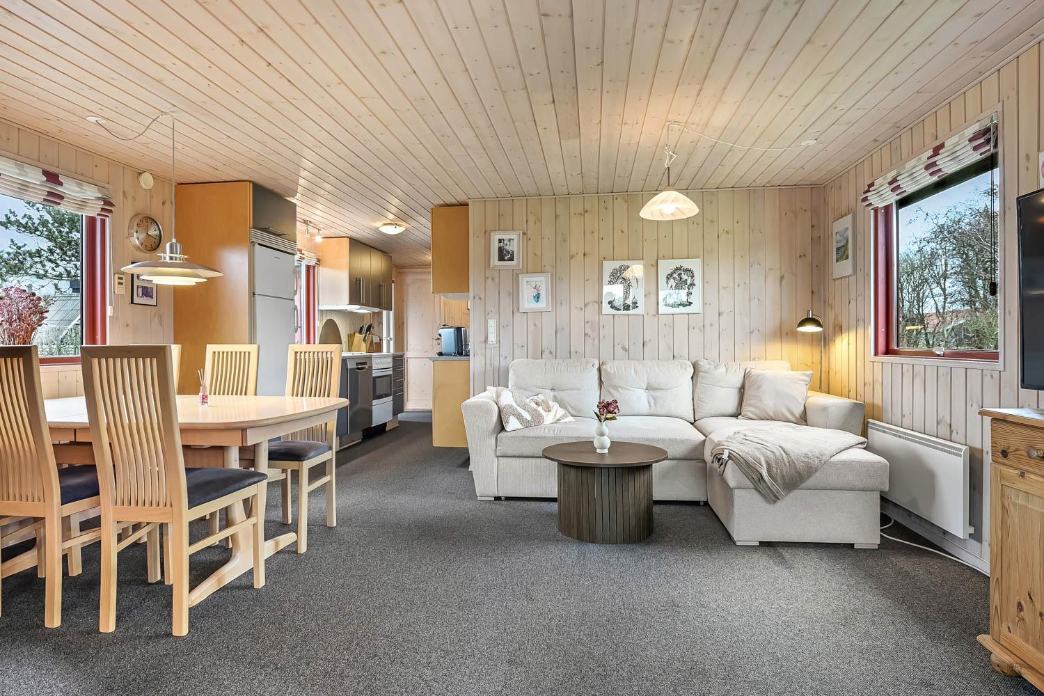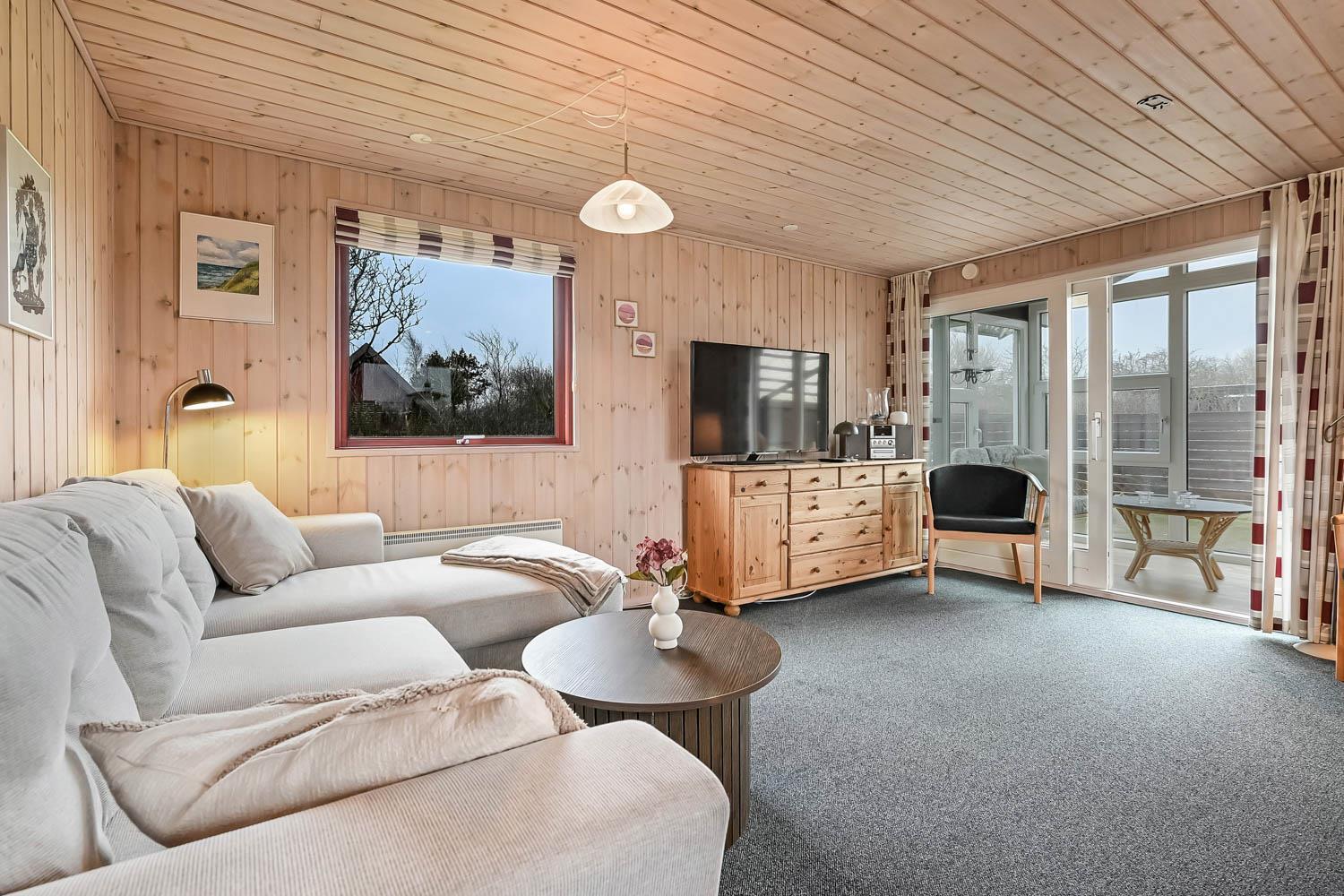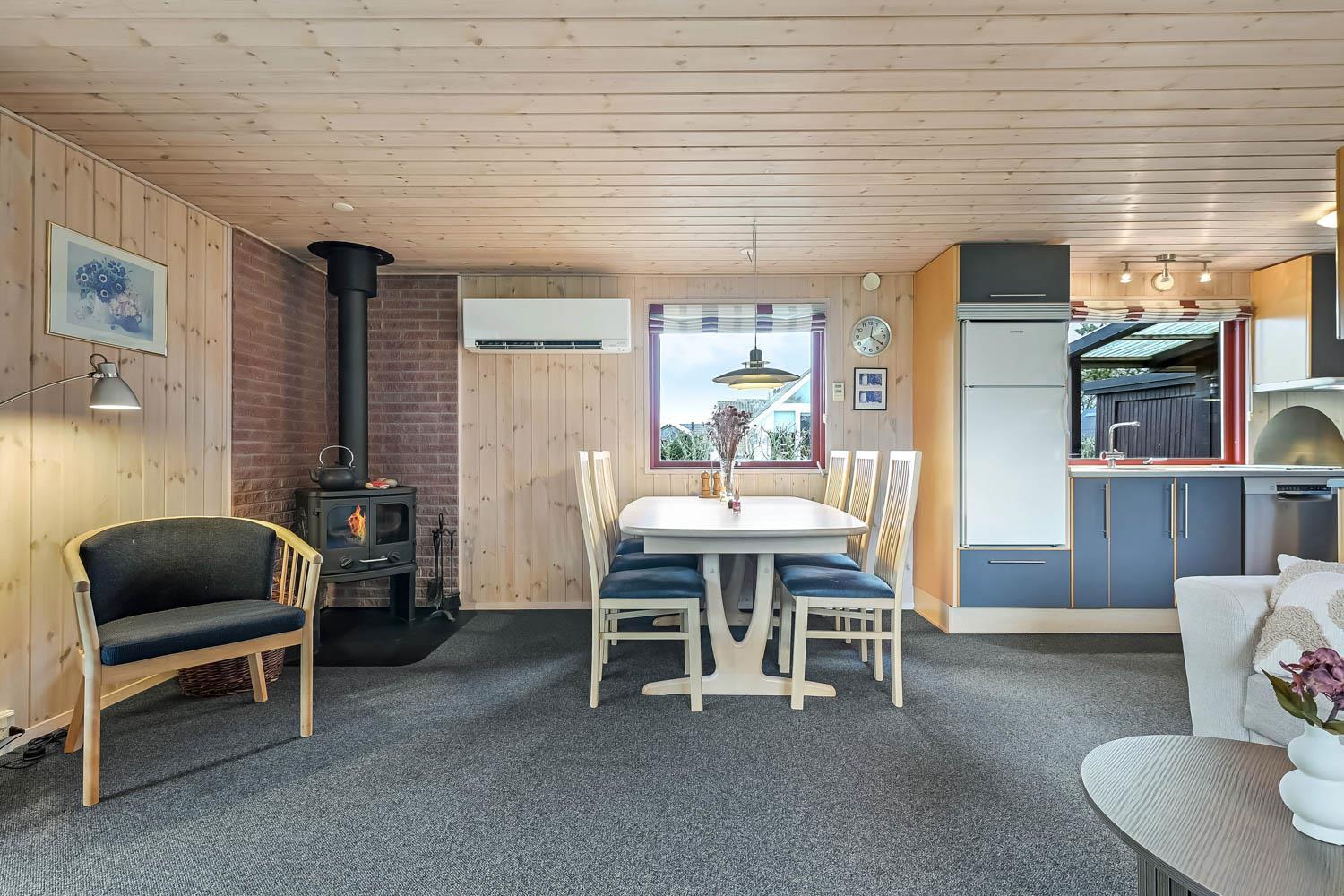 Køkken og stue er integreret i samme rum og det er er rigtig hyggelig og pænt indrettet. Her er polstermøbler med sofabord, fjernsyn og stereoanlæg med CD-afspiller. På TV'et kan man se både tyske og danske DR-kanaler. Slap af foran den knitrende brændeovn som sammen med varmepumpen hjælper med at reducere udgiften til varmeregningen. Herudover står spisebordet også i stuen. Fra stuen er der udgang til en dejlig havestue med et lille bord og et par stole herfra er der adgang til et af soverummene.