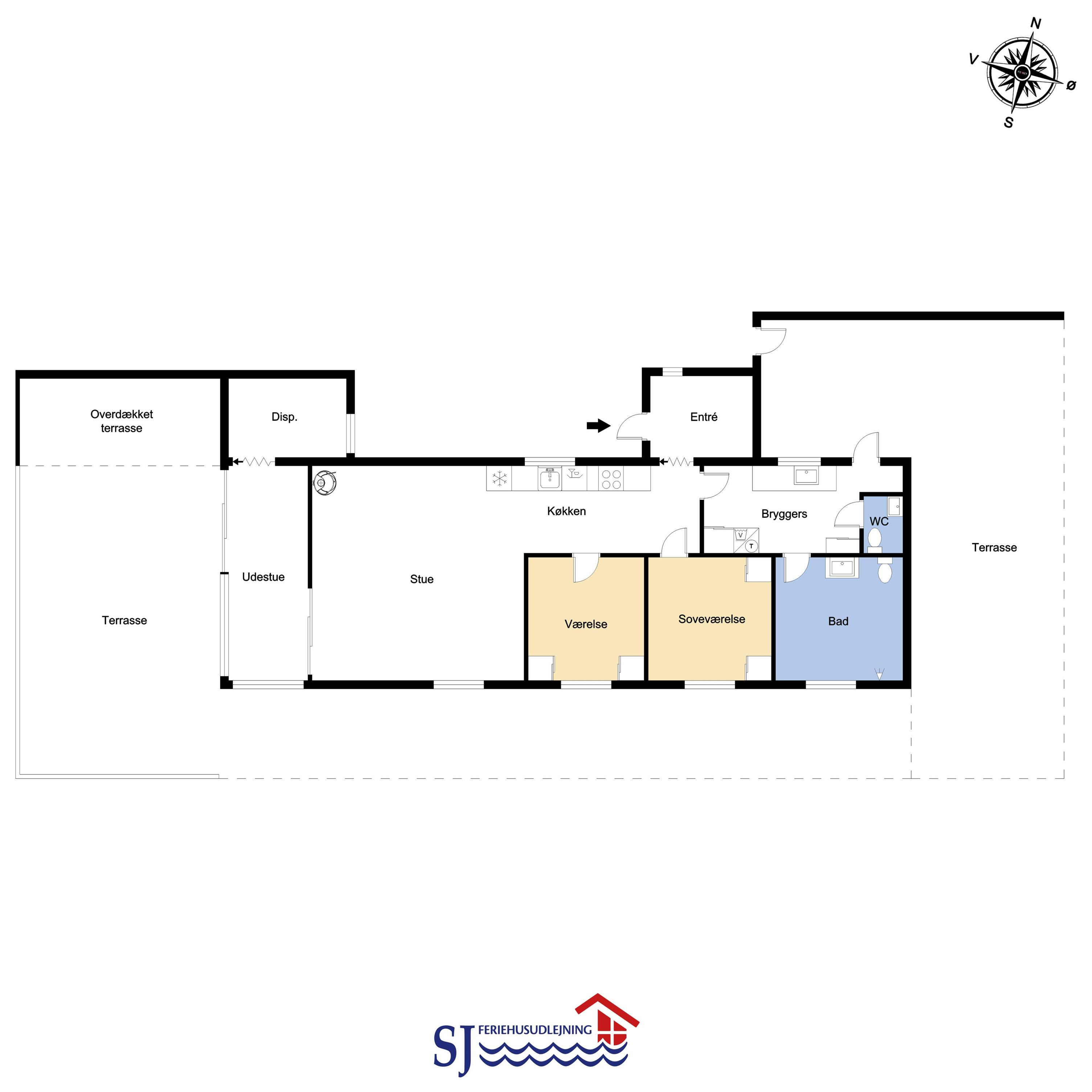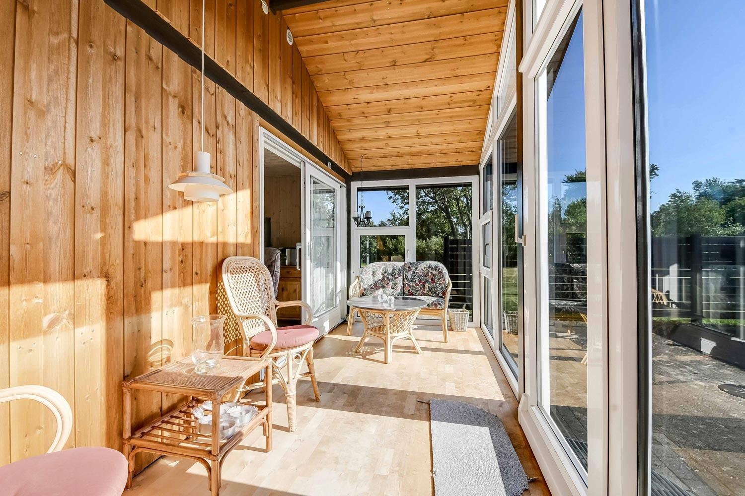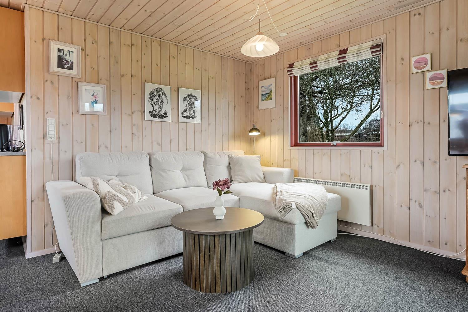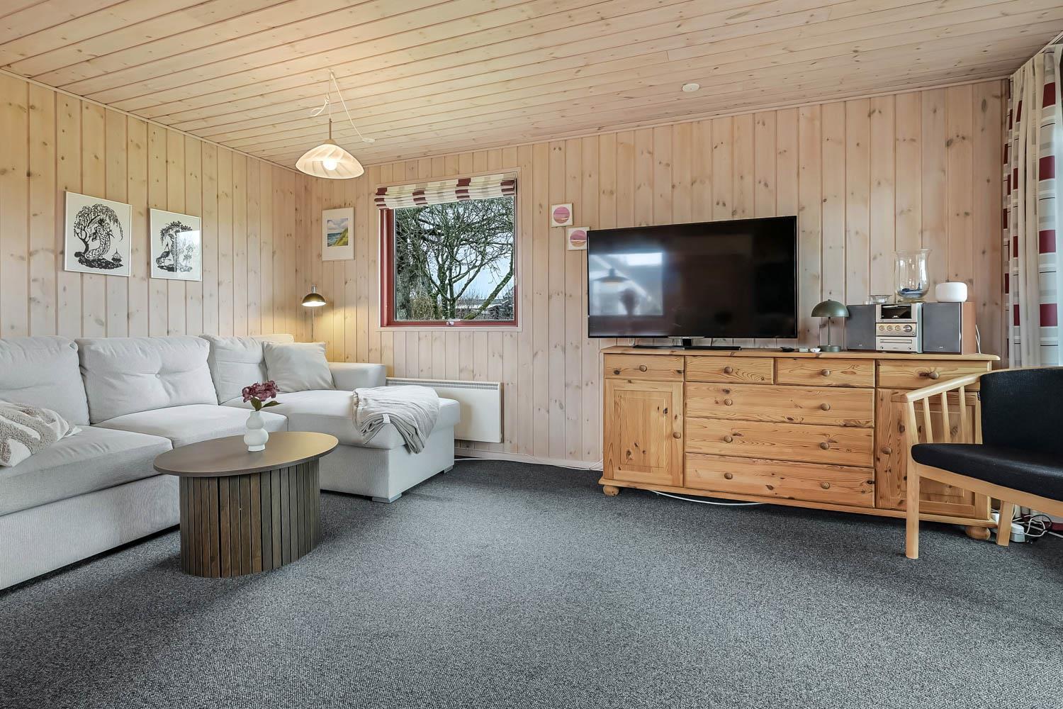 Køkken og stue er integreret i samme rum og det er er rigtig hyggelig og pænt indrettet. Her er polstermøbler med sofabord, fjernsyn og stereoanlæg med CD-afspiller. På TV'et kan man se både tyske og danske DR-kanaler. Slap af foran den knitrende brændeovn som sammen med varmepumpen hjælper med at reducere udgiften til varmeregningen. Herudover står spisebordet også i stuen. Fra stuen er der udgang til en dejlig havestue med et lille bord og et par stole herfra er der adgang til et af soverummene.