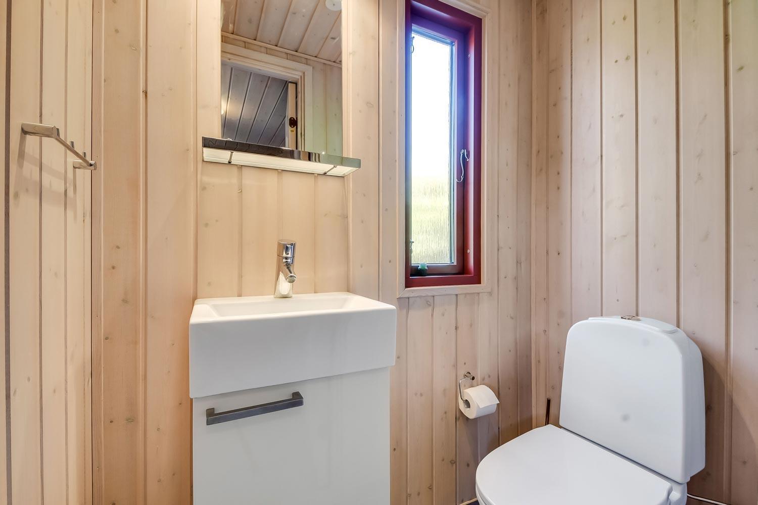 Huset har 3 soveværelser (1DS, 1DS 1KS). Badeværelser med håndvask, bruser, toilet og gulvvarme samt god skabsplads. Ekstra toilet med håndvask og toilet. I bryggers er der vaskemaskine og tørretumbler samt en ekstra vask og god skabsplads.