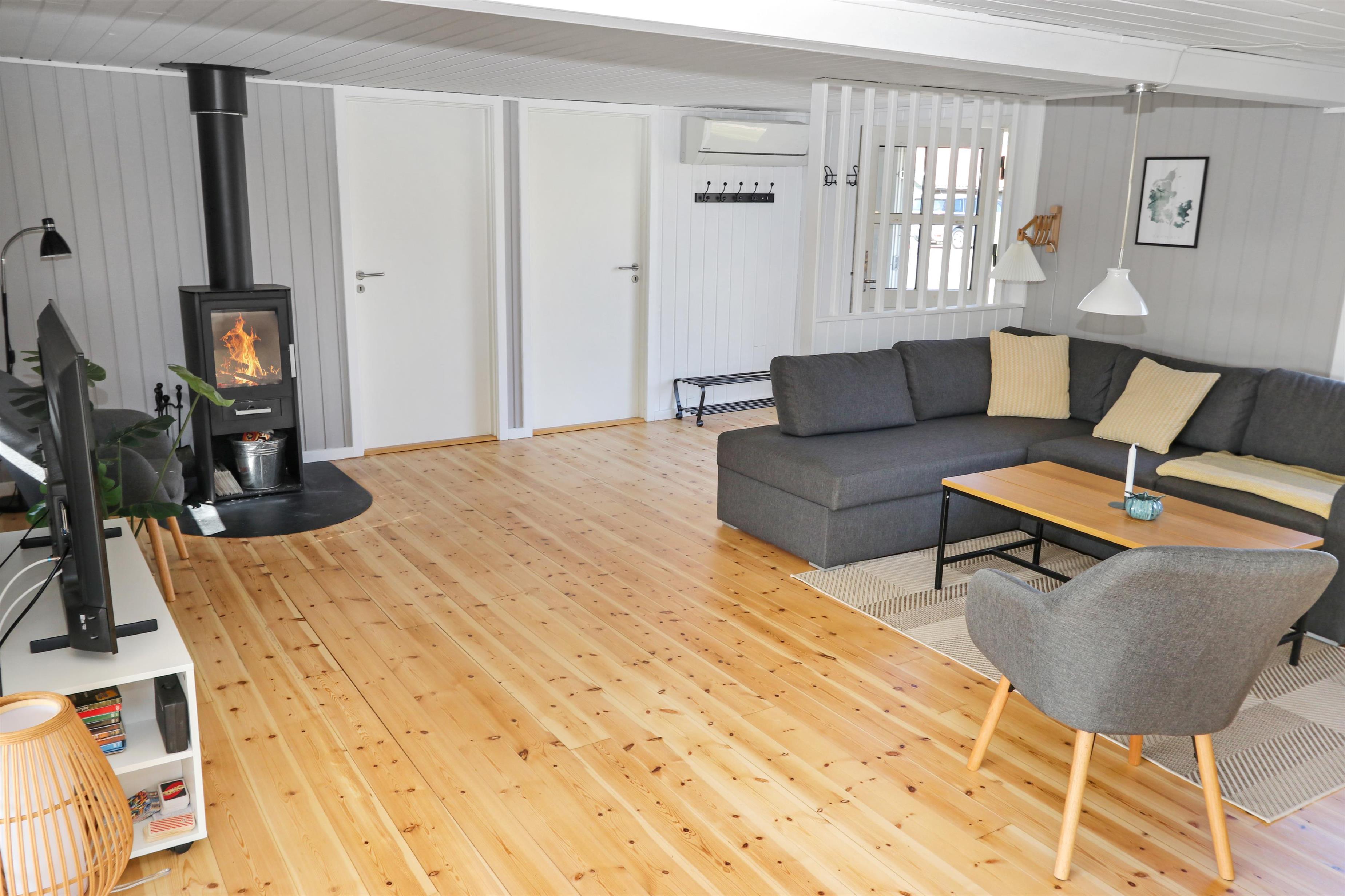 Stuen er indrettet med hyggelig brændeovn, farve-tv med DR-kanaler og TV2 samt et stereoanlæg, så der er mulighed for både afslapning og underholdning. Der er gratis internet, så man kan holde kontakten eller streame sine yndlingsprogrammer. Køkkenet er godt udstyret med el-komfur, køleskab, mikroovn og opvaskemaskine, hvilket gør det nemt at tilberede lækre måltider under ferien.