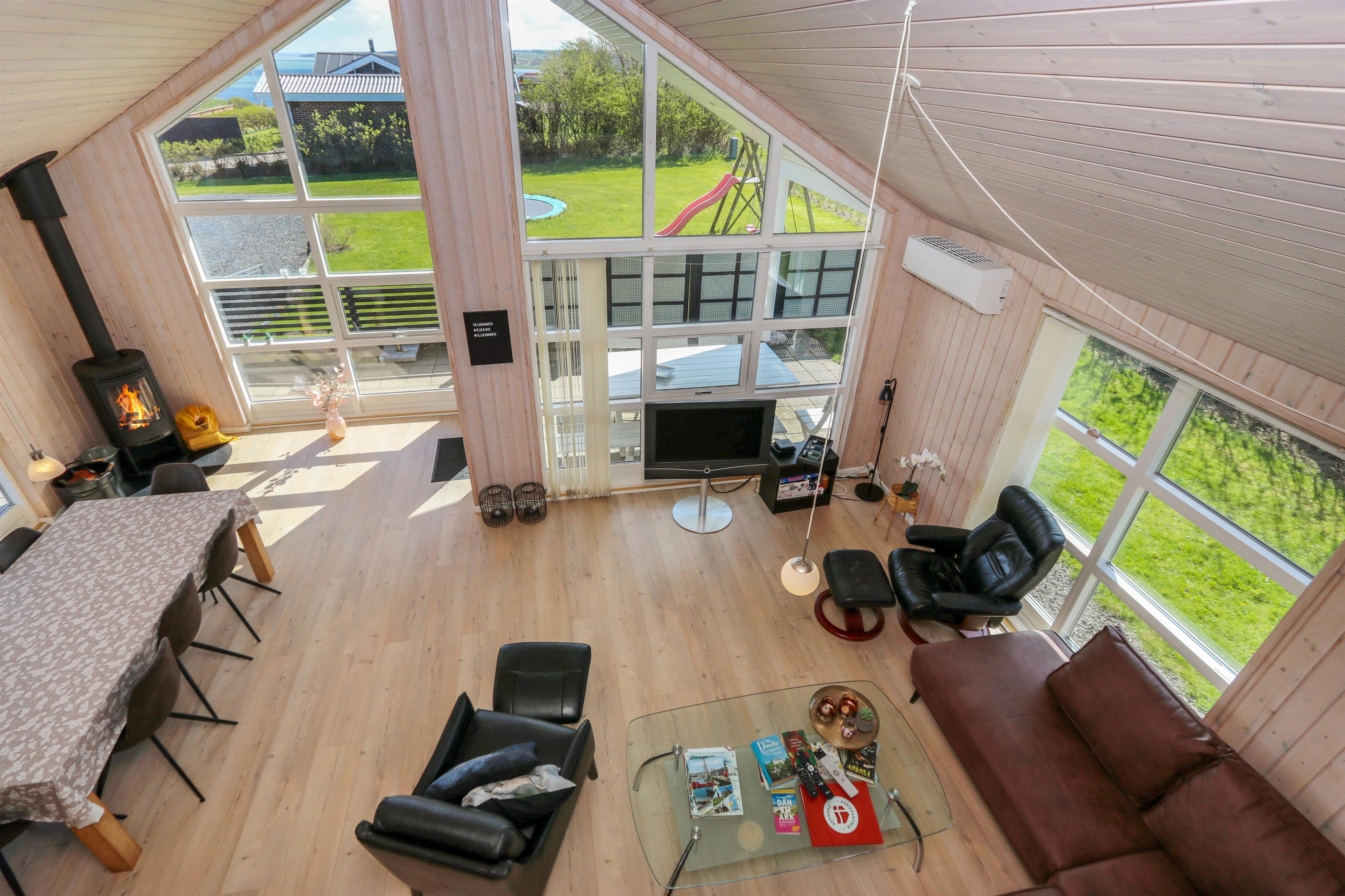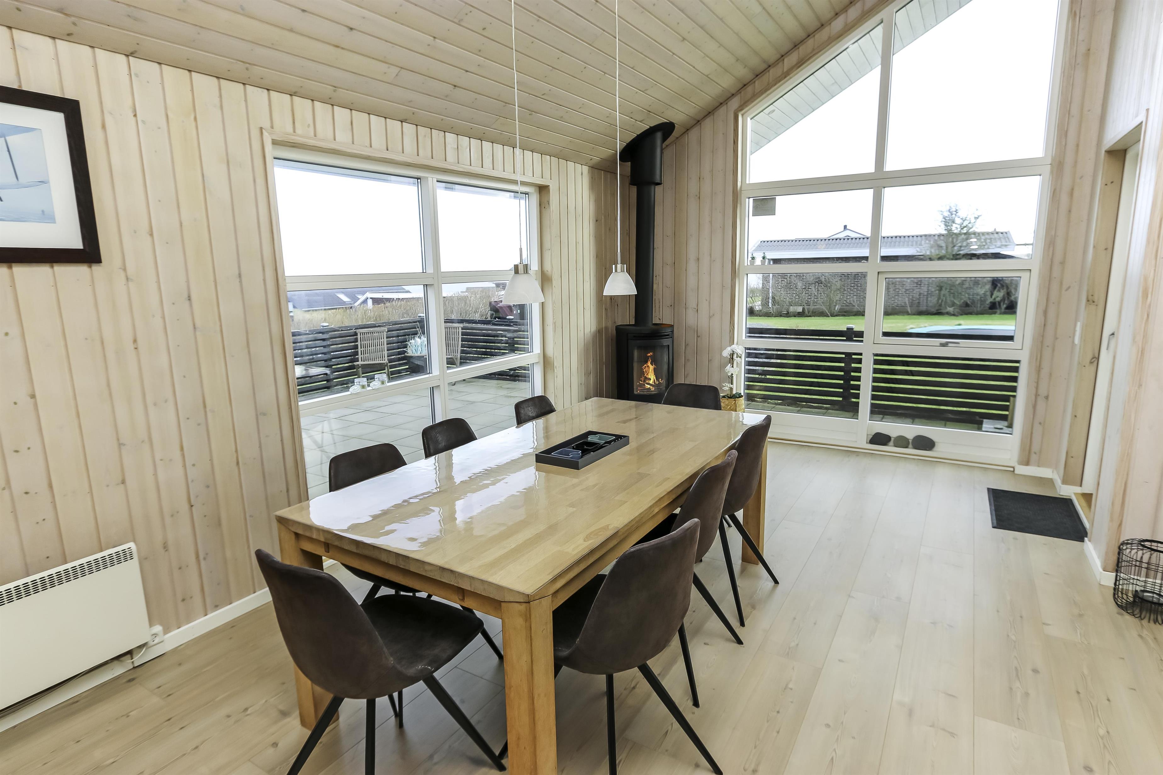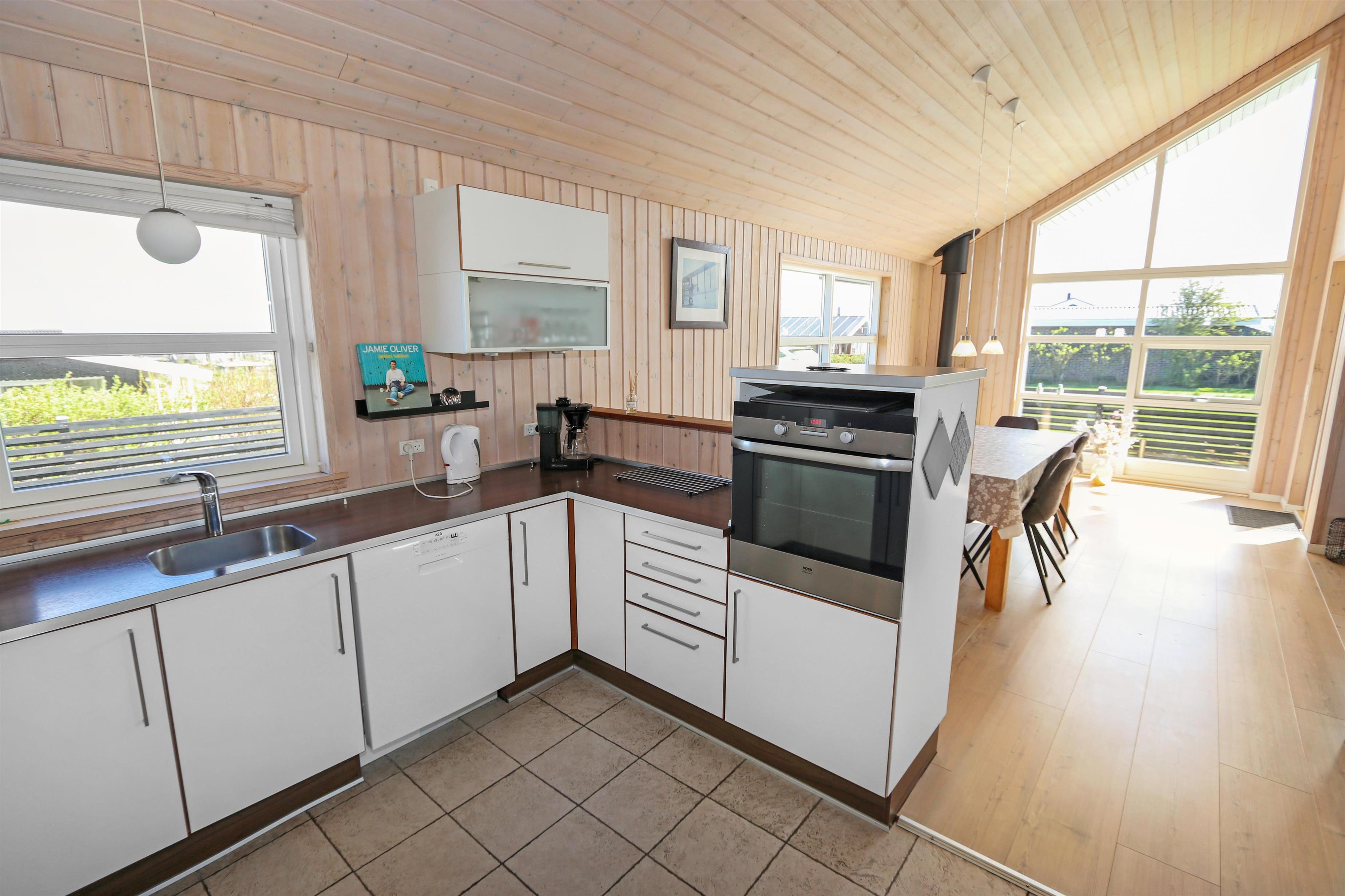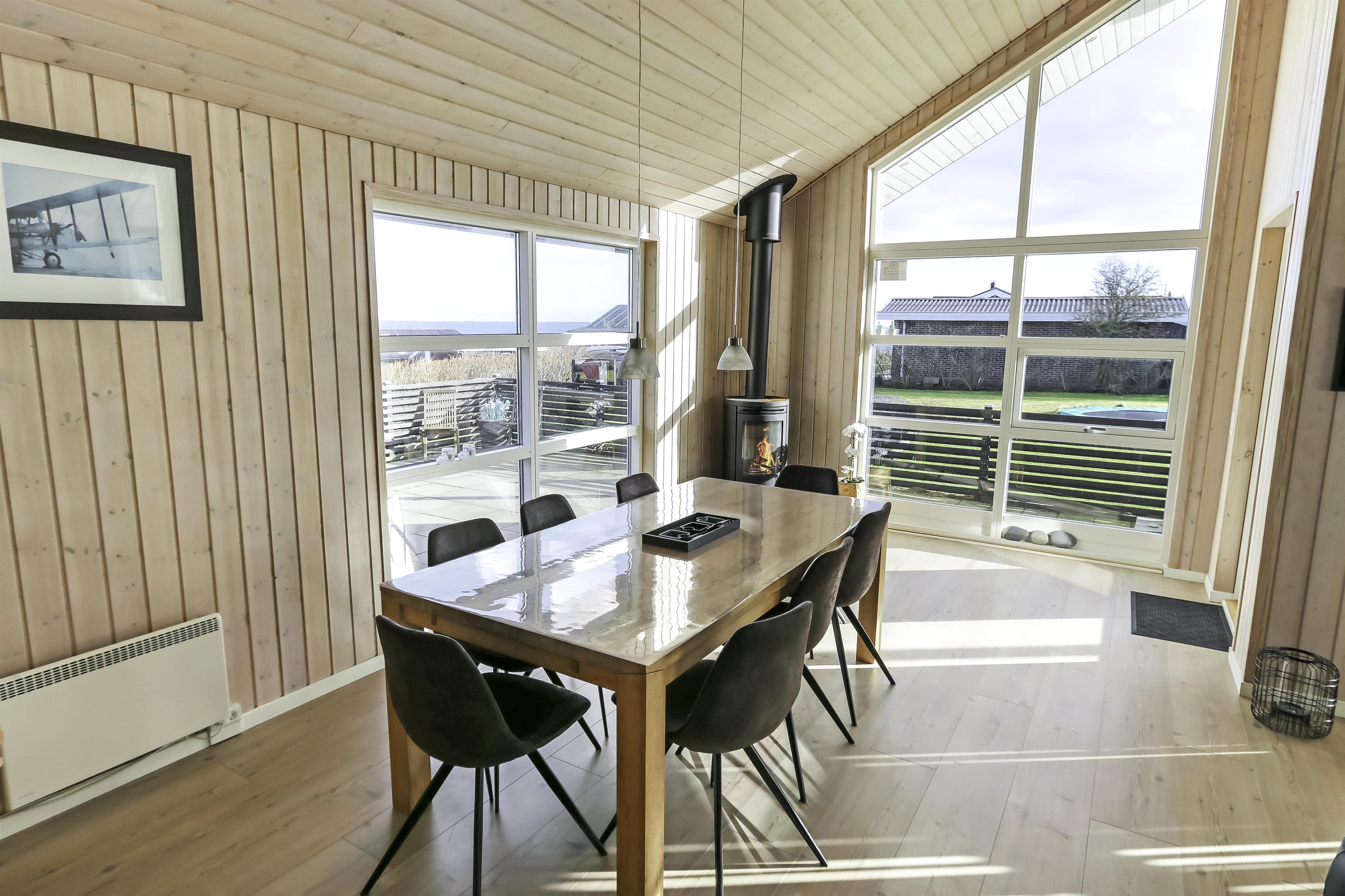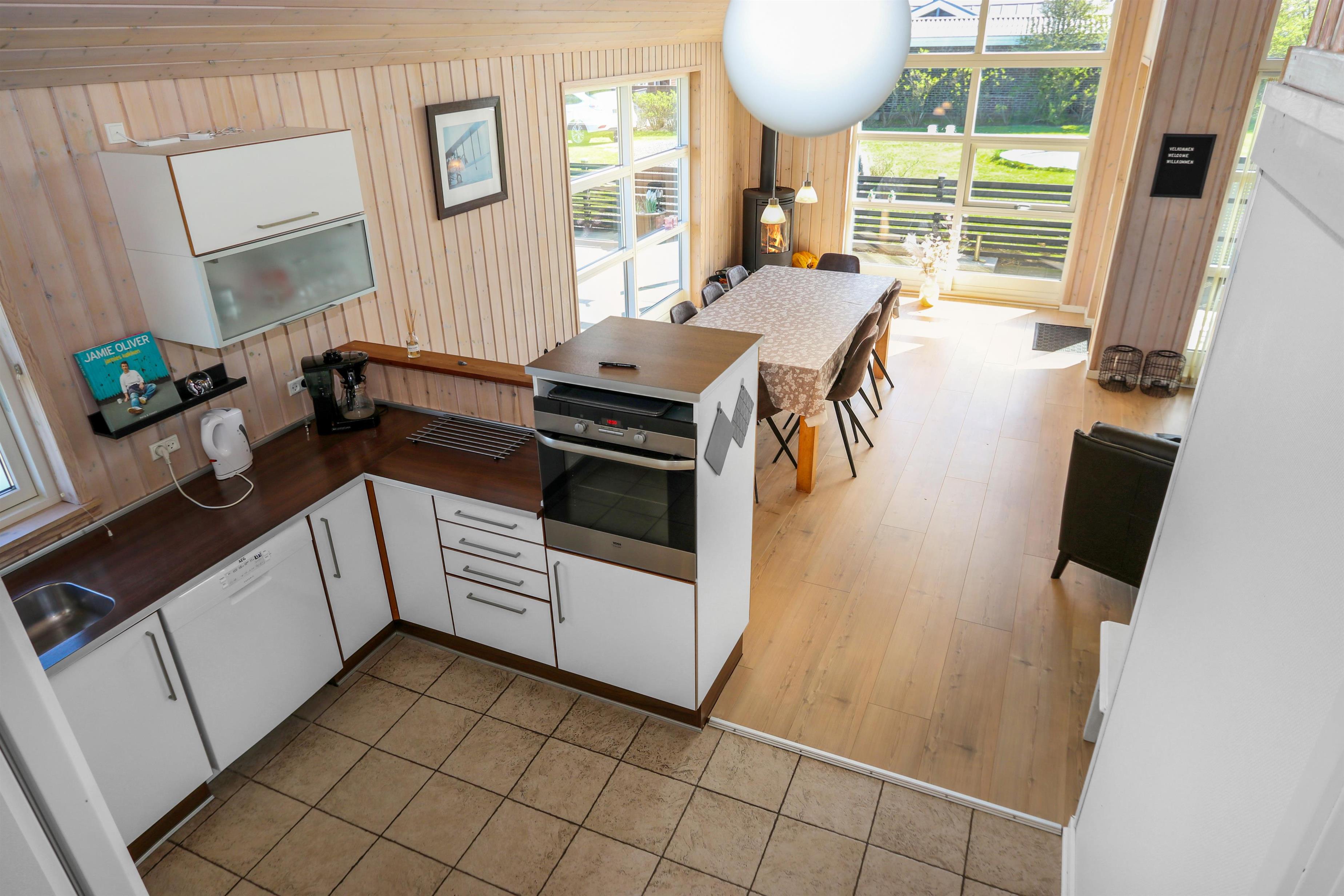 Dette kvalitets feriehus på ca. 98 m2, er bygget i 2009 og er herefter blevet løbende vedligeholdt og renoveret. En rummelig entré med vaskemaskine og tørretumbler byder jer velkommen. En dejlig Kombineret opholdsstue og køkkenhjørne med loft i kip. Opholdsstuen er pænt møblere med bla en hjørnesofa, TV med parabol, som gør at det er muligt at se danske og tyske kanaler samt Chromecast til streaming af abbonnementstjenester. Slap af foran den knitrende brændeovn, som sammen med varmepumpen hjælper med at reducere udgiften til varmeregningen samtidig med I nyder udsigten fra stuen til Limfjorden.