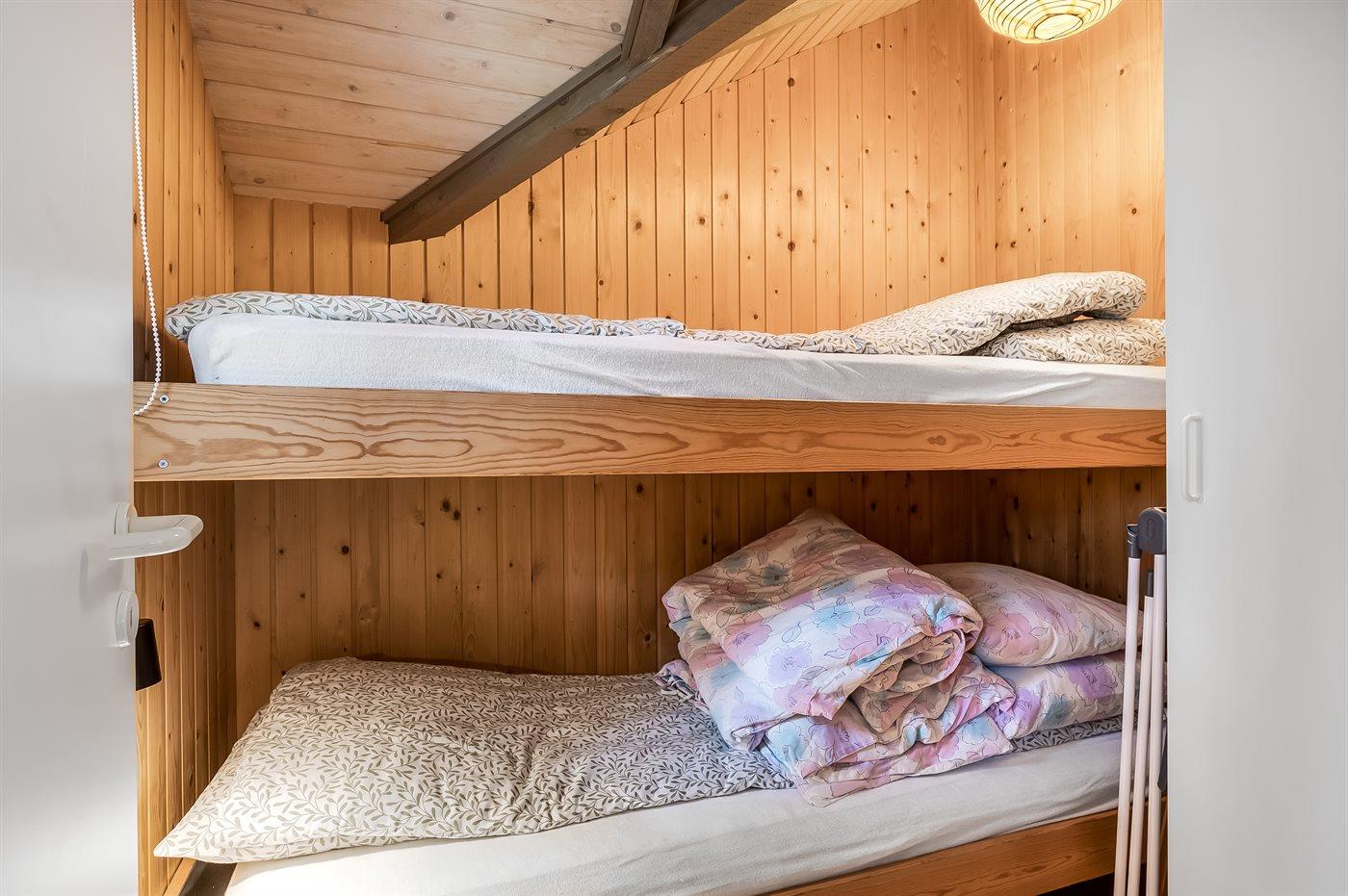 Der er i alt 3 soveværelser. Sovepladserne fordeler sig på: 2 sovepladser i dobbeltseng. 1 soveplads i enkeltseng. 2 sovepladser i køjeseng.