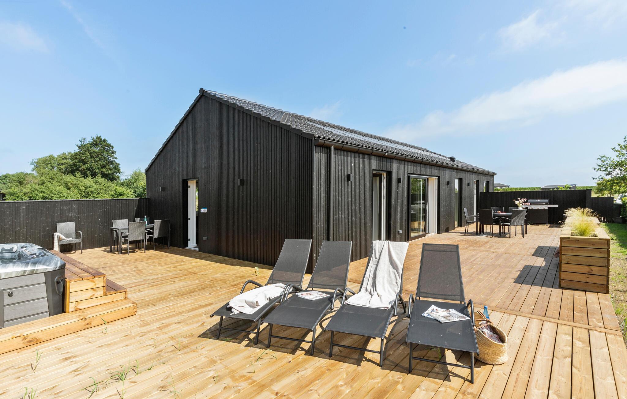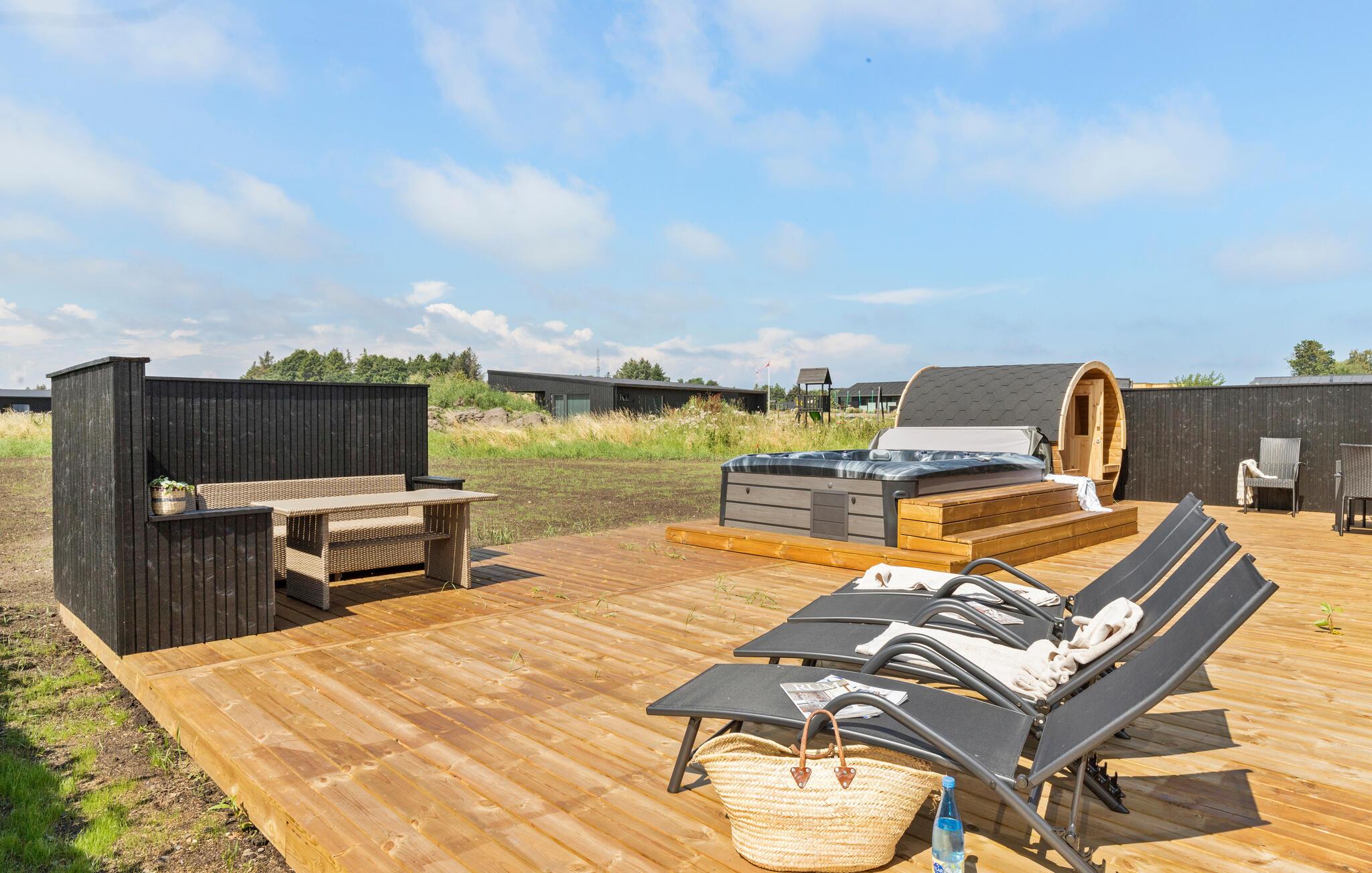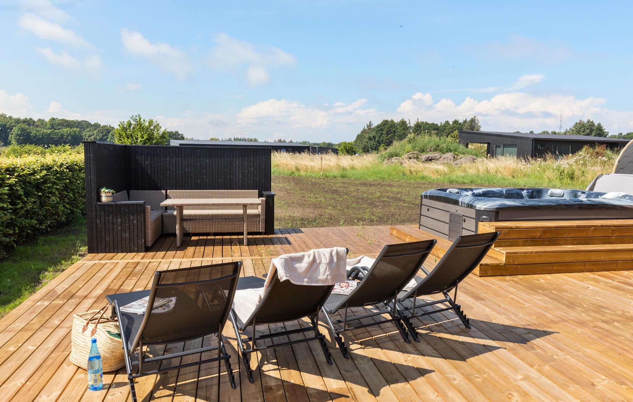 Den store træterrasse er designet til afslapning. Her kan I servere morgenmad i det overdækkede udendørsområde på solrige dage, genoplade batterierne på de behagelige liggestole og nyde afslappende øjeblikke i spabadet eller saunaen.