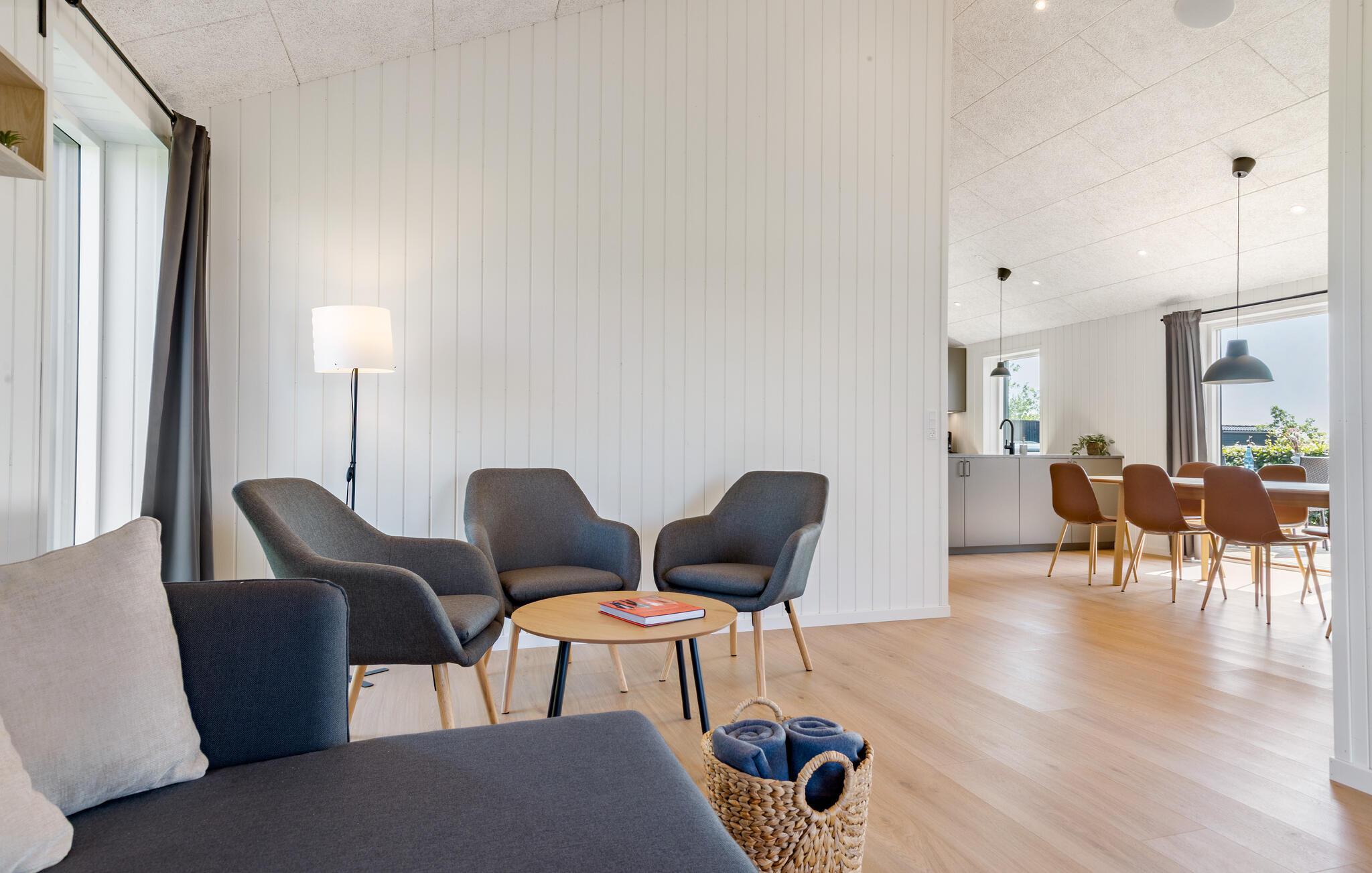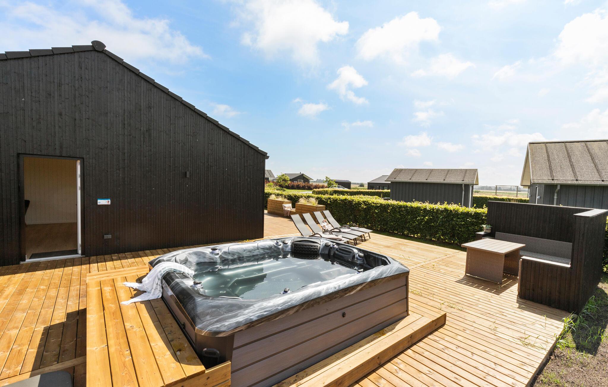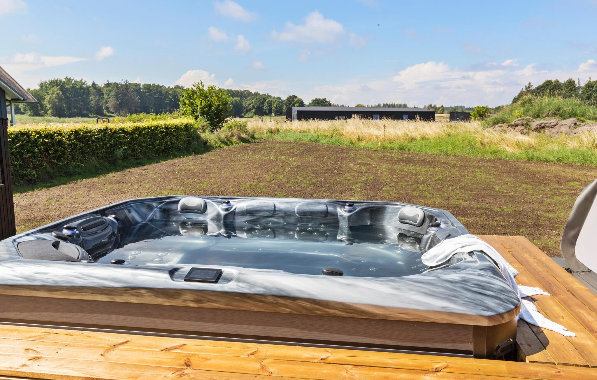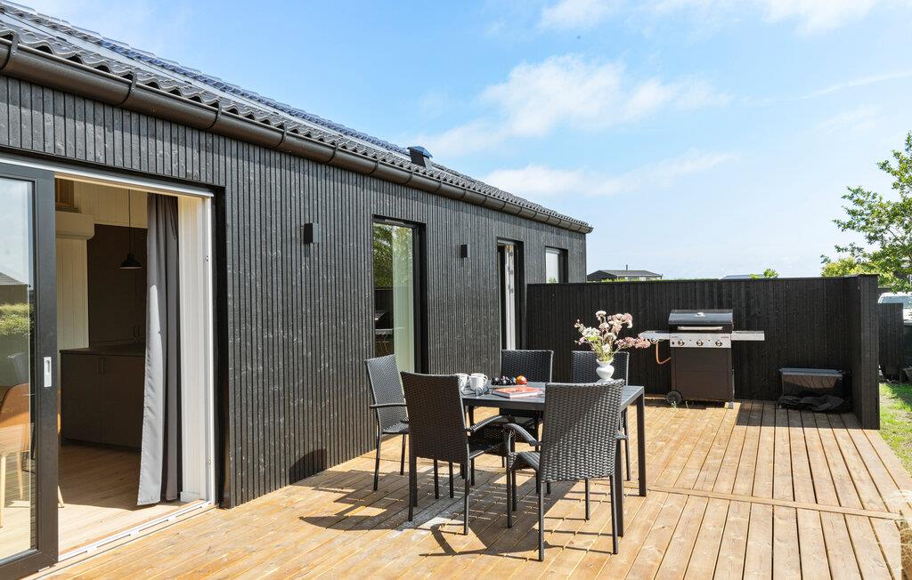 Den store træterrasse er designet til afslapning. Her kan I servere morgenmad i det overdækkede udendørsområde på solrige dage, genoplade batterierne på de behagelige liggestole og nyde afslappende øjeblikke i spabadet eller saunaen.