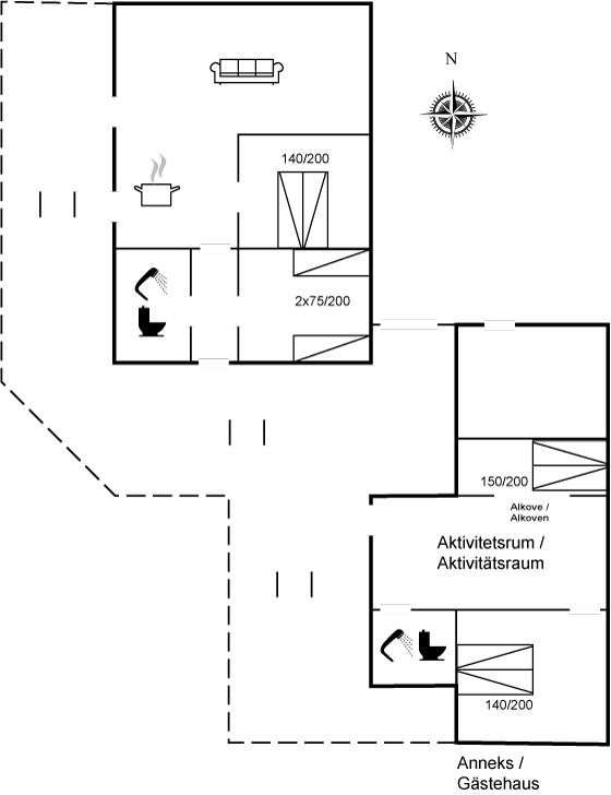 Husets og anneksets indretning gør det velegnet til den lille familie eller 3 par, men også til dem, som vil invitere f.eks. bedsteforældrene med på ferie.