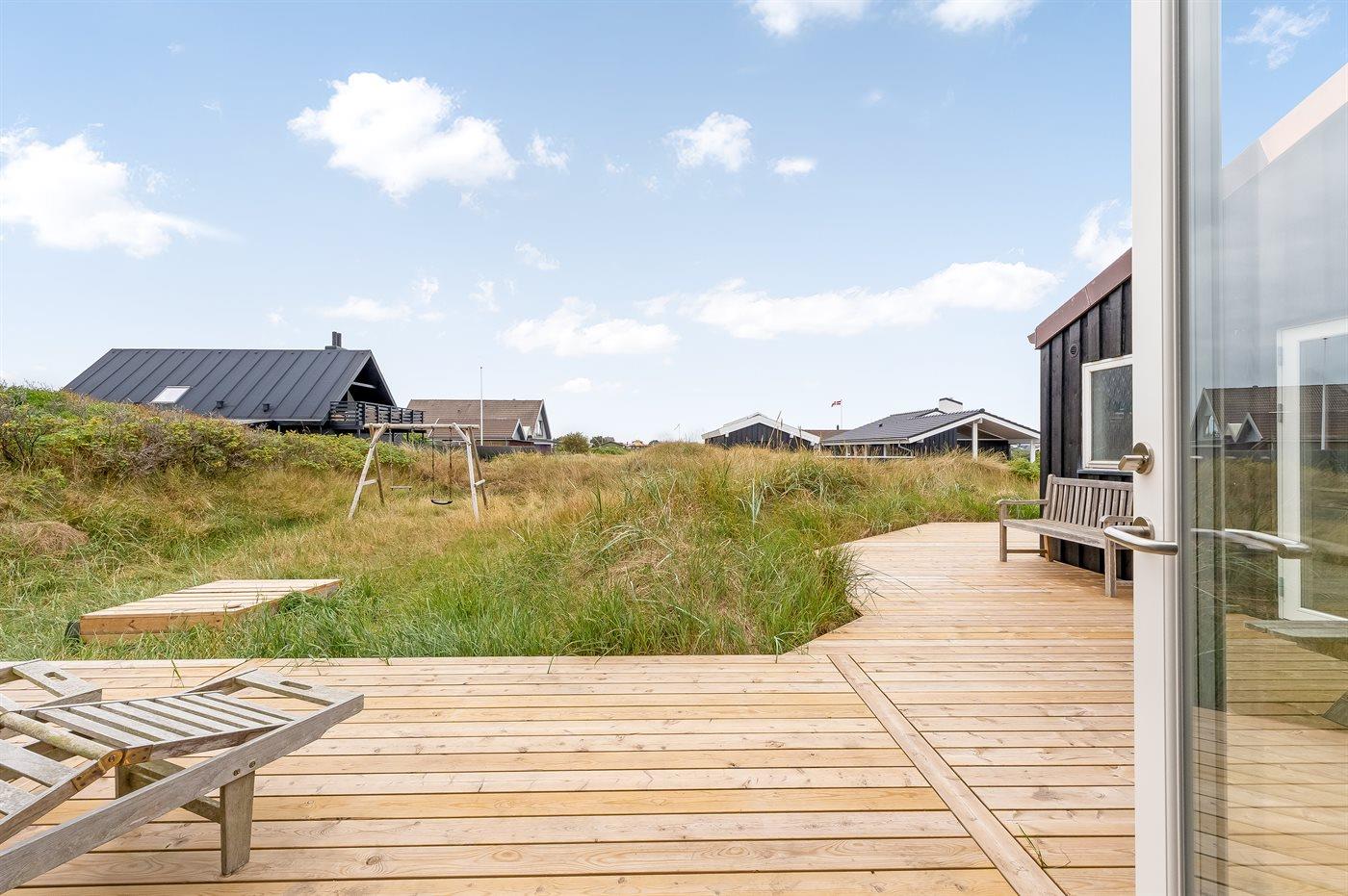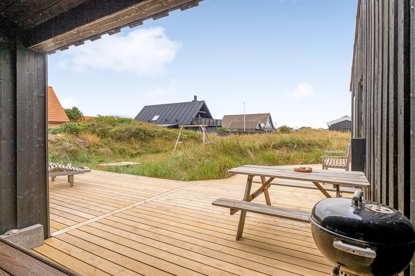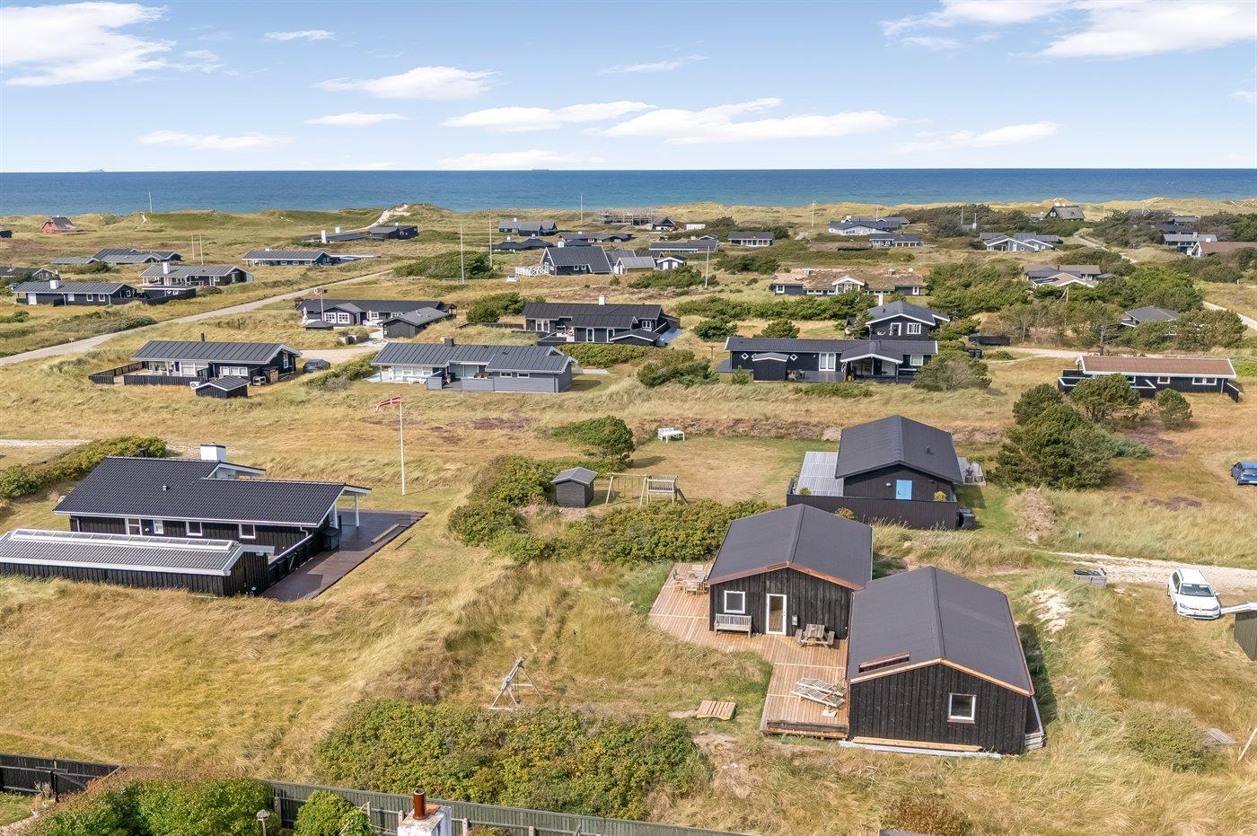 Ferieboligen er beliggende på en 900 m² stor naturgrund. Der er 400 m til havet. Nærmeste forretning er beliggende i en afstand af 400 m. Til ferieboligen hører åbent og 10 m2 overdækket terrasseareal. Gynge. Sandkasse. Der ligger en legeplads i en afstand af 300 m. Udendørs bruser. Der er installeret stik til opladning af elbil. Parkering ved ferieboligen.