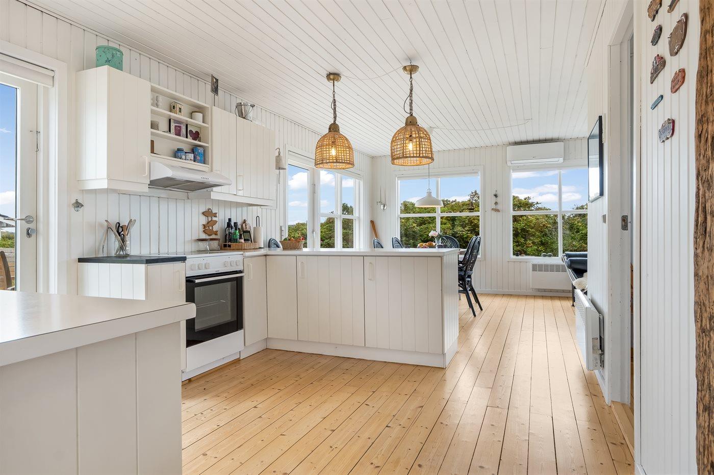 Køkkenet er udstyret med 1 køleskab. Der er 4 keramiske kogeplader, varmluftovn samt opvaskemaskine.