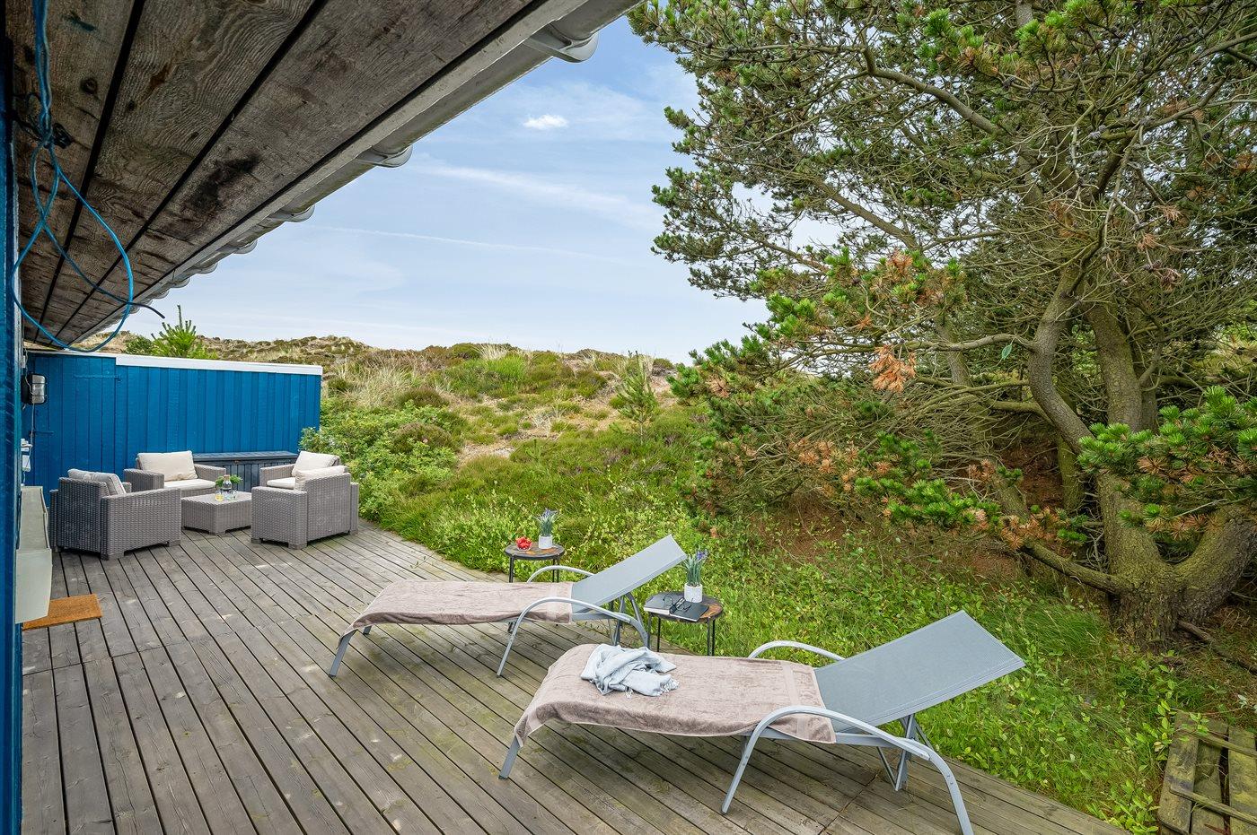 Hyggeligt feriehus i klitterne med overdækket terrasse og naturgrund nær havet.