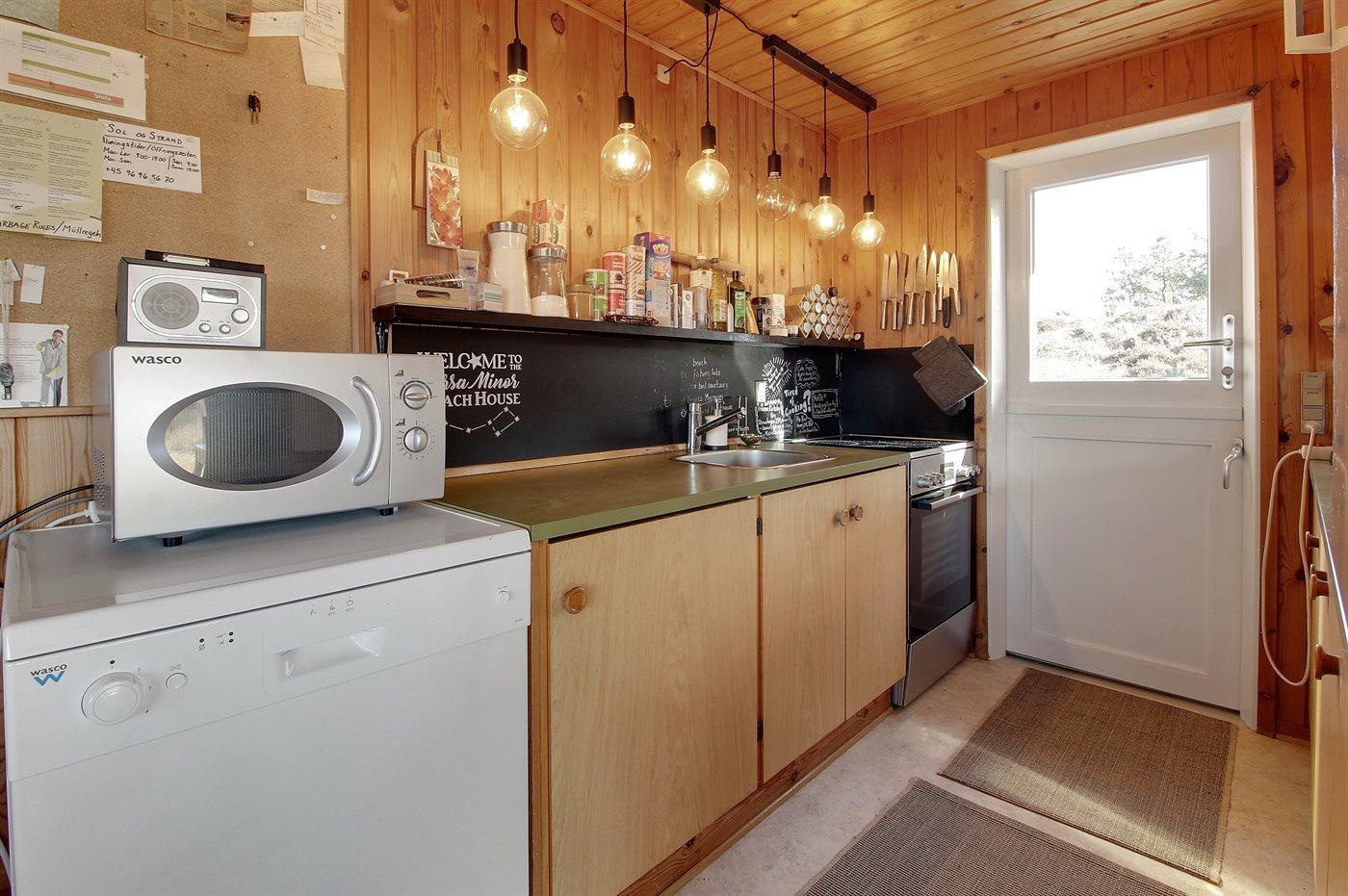 Køkkenet er udstyret med 1 køleskab. Der er 4 elkogeplader, bageovn, mikrobølgeovn samt opvaskemaskine.