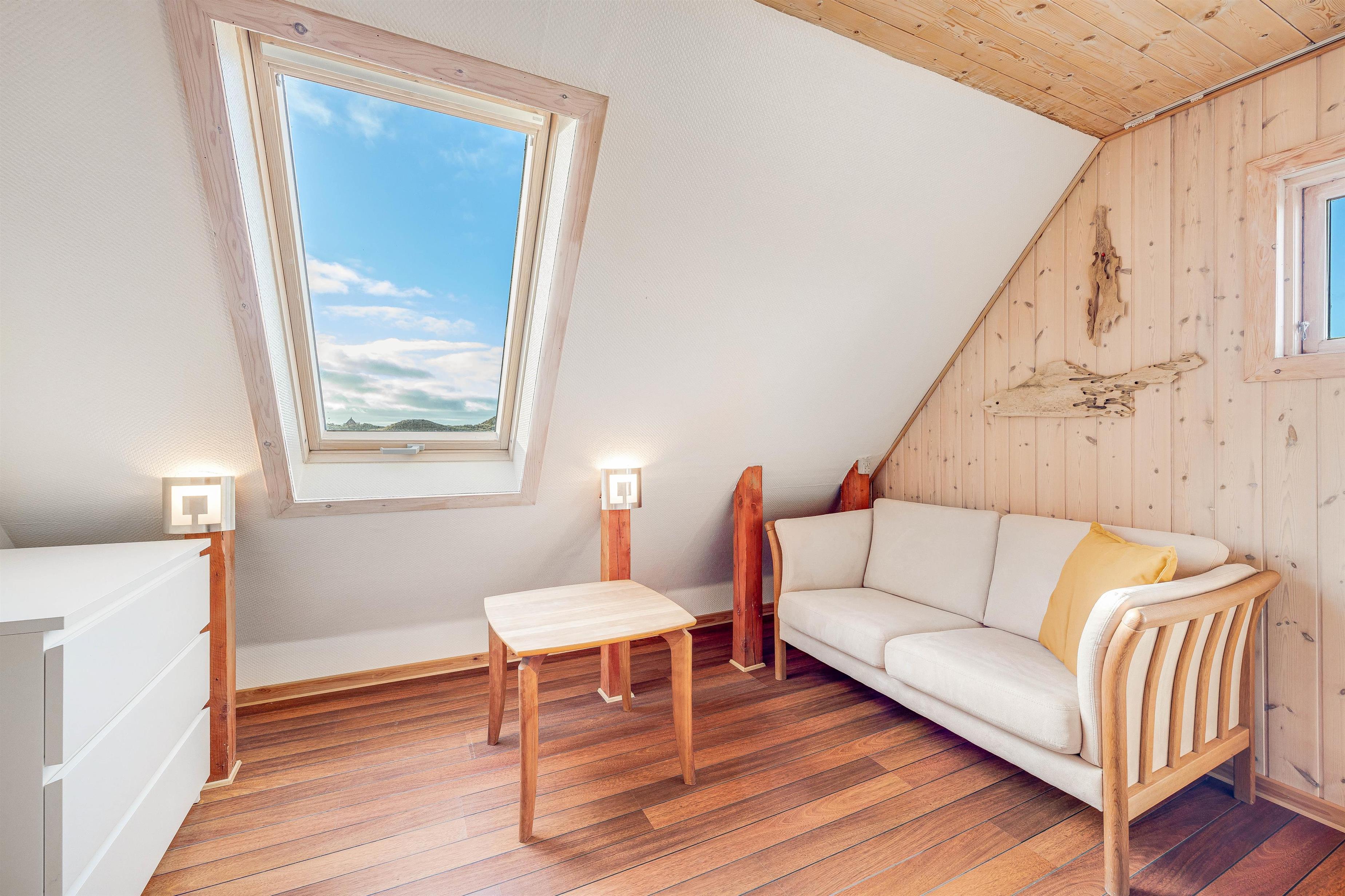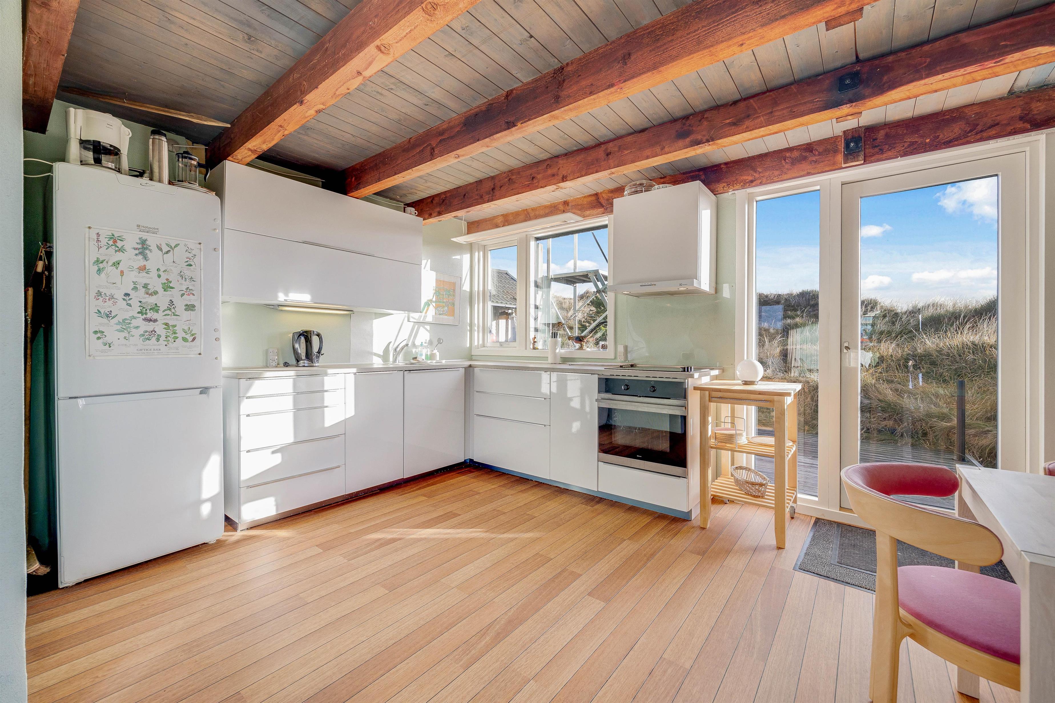 I feriehusets stueplan finder du et badeværelse og et kombineret køkkenalrum og stue. Køkkenet er udstyret med opvaskemaskine, så du ikke skal bruge din kostbare ferietid på at vaske op i hånden. Fra de store vinduespartier i køkken og stue har du en fantastisk udsigt til klitterne, som er din nærmeste nabo. På førstesalen finder du feriehusets soveværelse.
