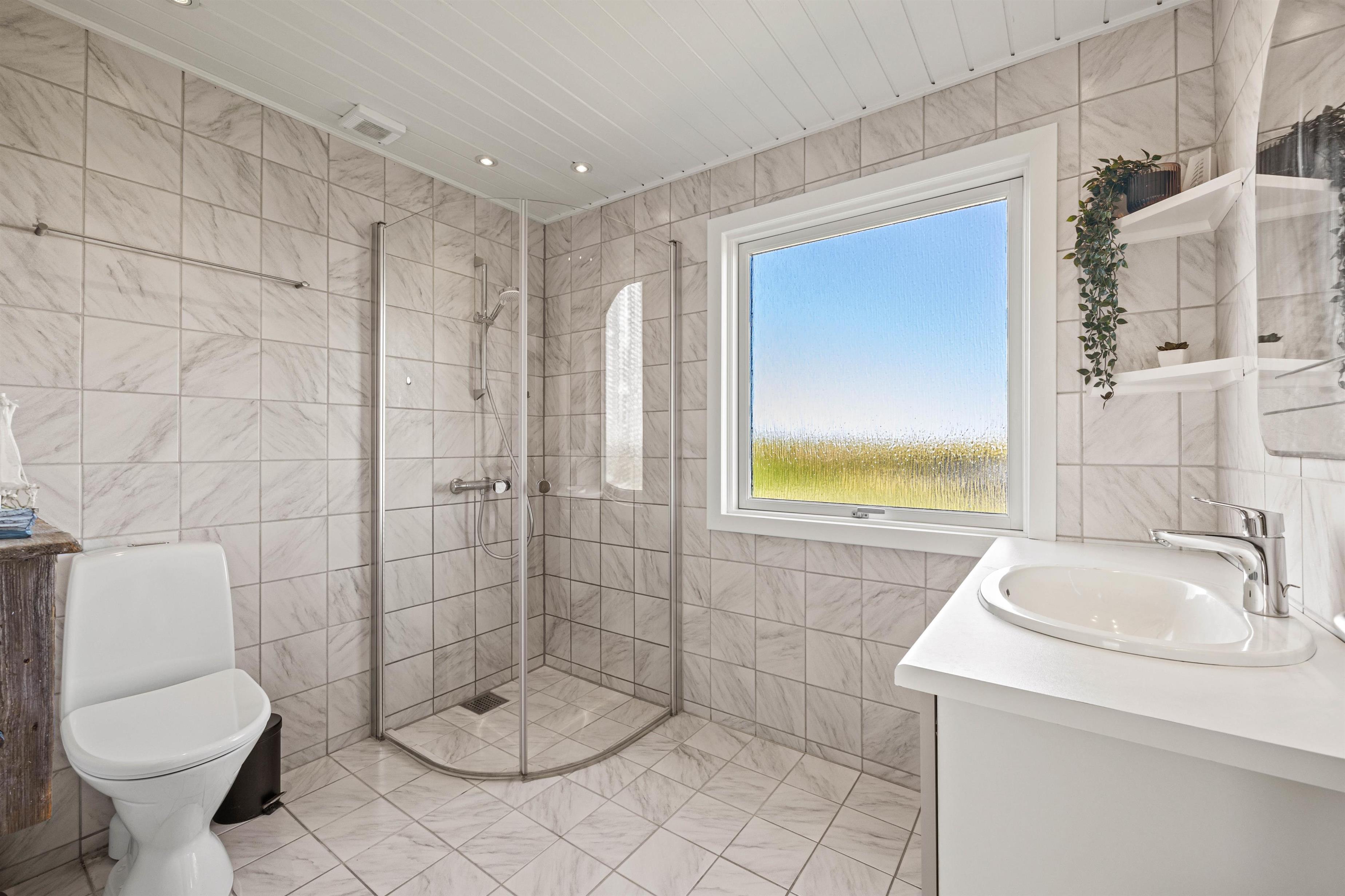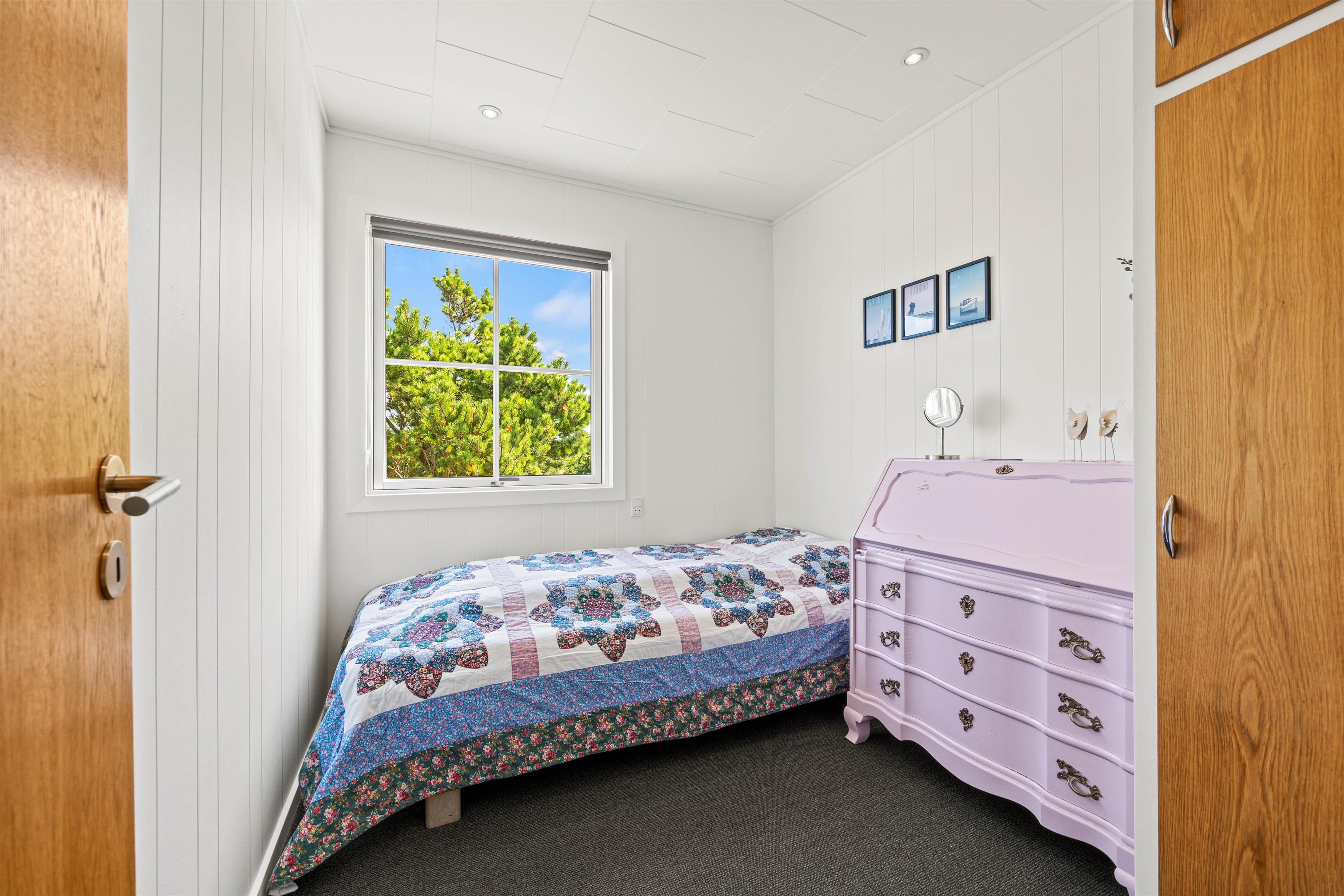 Badeværelset med gulvvarme har dagslys og bruser. Derudover står en vaskemaskine til rådighed i sommerhuset, så I kan opfriske garderoben i løbet af ferien. De rummelige soveværelser har 5 komfortable sengepladser: 1 soveværelse med dobbeltseng, 1 soveværelse med 2 enkeltsenge og det sidste soveværelse med 1 enkeltseng. Så kan I fordele værelserne, som det passer jer bedst-