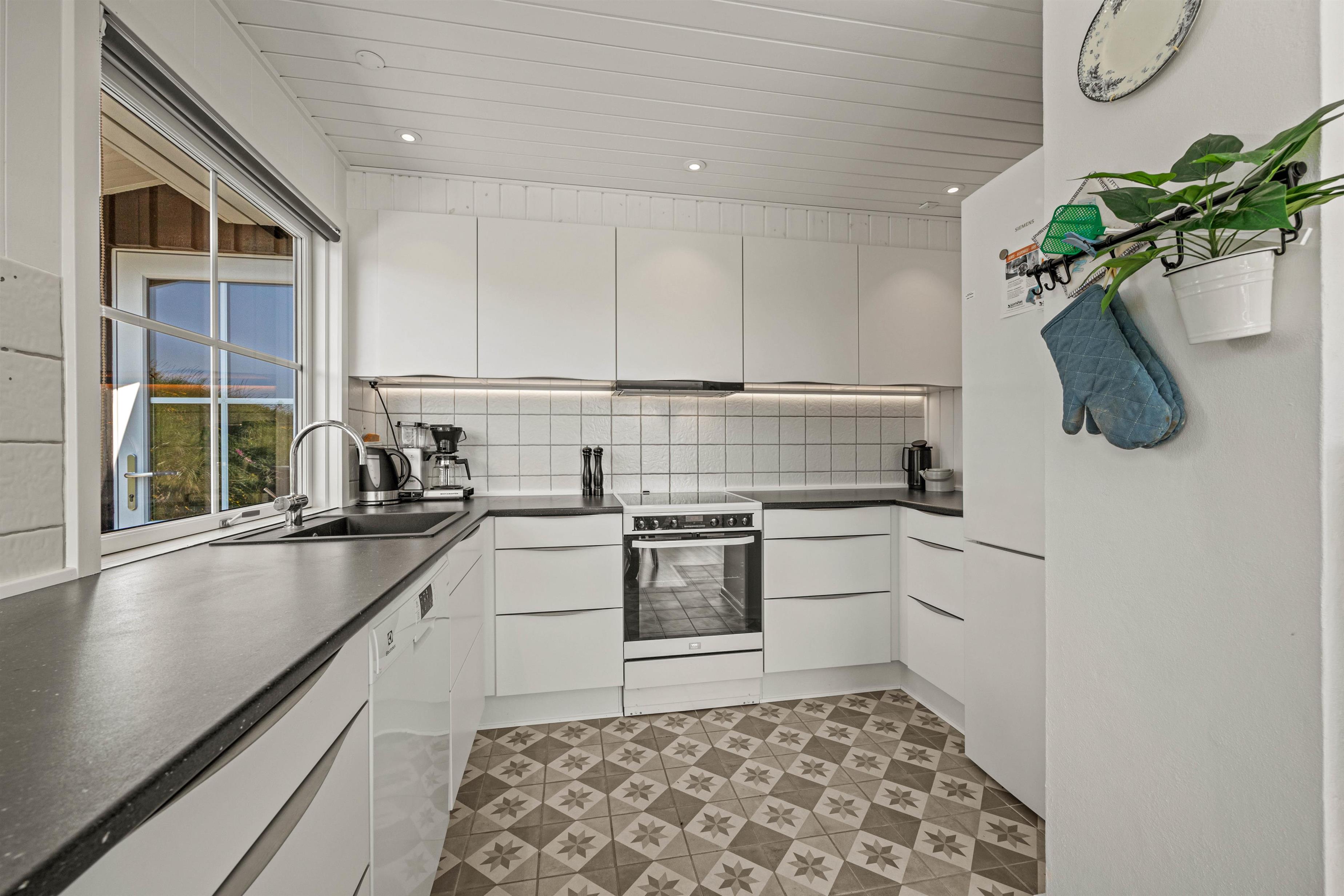Det fuldt udstyrede, åbne køkken har blandt andet opvaskemaskine og en 80 liter store separat fryser, som især lystfiskere vil sætte pris på. Her er plads nok til en fisk eller to.
