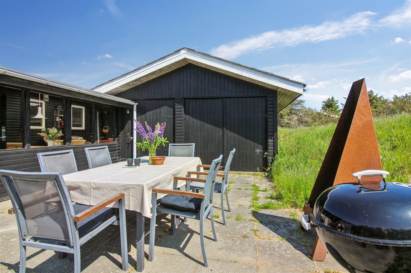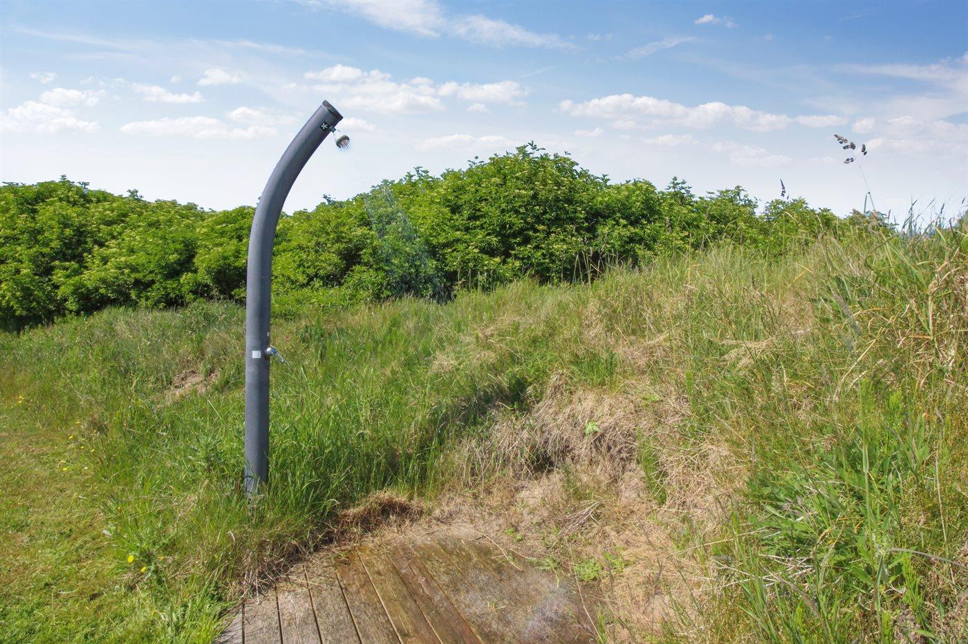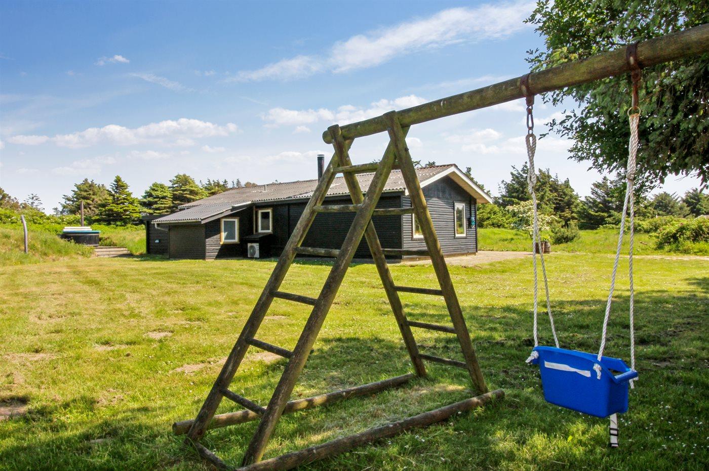 Ferieboligen er beliggende på en 3500 m² stor naturgrund. Der er 300 m til havet. Nærmeste forretning er beliggende i en afstand af 1000 m. Til ferieboligen hører 135 m² terrasseareal. Ligeledes er der adgang til udestue. Der er redskabsrum. Gynge. Bålsted. Udendørs bruser. Der er installeret stik til opladning af elbil. Parkering ved ferieboligen.