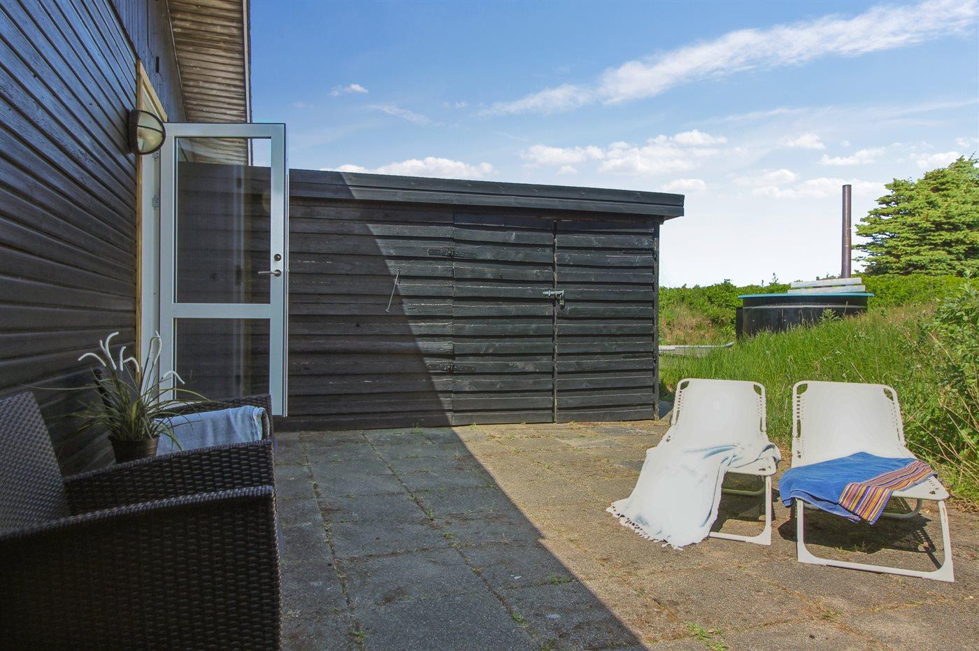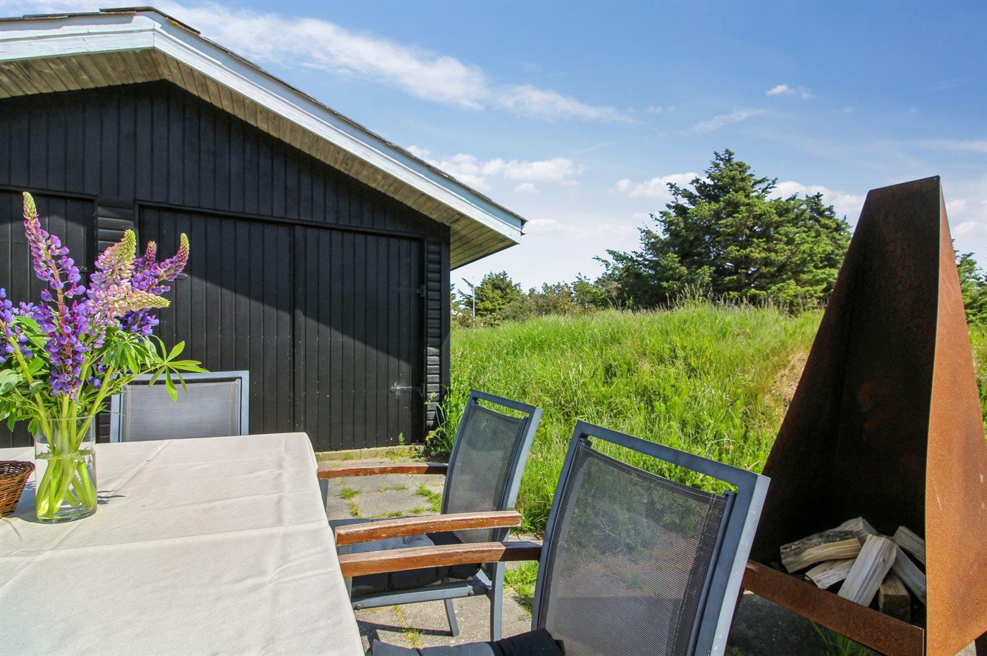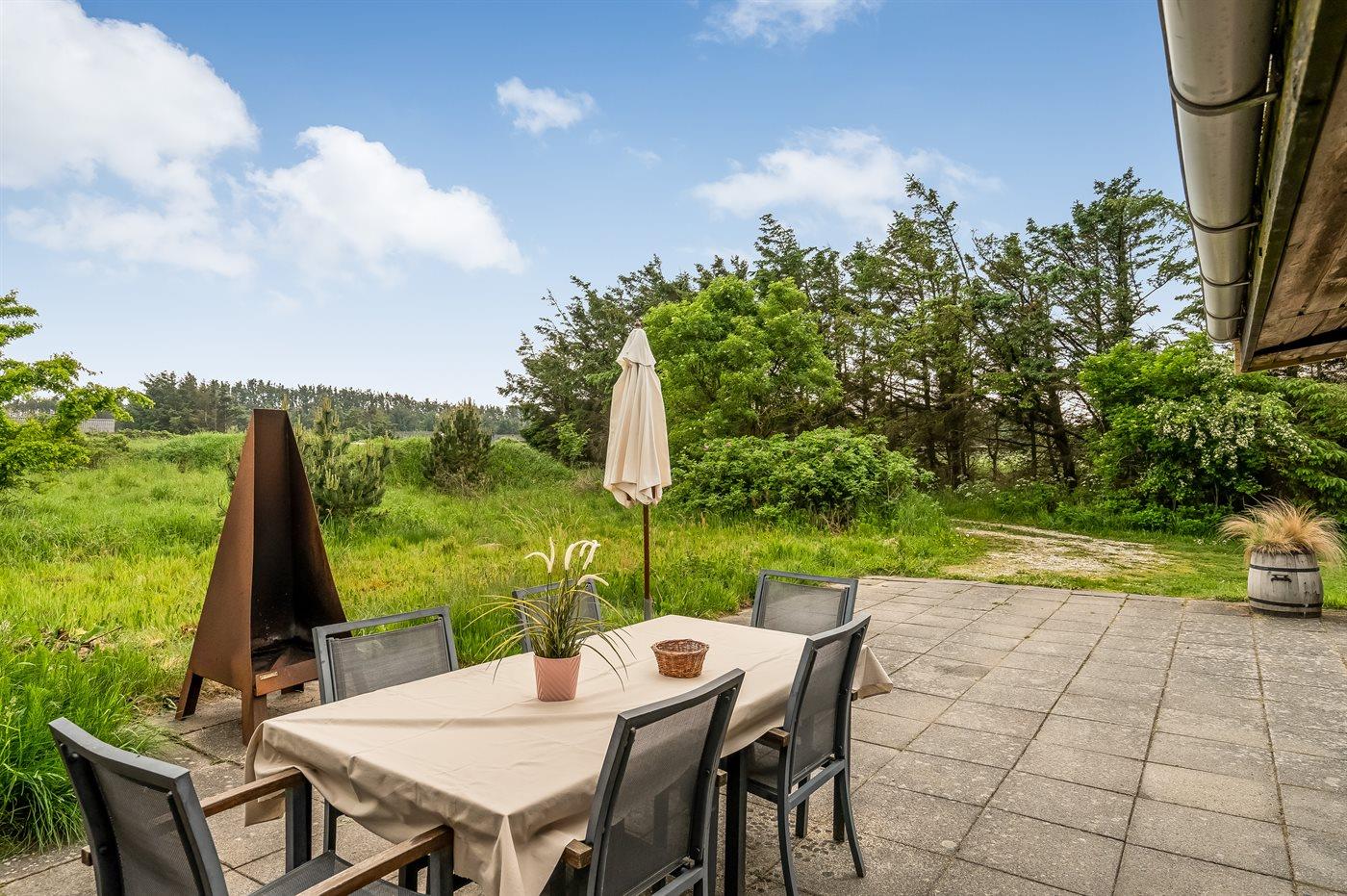 Ferieboligen er beliggende på en 3500 m² stor naturgrund. Der er 300 m til havet. Nærmeste forretning er beliggende i en afstand af 1000 m. Til ferieboligen hører 135 m² terrasseareal. Ligeledes er der adgang til udestue. Der er redskabsrum. Gynge. Bålsted. Udendørs bruser. Der er installeret stik til opladning af elbil. Parkering ved ferieboligen.