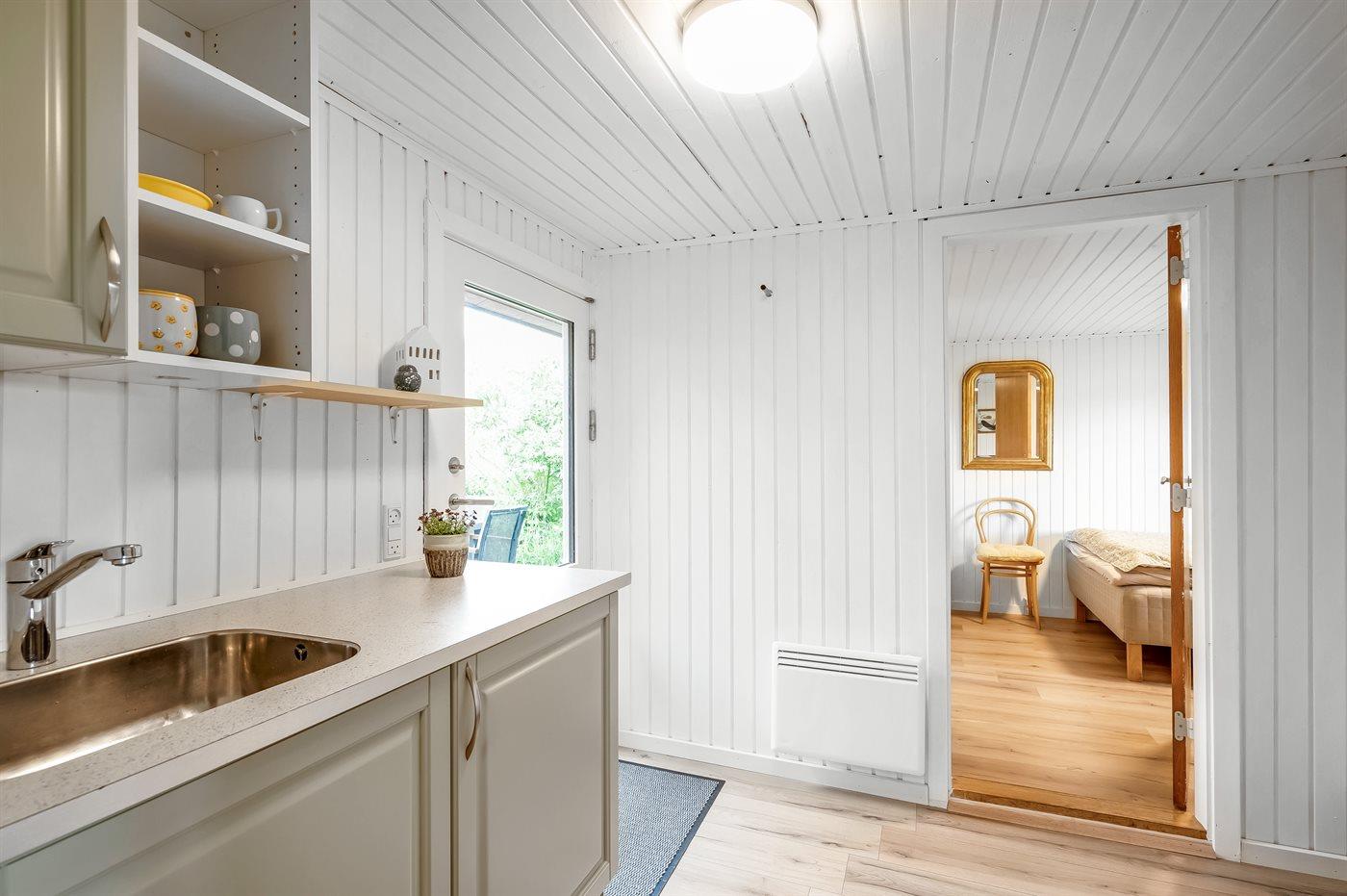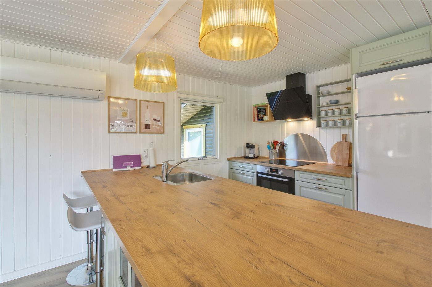 Køkkenet er udstyret med 1 køleskab. Der er 4 induktionskogeplader, varmluftovn, mikrobølgeovn samt opvaskemaskine.