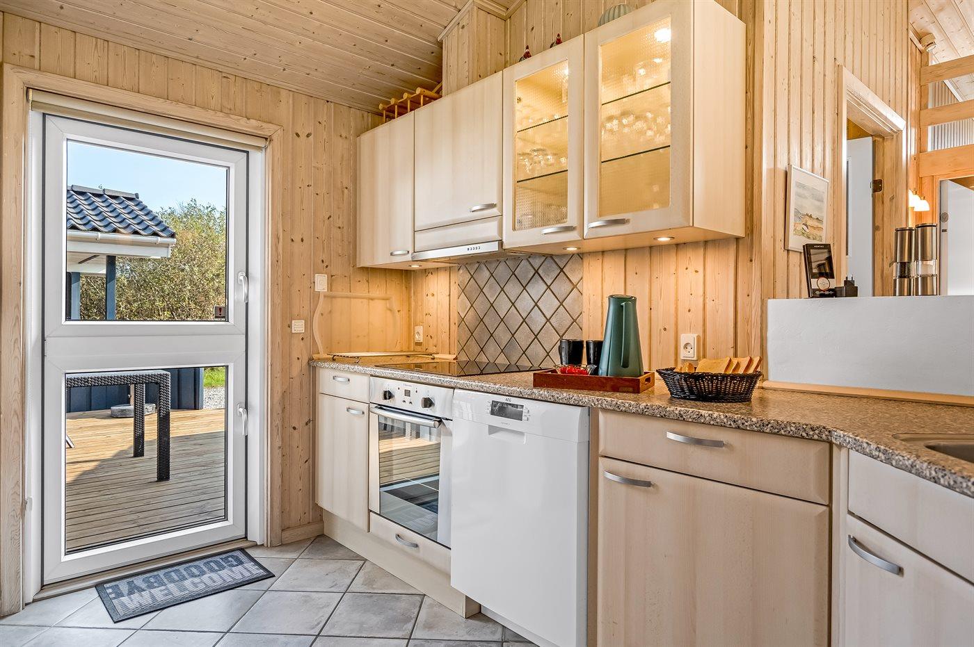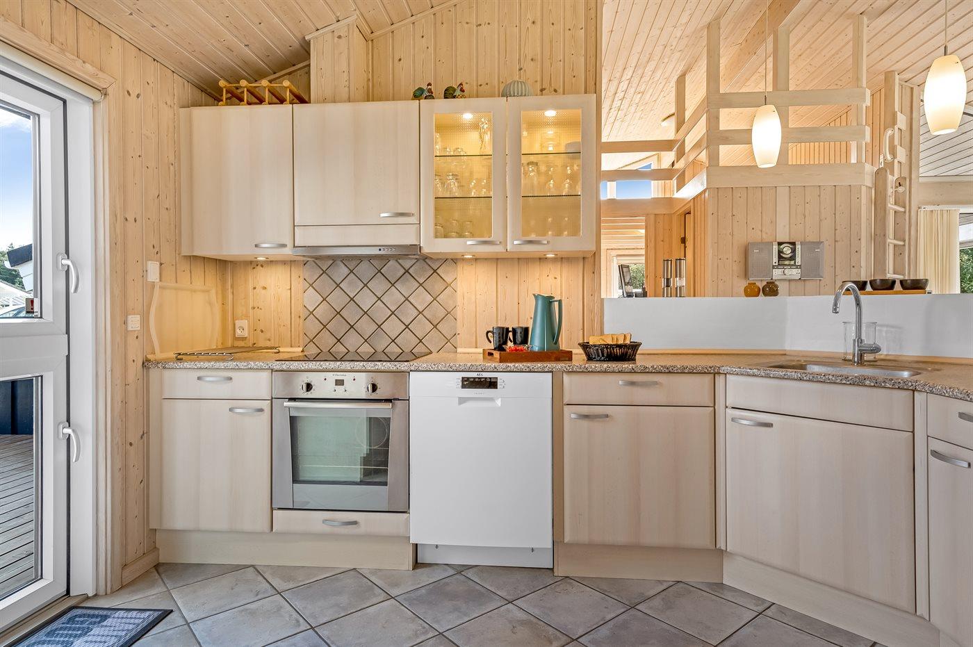 Køkkenet er udstyret med 1 køleskab. Der er 4 keramiske kogeplader, varmluftovn, mikrobølgeovn samt opvaskemaskine.