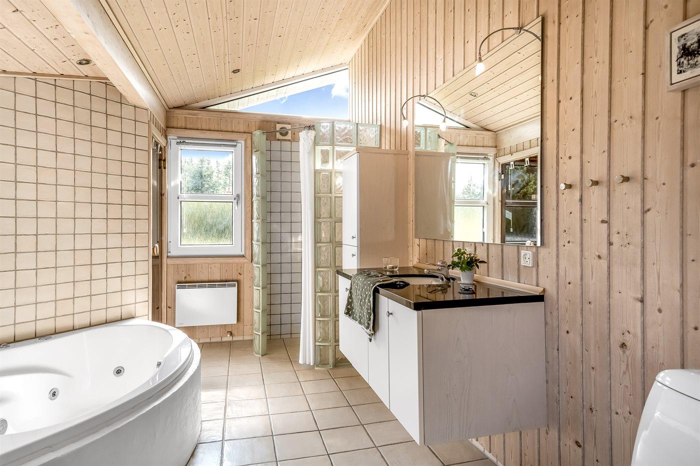 Der er 1 badeværelse med bruseniche og 2 toiletter, heraf 1 gæstetoilet. Der er gulvvarme på 1 badeværelse. I saunaen er der mulighed for afslapning.