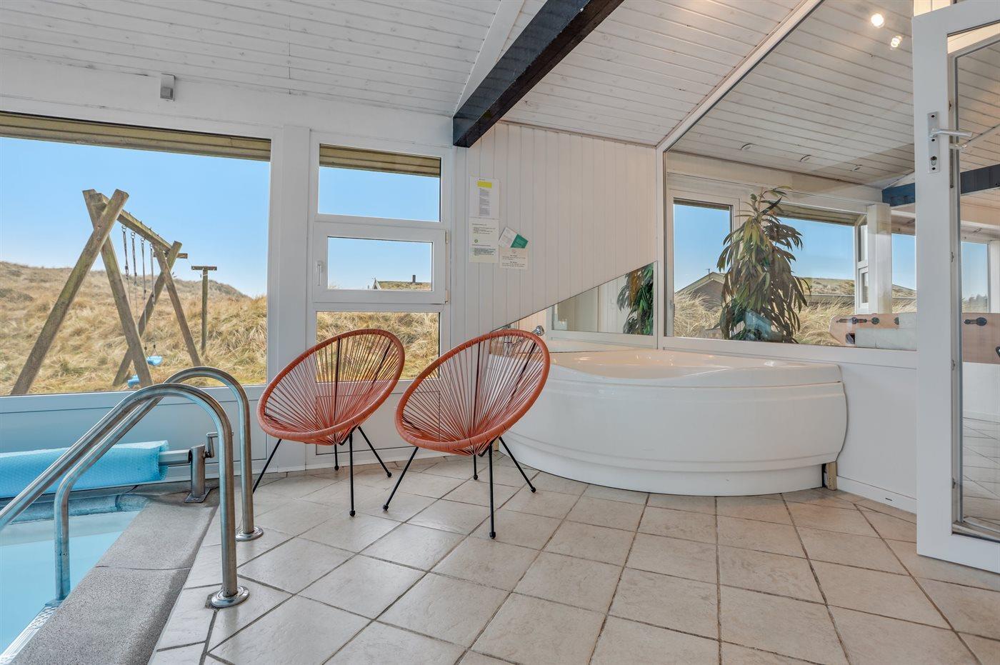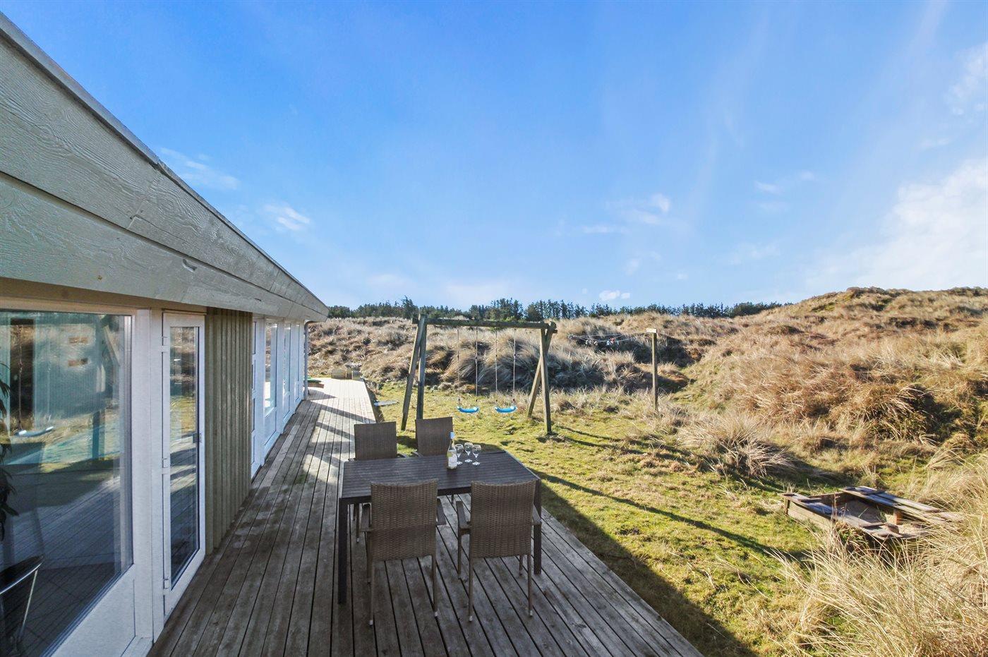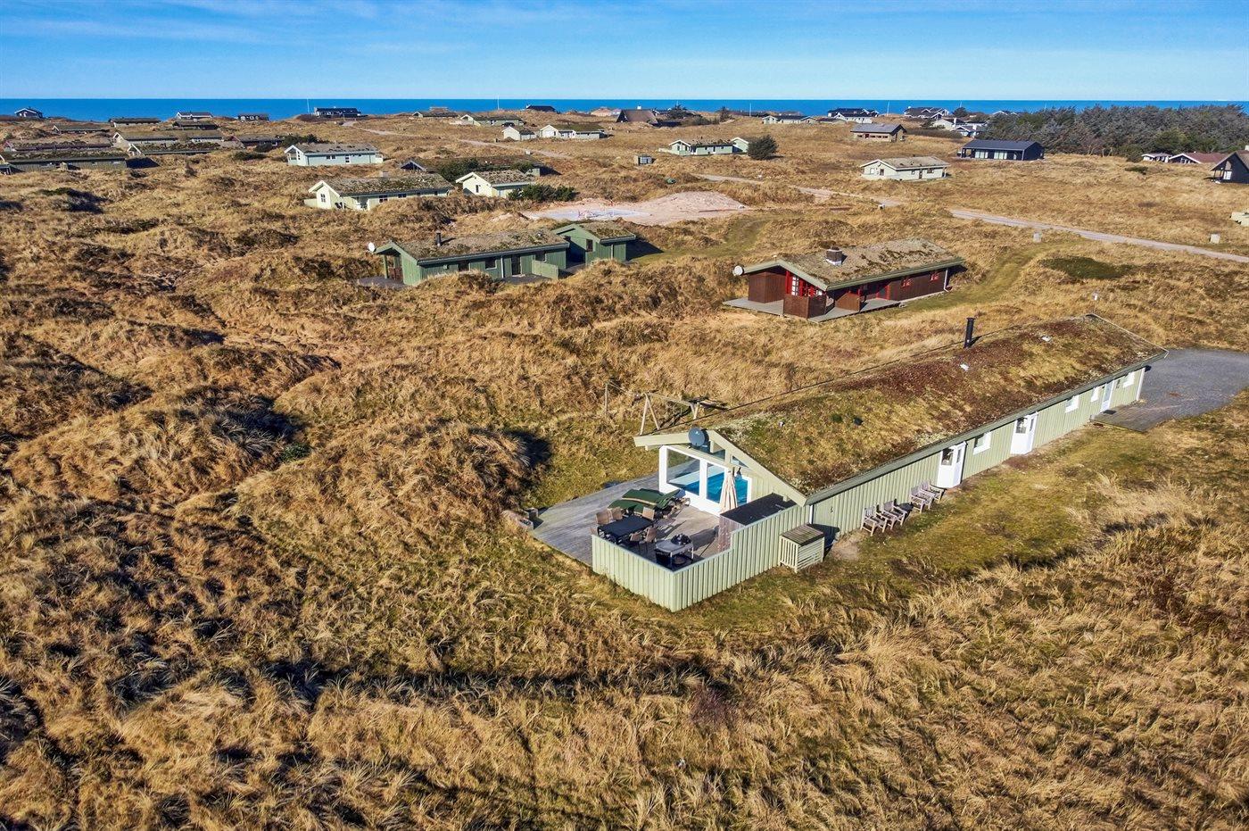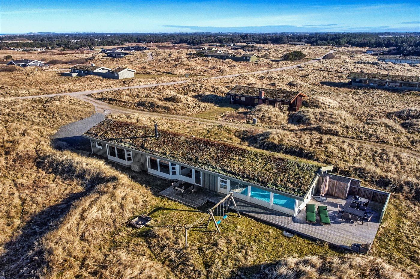 Dejligt sommerhus i Løkken med indendørs pool, spa, sauna og stor terrasse på kuperet naturgrund.