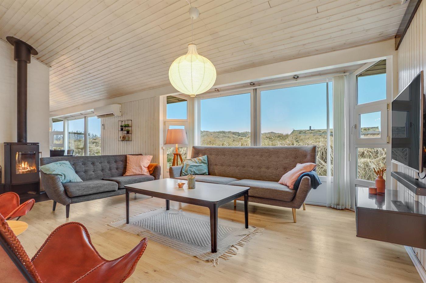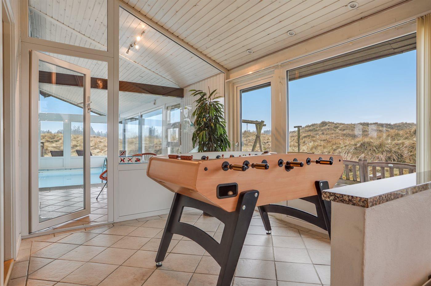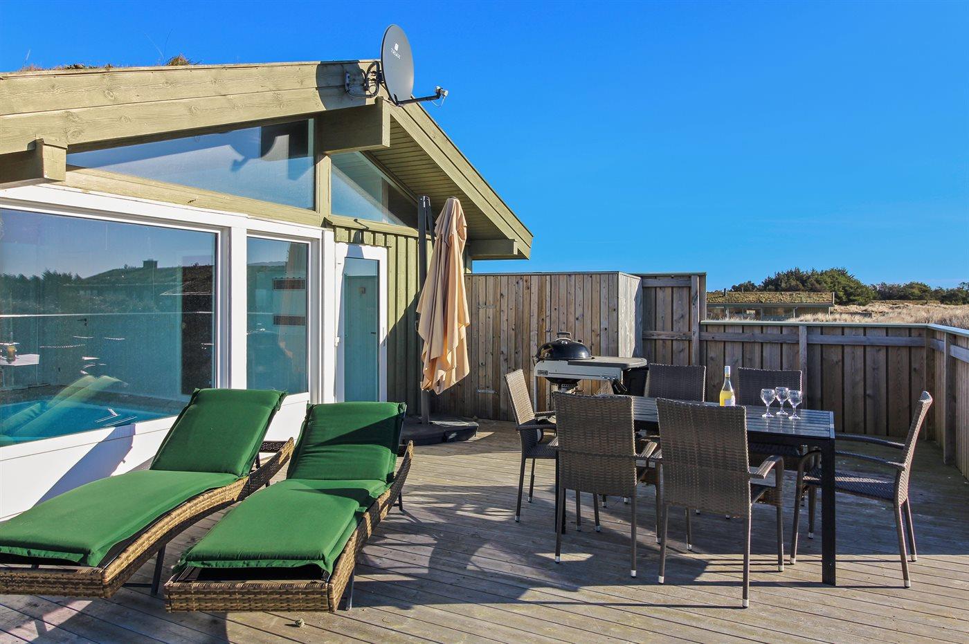 Dejligt sommerhus i Løkken med indendørs pool, spa, sauna og stor terrasse på kuperet naturgrund.