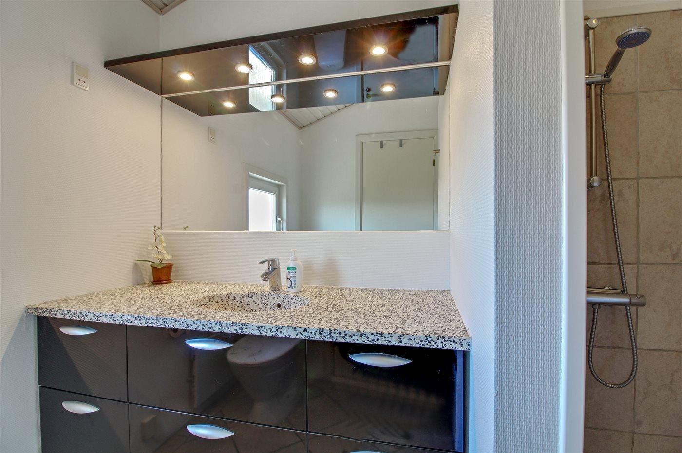 Der er 2 badeværelser med bruseniche og 2 toiletter. Der er gulvvarme på 2 badeværelser. I saunaen er der mulighed for afslapning.