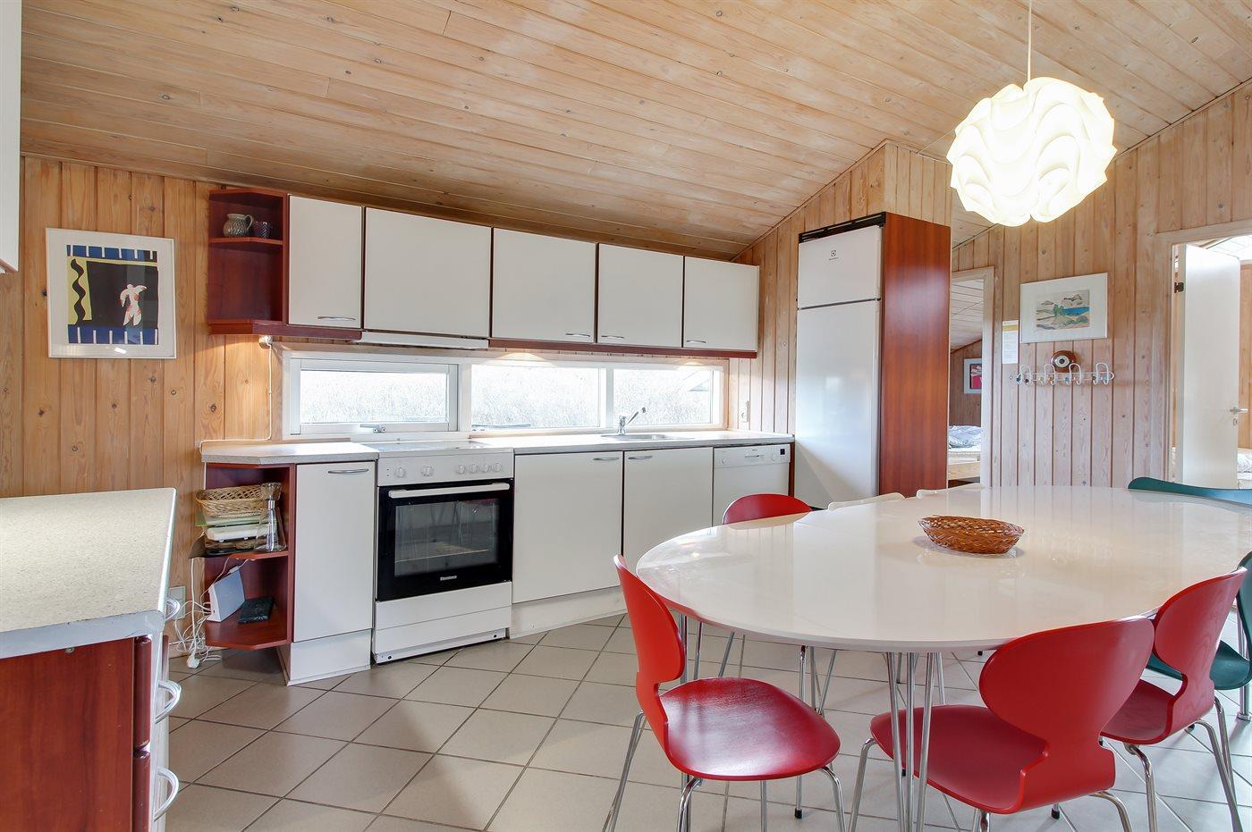 Køkkenet er udstyret med 1 køleskab. Der er 4 keramiske kogeplader, varmluftovn, mikrobølgeovn samt opvaskemaskine.