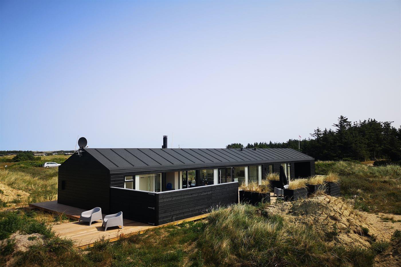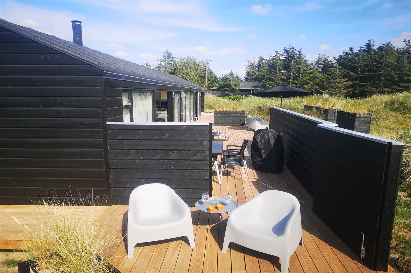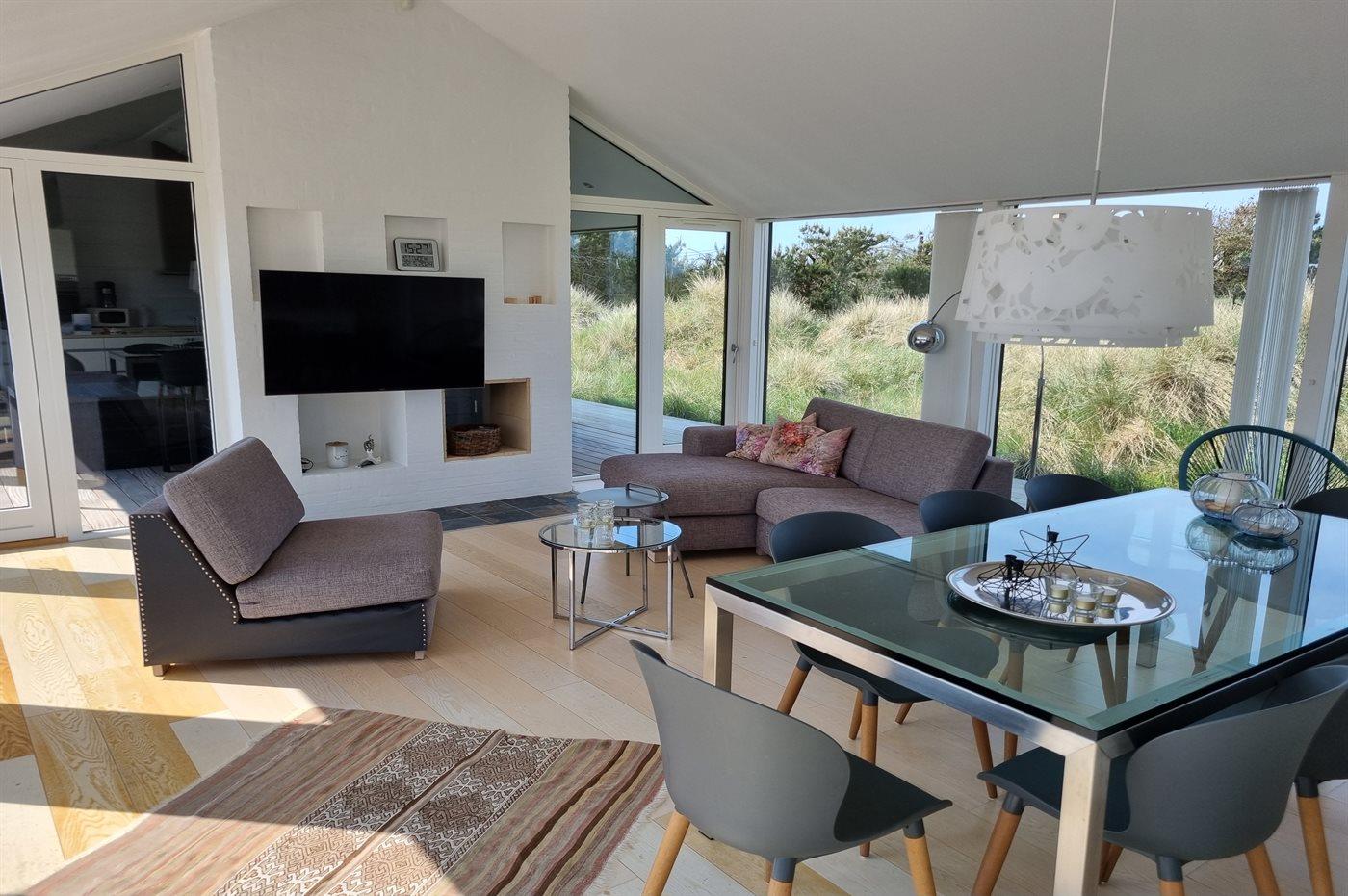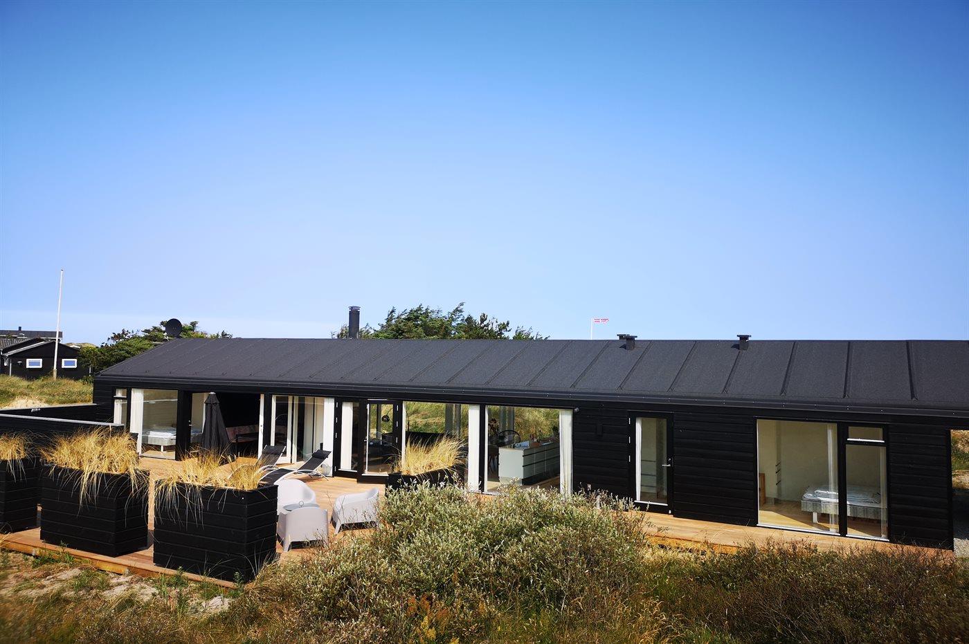 På en stor, kuperet klitgrund ligger dette flotte sommerhus med en fantastisk udsigt over grunden. De mange vinduer fra gulv til loft gør, at man føler sig i et med den smukke natur, der omgiver huset. I forlængelse af huset, via en overdækket terrasse, er der adgang til et anneks, hvor 2 af sovepladserne befinder sig.