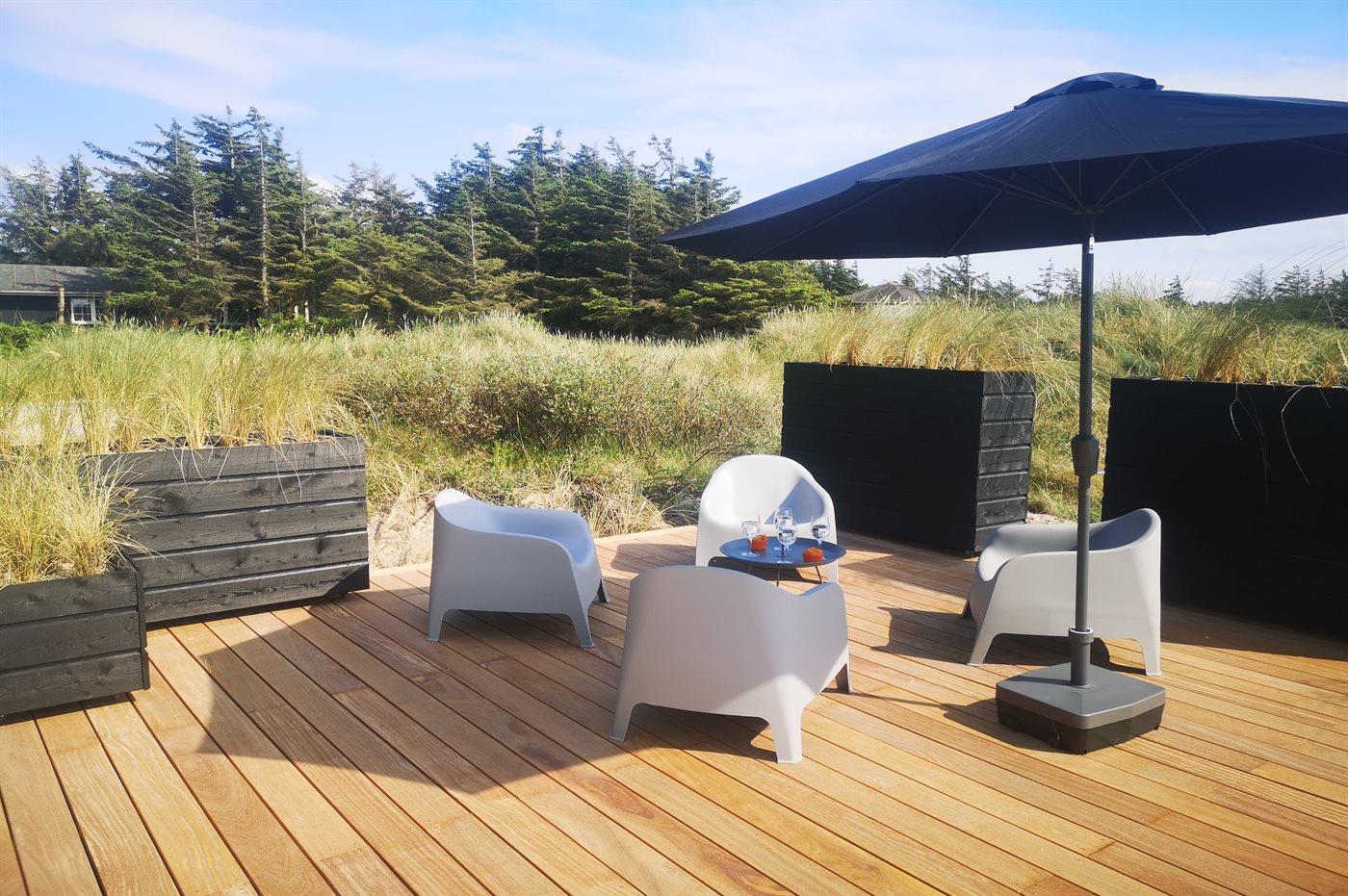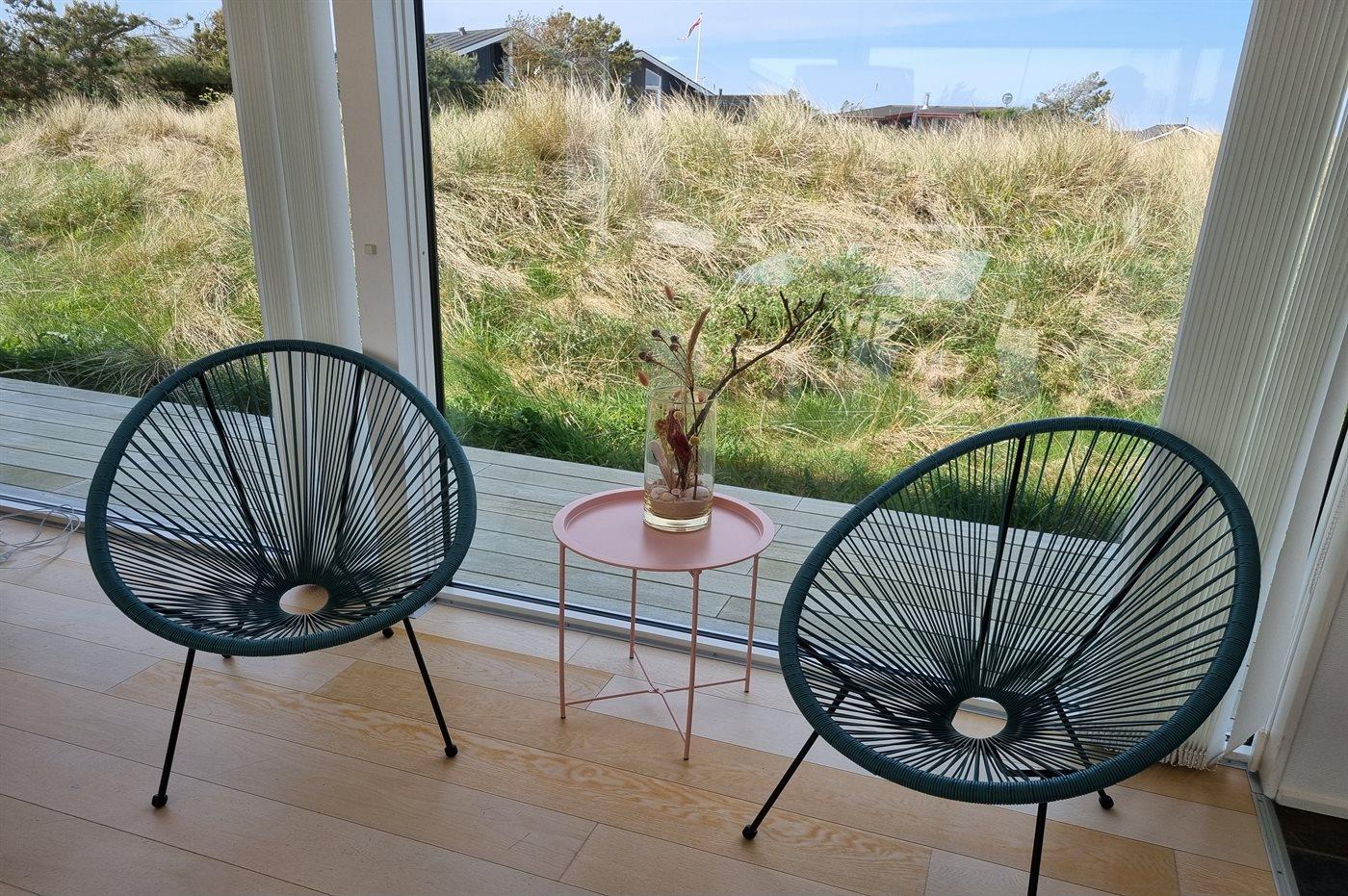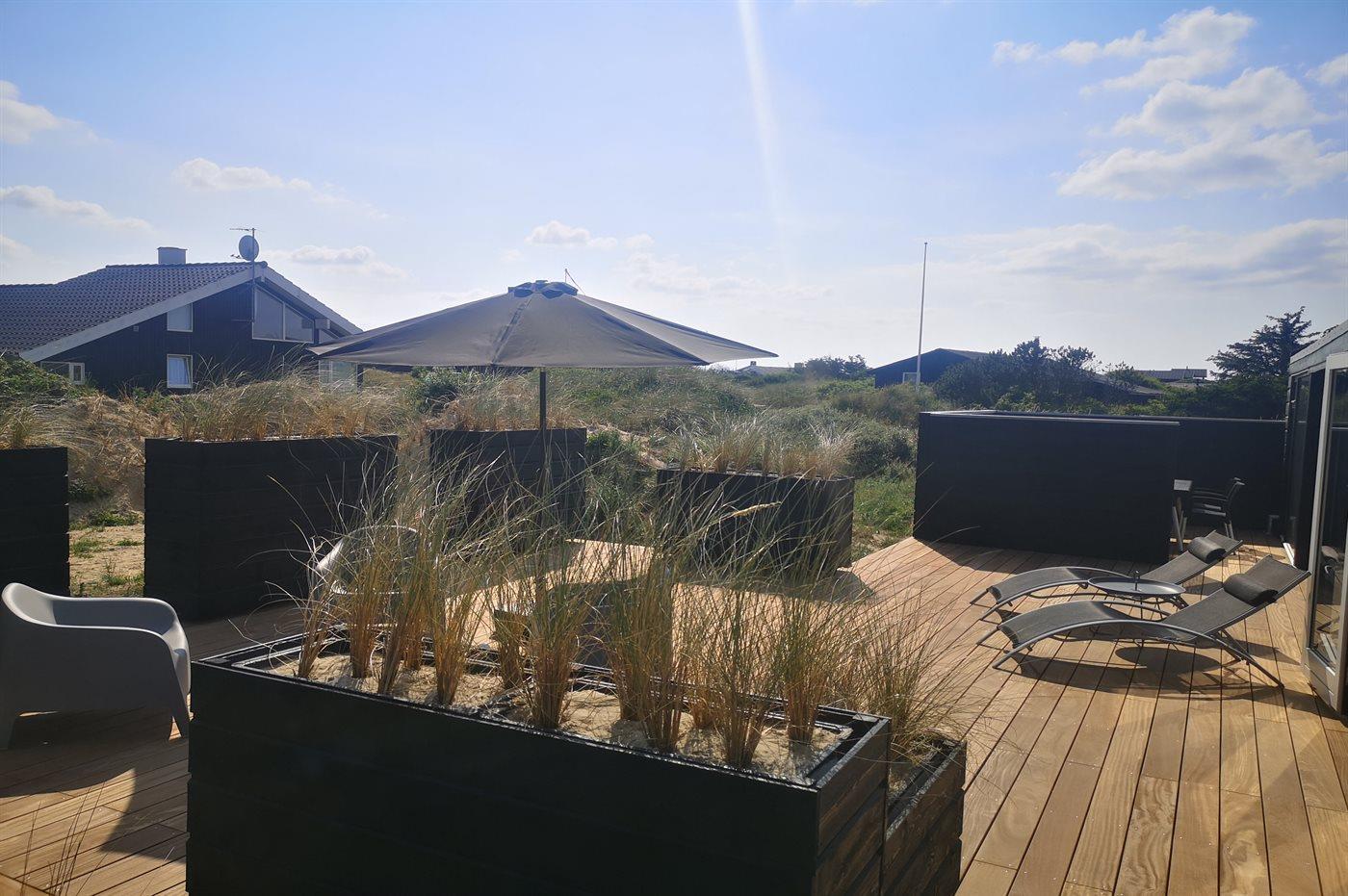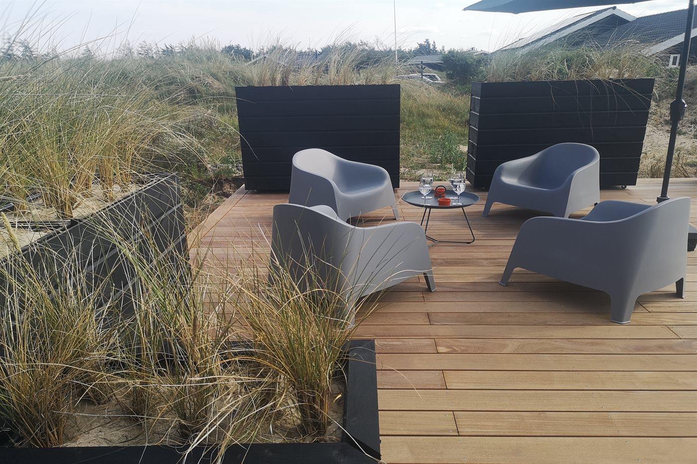 På en stor, kuperet klitgrund ligger dette flotte sommerhus med en fantastisk udsigt over grunden. De mange vinduer fra gulv til loft gør, at man føler sig i et med den smukke natur, der omgiver huset. I forlængelse af huset, via en overdækket terrasse, er der adgang til et anneks, hvor 2 af sovepladserne befinder sig.