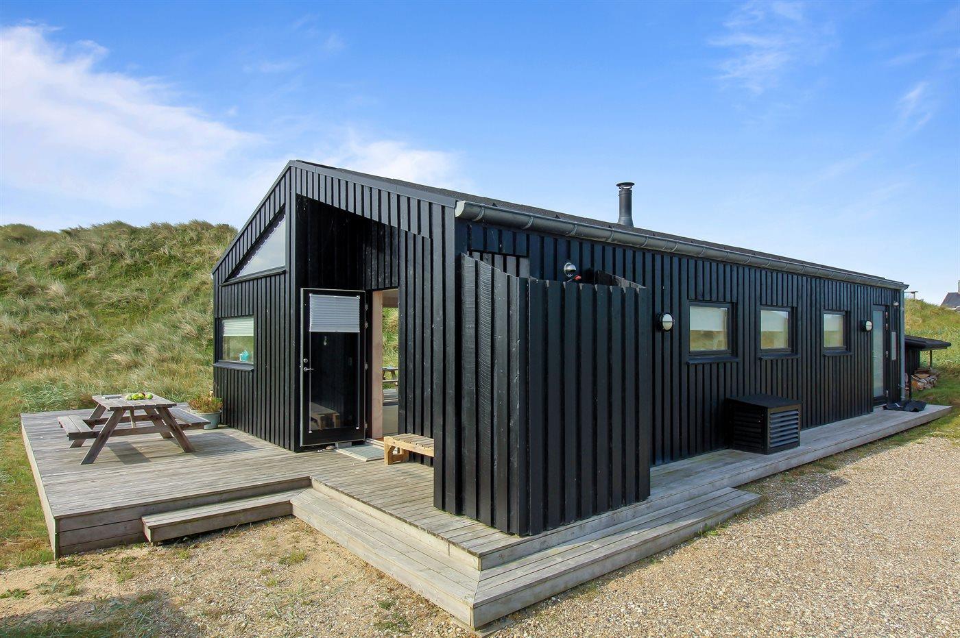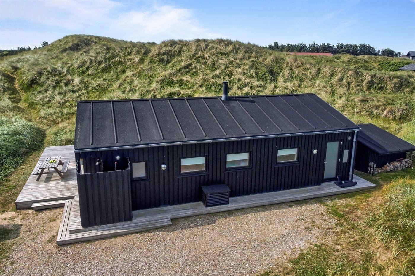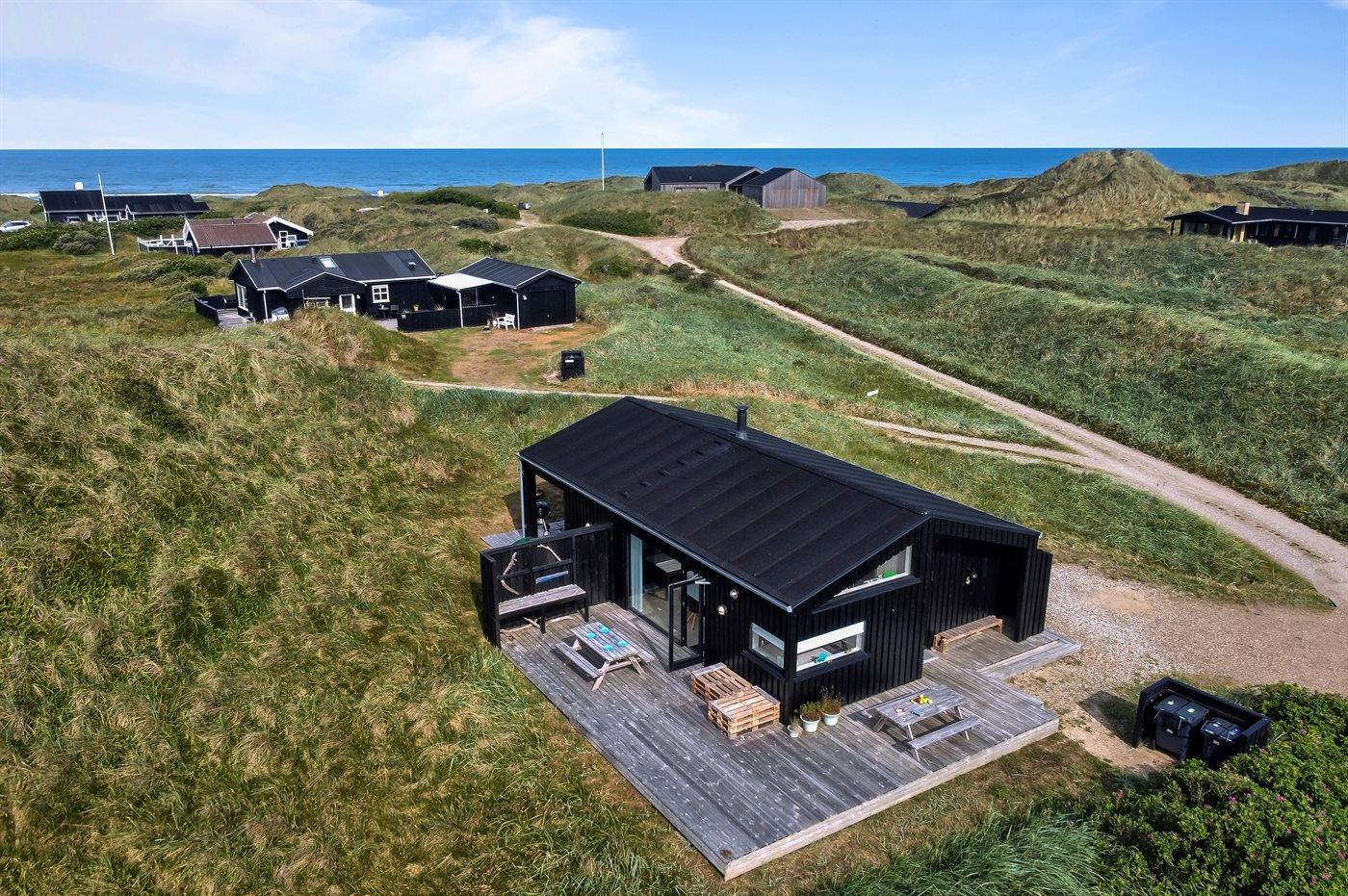 Helt nybygget sommerhus beliggende på en kuperet grund, på en lukket vej, i klitterne til Vesterhavet. På grunden står et shelter til rådighed.