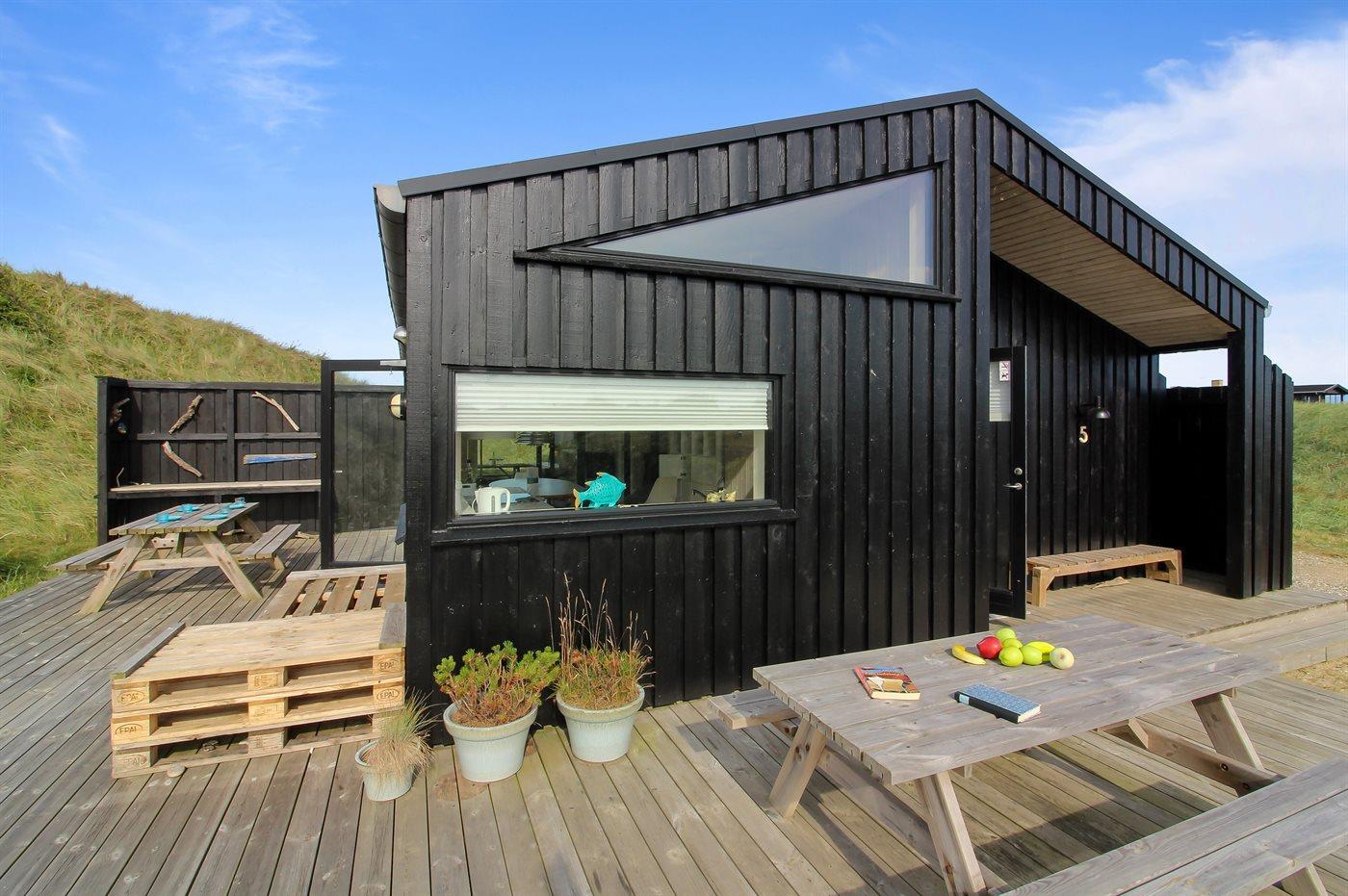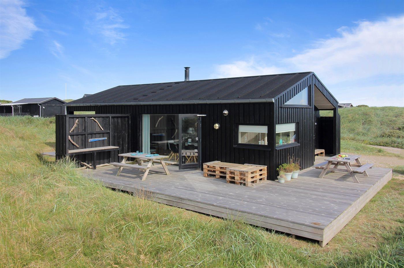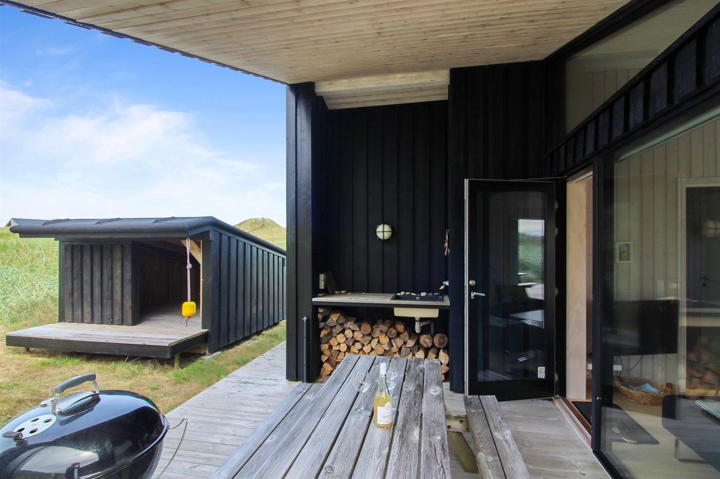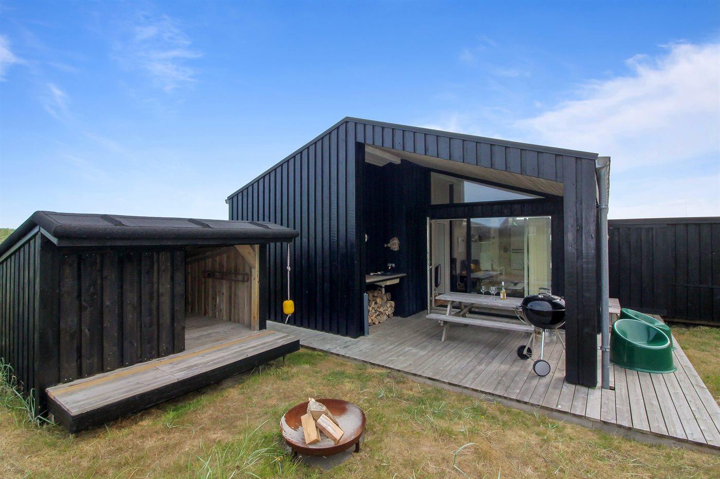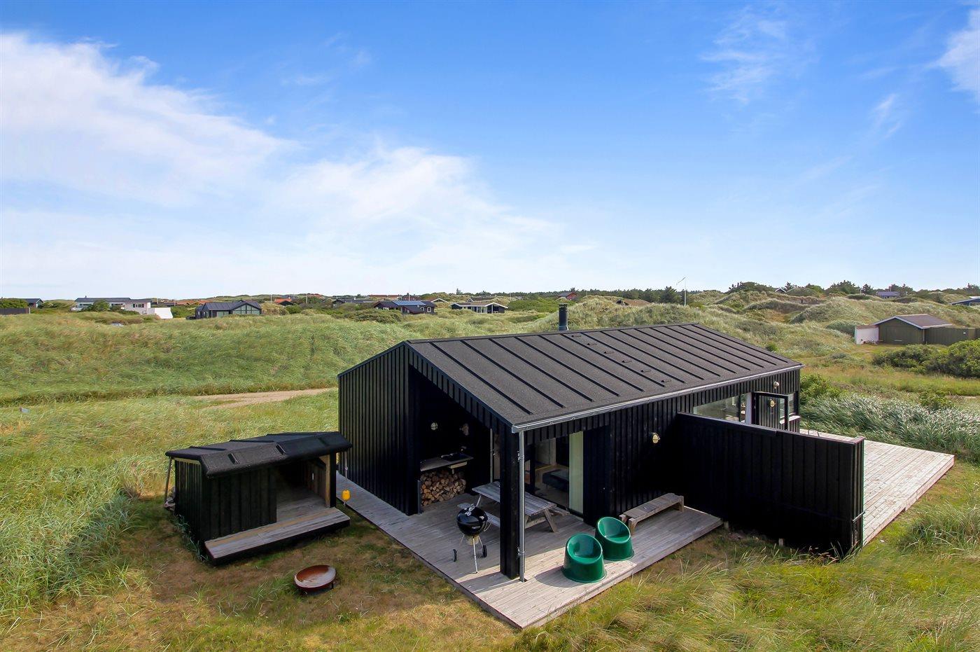 Nybygget sommerhus i klitterne ved Vesterhavet med shelter og store terrasser.