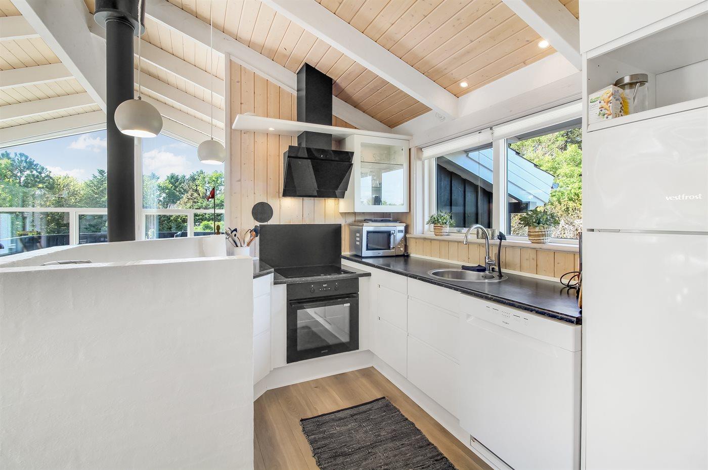 Køkkenet er udstyret med 1 køleskab. Der er 4 keramiske kogeplader, varmluftovn, mikrobølgeovn samt opvaskemaskine.