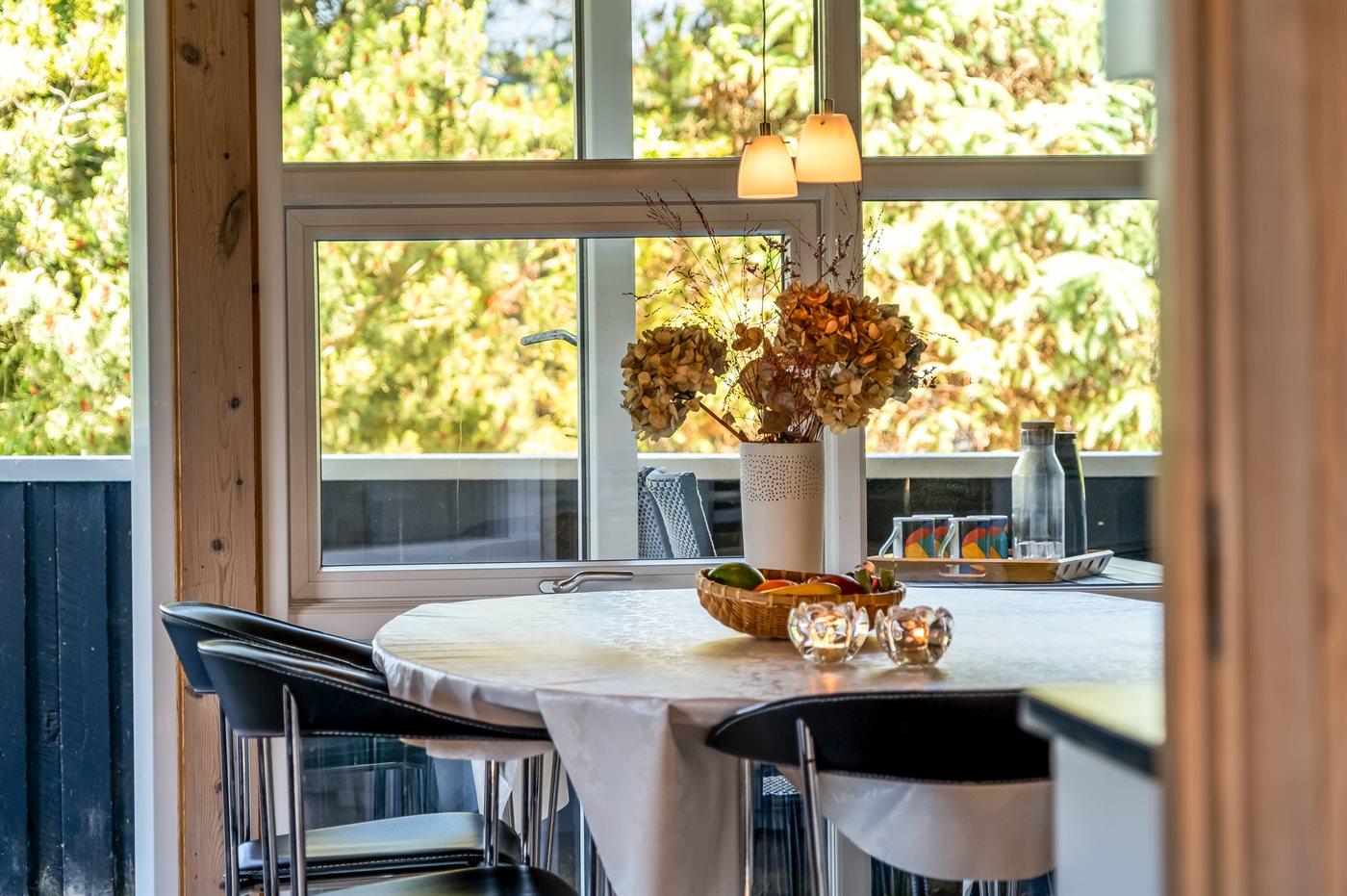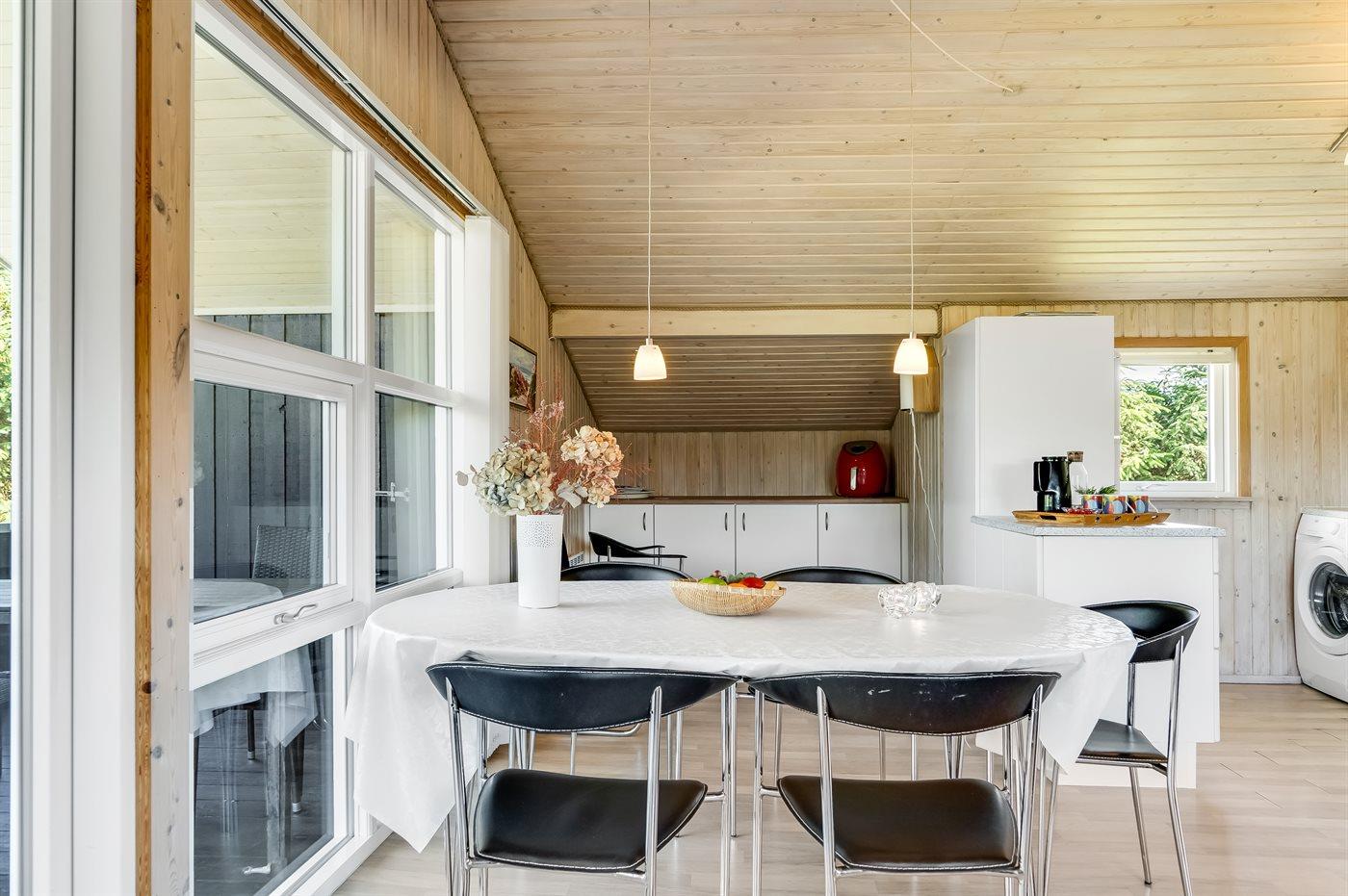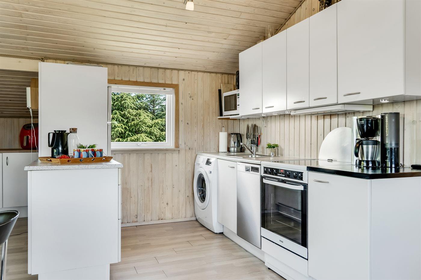 Køkkenet er udstyret med 1 køleskab. Der er 4 keramiske kogeplader, varmluftovn, mikrobølgeovn samt opvaskemaskine.