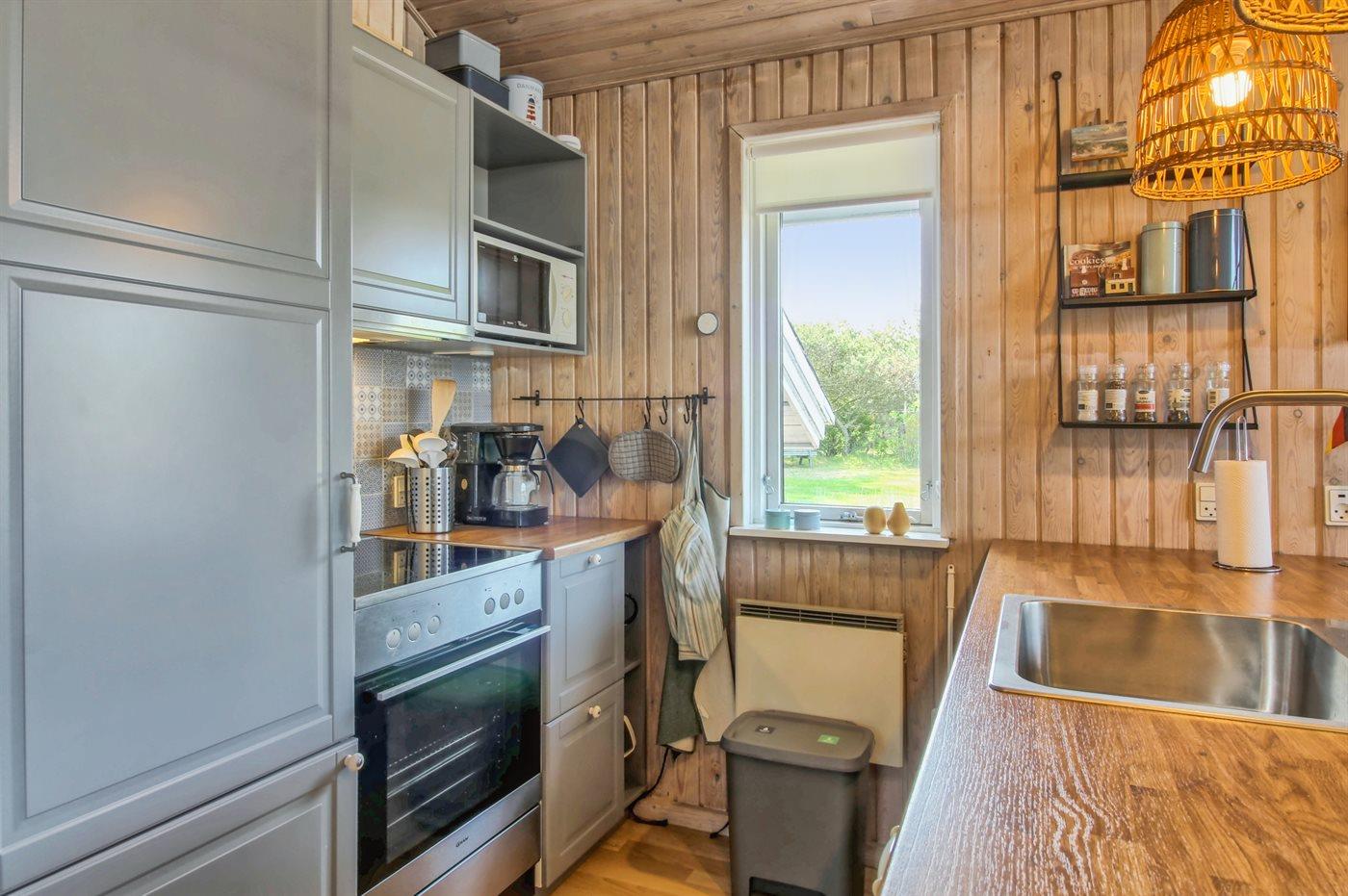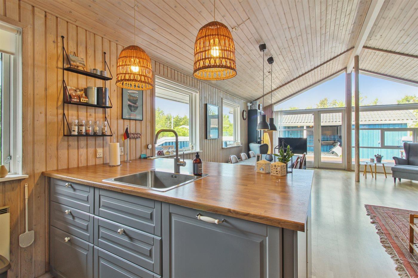 Køkkenet er udstyret med 1 køleskab. Der er 4 keramiske kogeplader, varmluftovn, mikrobølgeovn samt opvaskemaskine.
