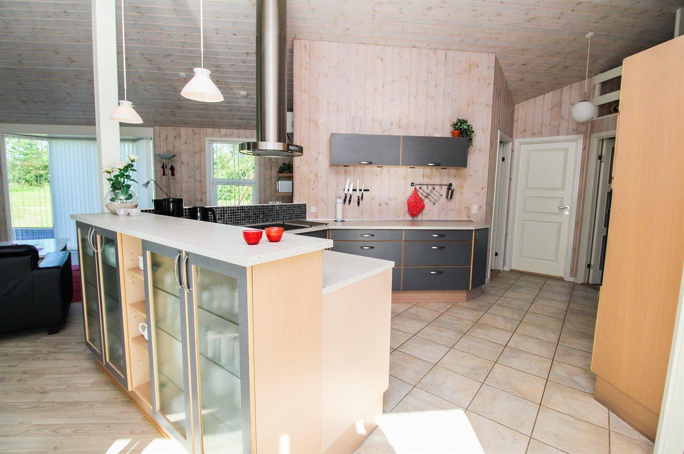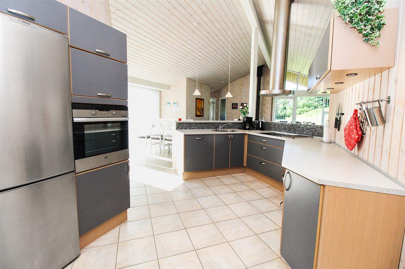 Køkkenet er udstyret med 1 køleskab. Der er 4 keramiske kogeplader, varmluftovn, mikrobølgeovn samt opvaskemaskine Der er gulvvarme i køkkenet.