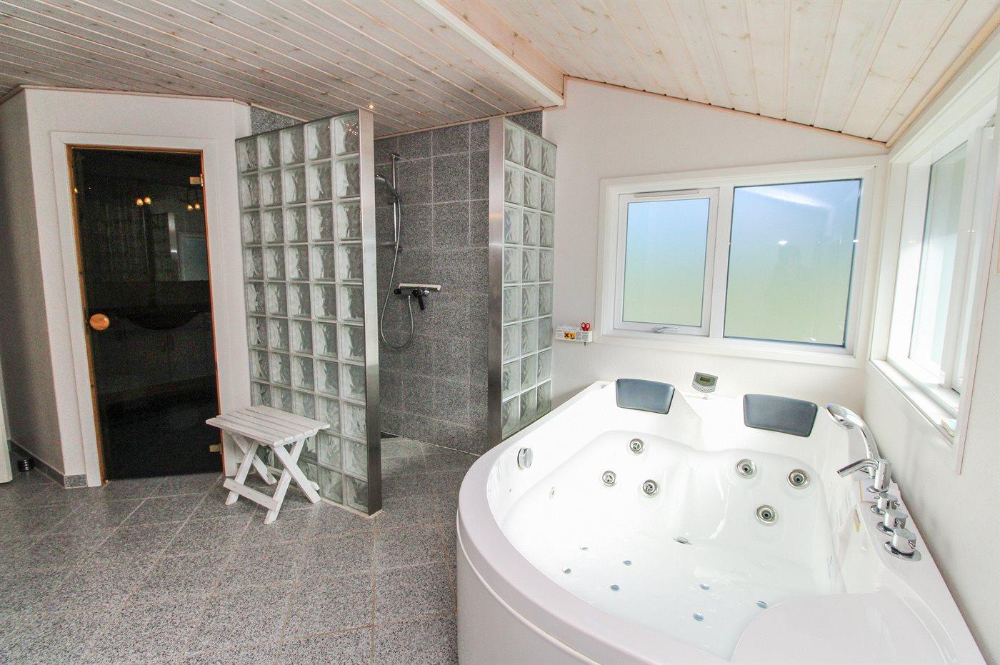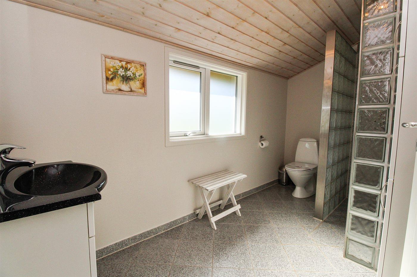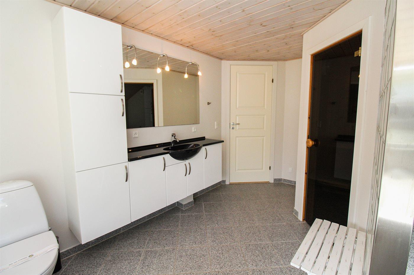 Der er 2 badeværelser med bruseniche og 2 toiletter. Der er gulvvarme på 1 badeværelse. I saunaen er der mulighed for afslapning.