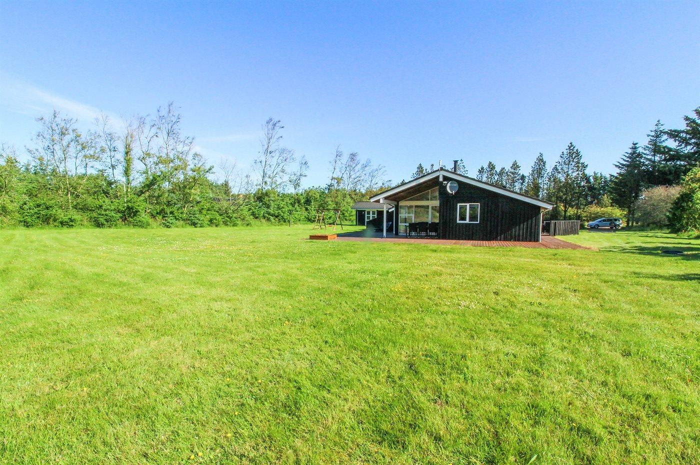 Skønt sommerhus beliggende på en meget stor, lukket og ugenert grund, på en blind vej, i et roligt og naturskønt sommerhusområde nær stranden og Vesterhavet.