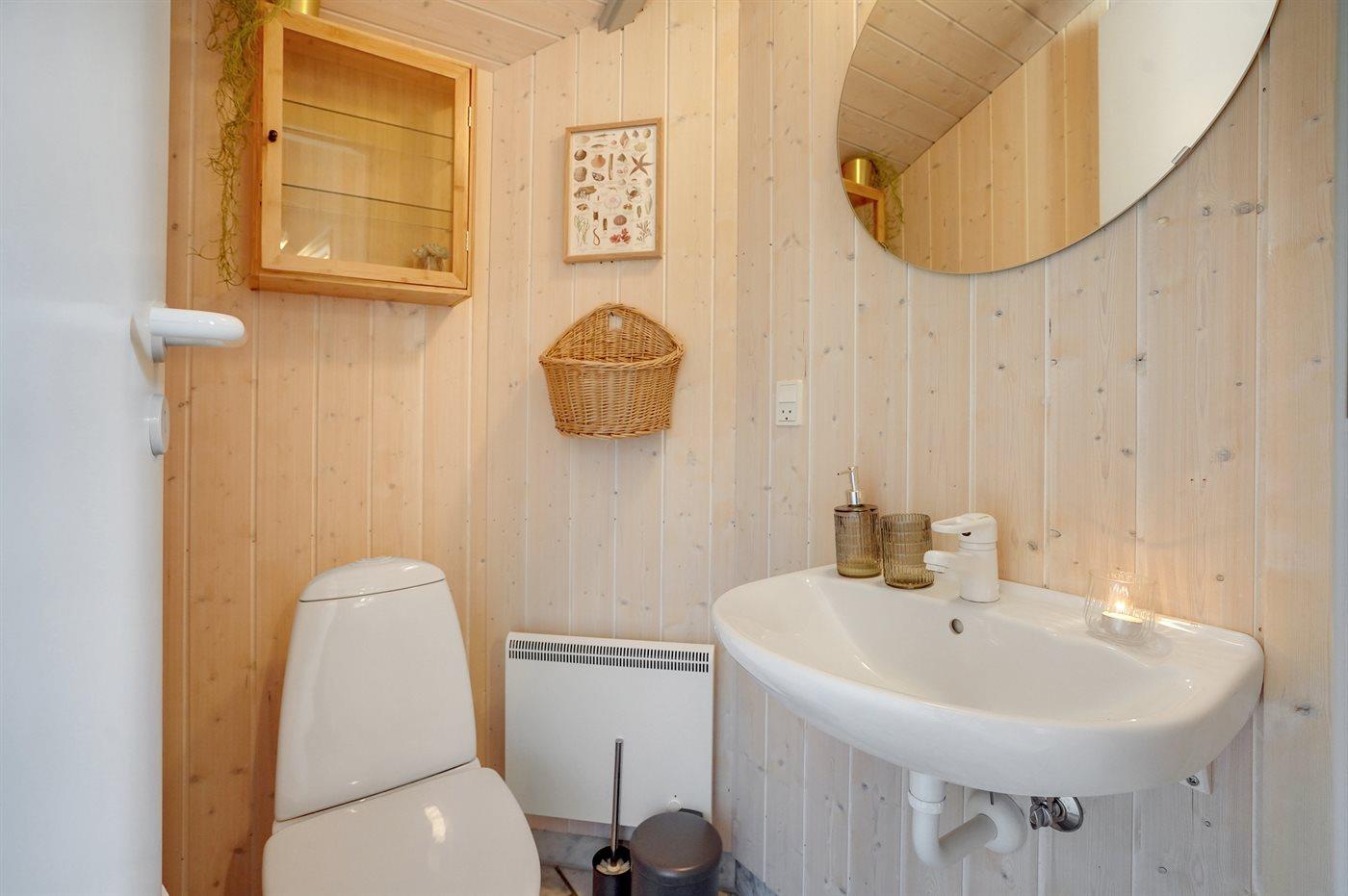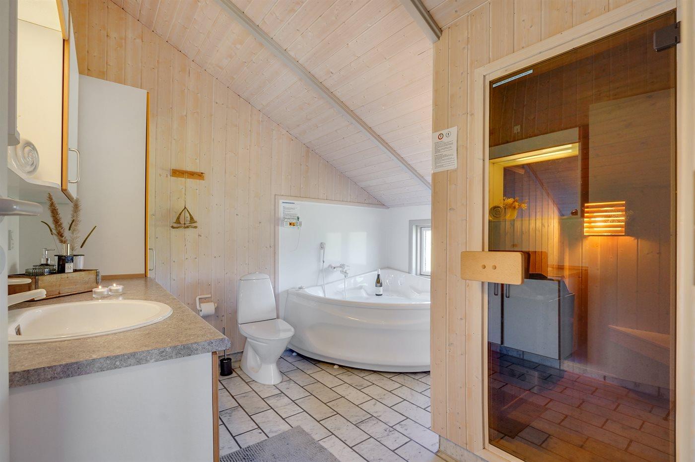 Der er 1 badeværelse med bruseniche og 2 toiletter, heraf 1 gæstetoilet. Der er gulvvarme på 1 badeværelse. I saunaen er der mulighed for afslapning.