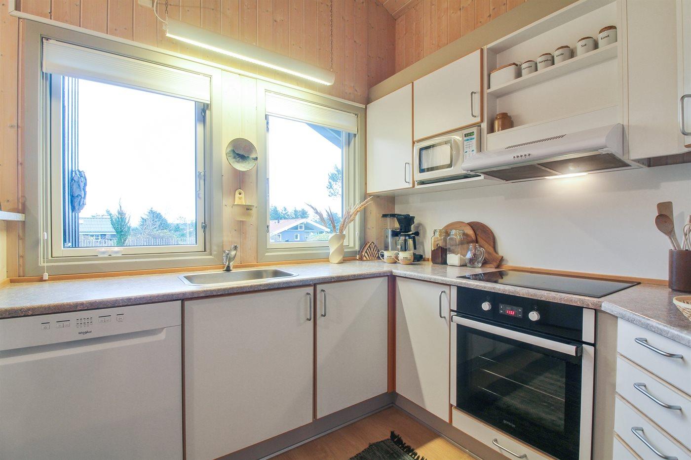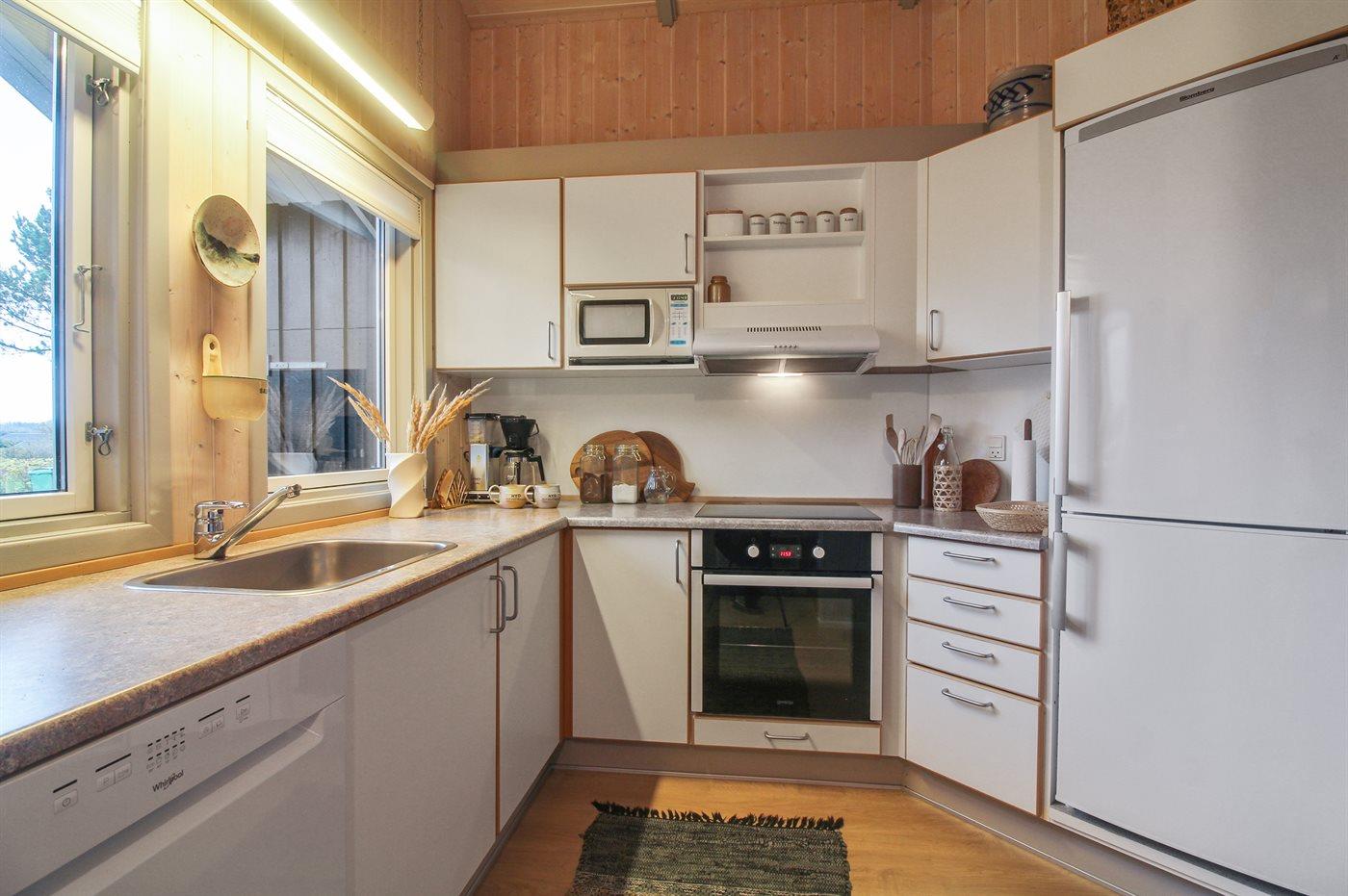 Køkkenet er udstyret med 1 køleskab. Der er 4 keramiske kogeplader, varmluftovn, mikrobølgeovn samt opvaskemaskine.