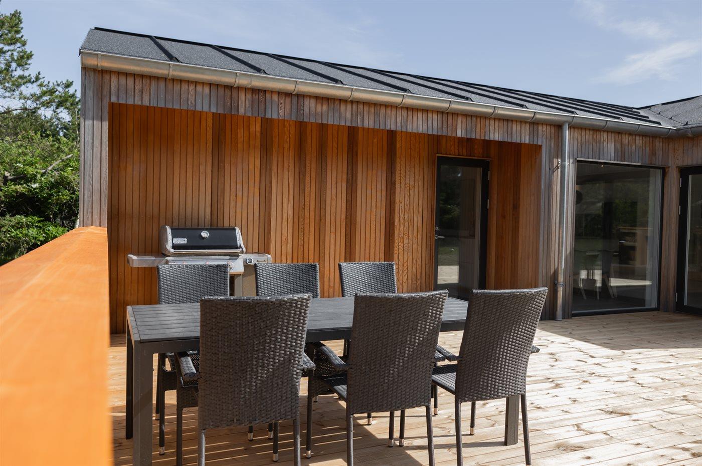 Ferieboligen er beliggende på en 1967 m² stor naturgrund. Der er 600 m til havet. Nærmeste forretning er beliggende i en afstand af 300 m. Til ferieboligen hører åbent terrasseareal. Desuden er der overdækket terrasse. Trampolin. Udendørs bruser. Grill til rådighed. Der er installeret stik til opladning af elbil. Parkering ved ferieboligen.