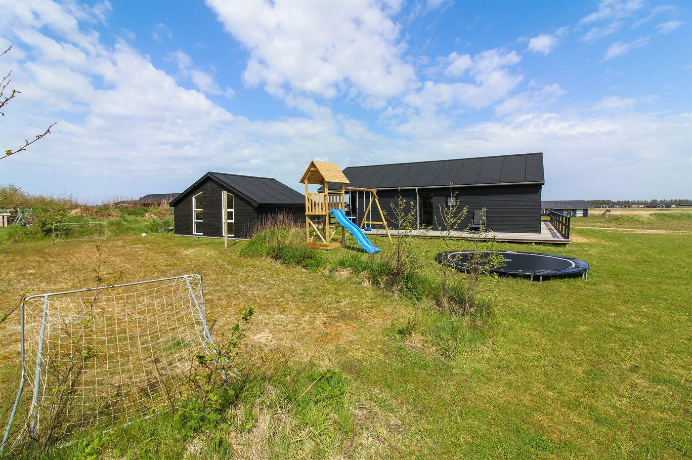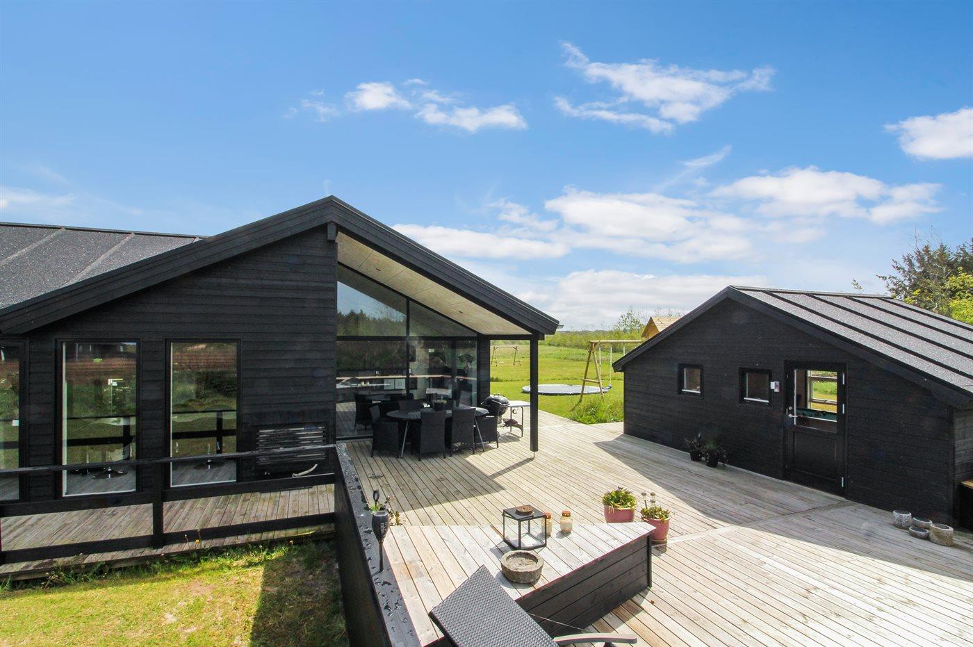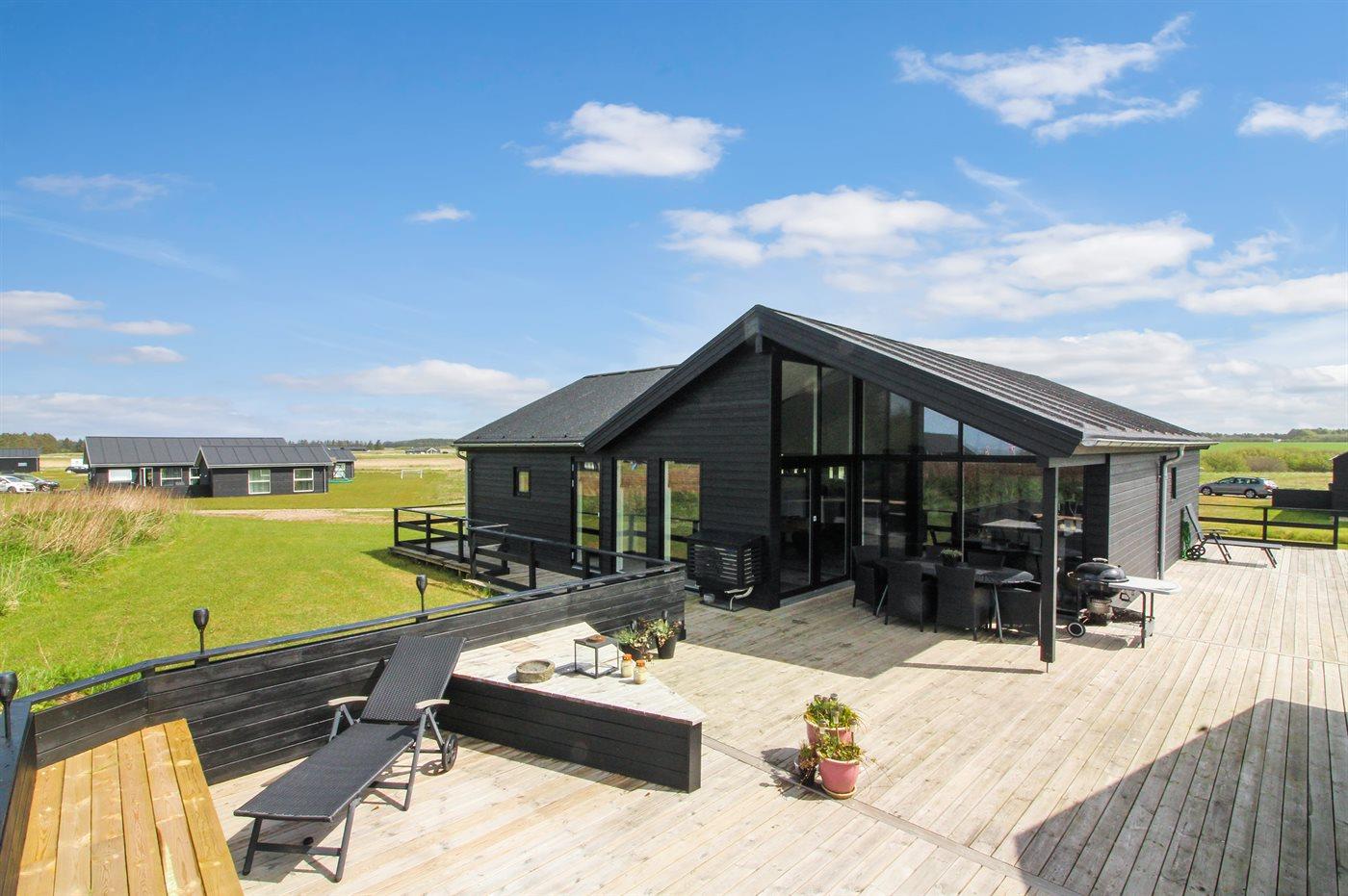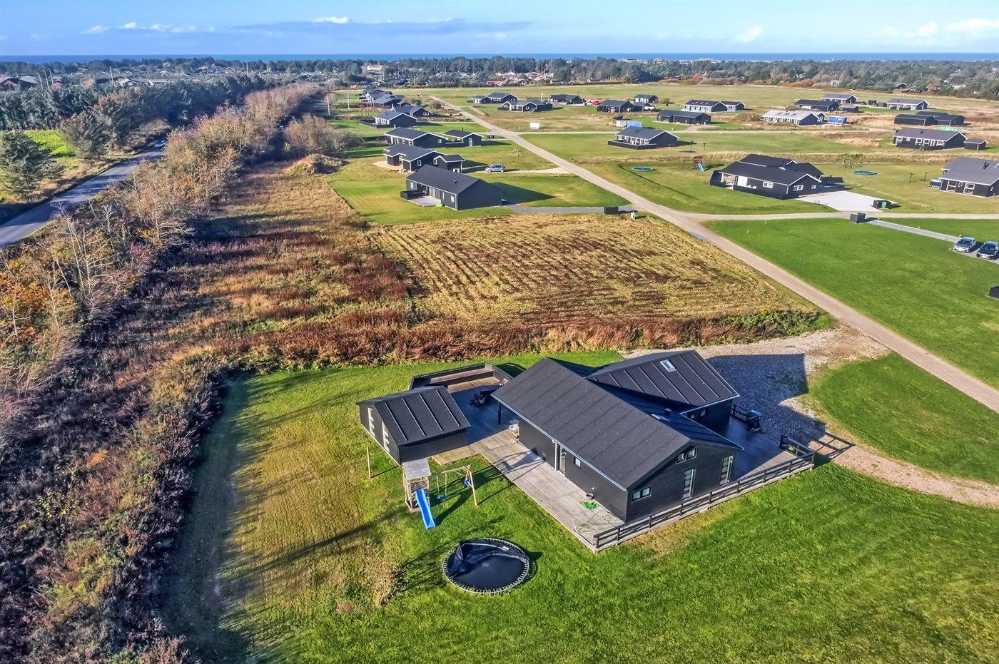 Nyt og rummeligt sommerhus nær Vesterhavet med sauna, spa og stort aktivitetsrum på stor naturgrund.