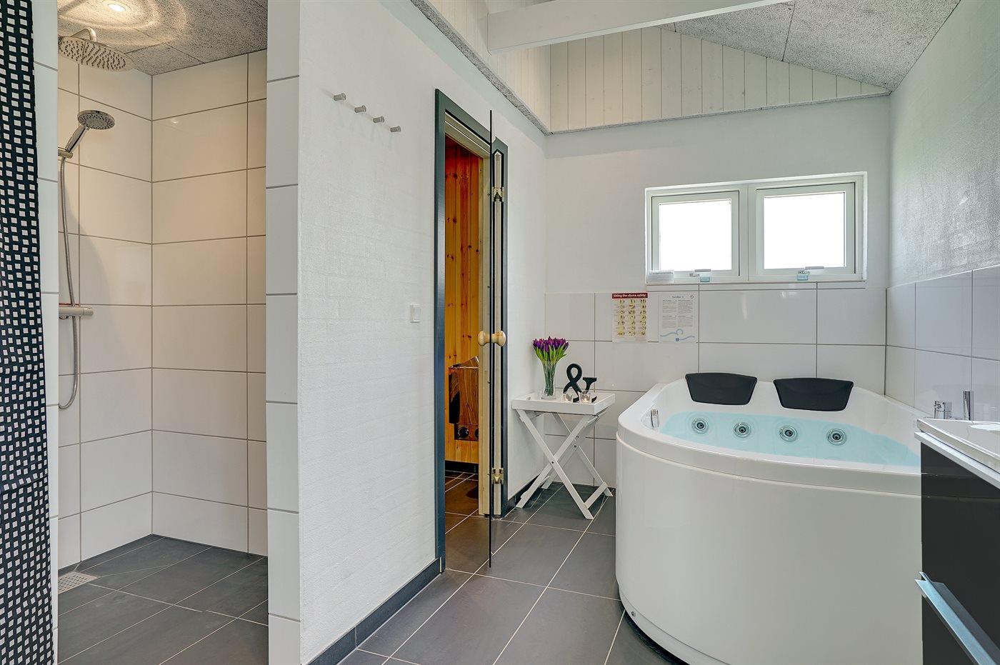 Der er 2 badeværelser med bruseniche og 2 toiletter. Der er gulvvarme på 2 badeværelser. I saunaen er der mulighed for afslapning.