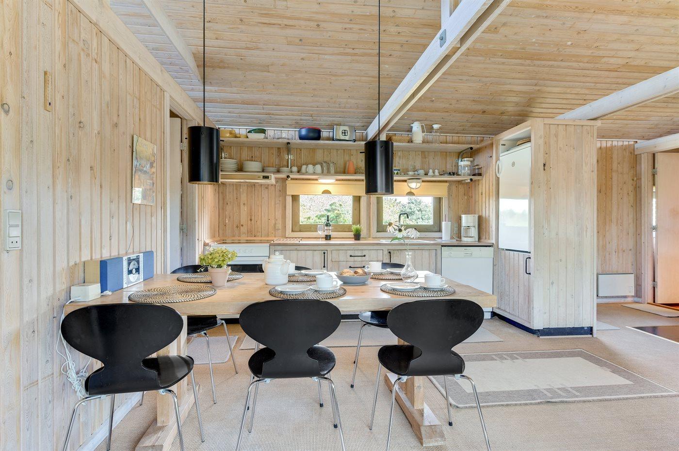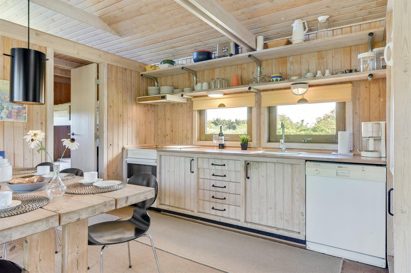 Køkkenet er udstyret med 1 køleskab. Der er 4 elkogeplader, bageovn samt opvaskemaskine.