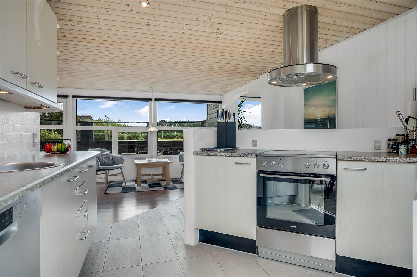Køkkenet er udstyret med 1 køleskab. Der er 4 keramiske kogeplader, varmluftovn, mikrobølgeovn samt opvaskemaskine Der er gulvvarme i køkkenet.