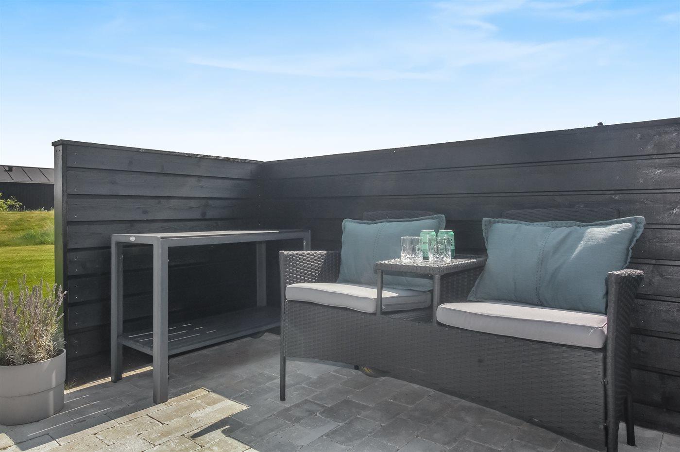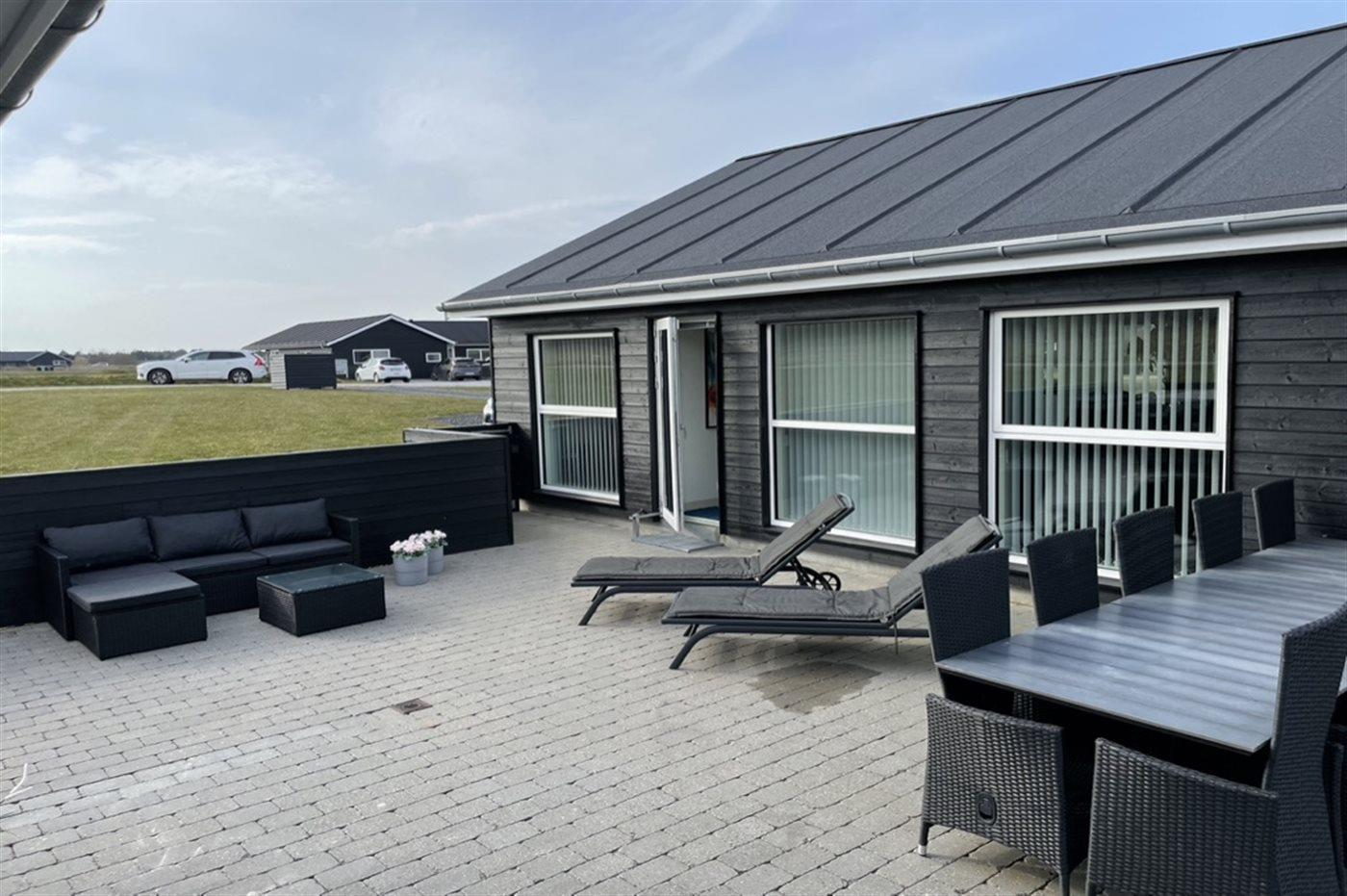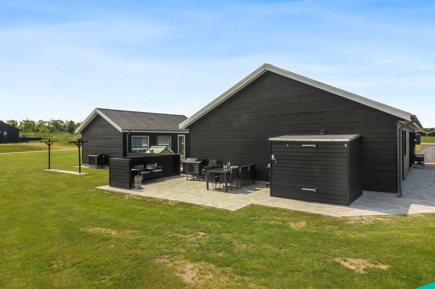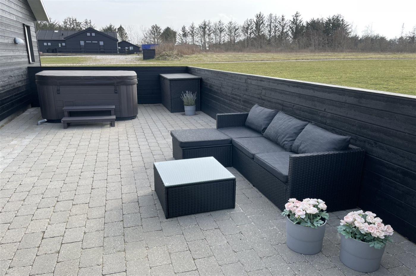 Hus og anneks er forbundet med en stor dejlig terrasse på 80 m², hvor der hele året er mulighed for at benytte det udendørs standvandsspa til 4 personer. Derudover er der legehus og sandkasse. Der er redskabsrum til rådighed. I hyndeboksen på terrassen er der diverse spil mm til udendørsaktivitet – f.eks. kroket, stangtennis, kongespil, Cornhole og stigegolf.