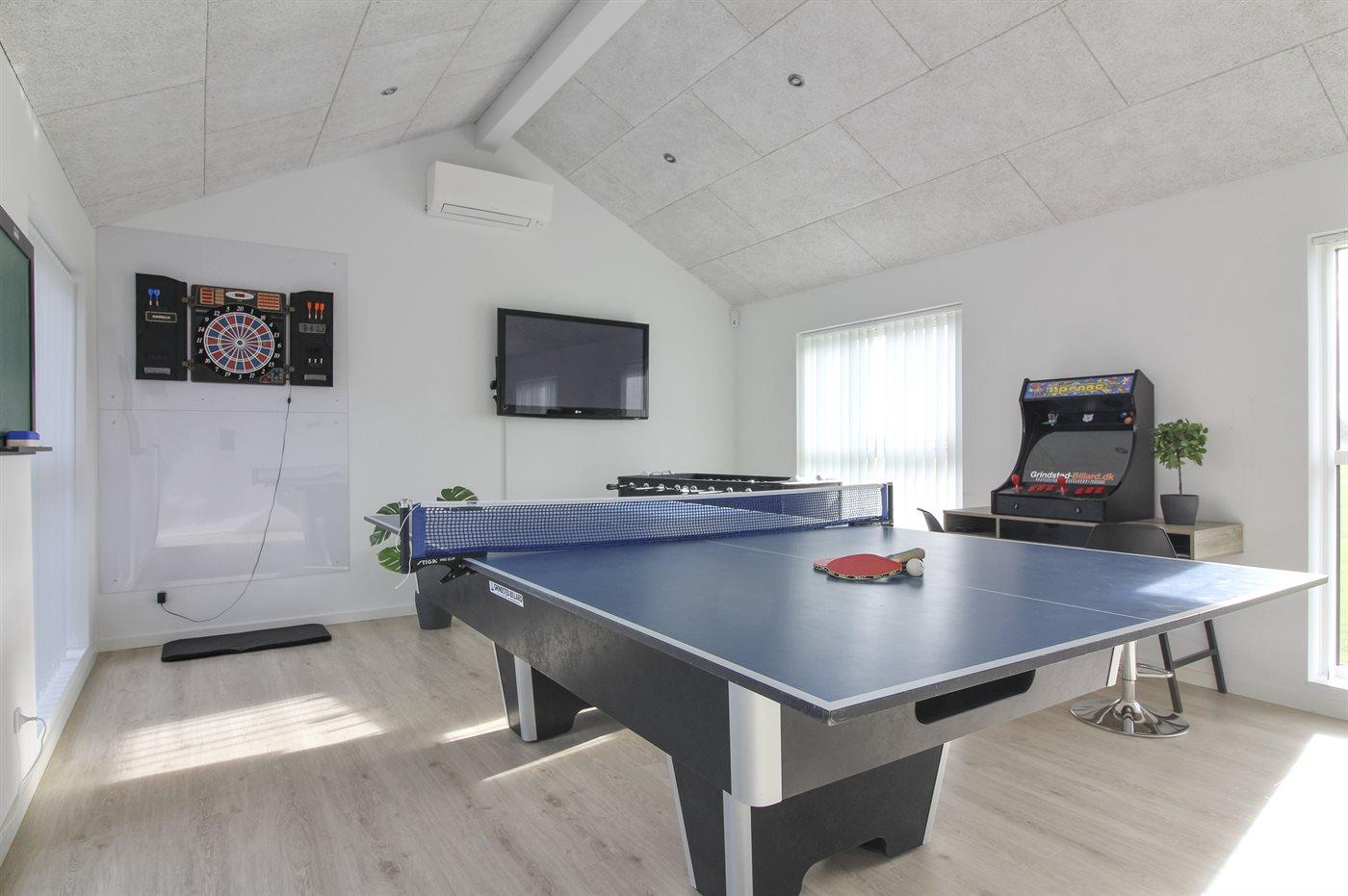 I aktivitetsrummet er der følgende udstyr: Billard, bordtennis, dart, bordfodbold, Shuffleboard, arkadespillemaskine, TV og en radio (FM-, DAB+, internetradio og mulighed for at spille musik trådløst via Bluetooth). I huset er der 1 smart-TV og radio (FM-, DAB+, internetradio og mulighed for at spille musik trådløst via bluetooth). Der er mindst 4 danske kanaler,1-3 svenske kanaler, 1-3 norske kanaler og mere end 3 tyske kanaler.