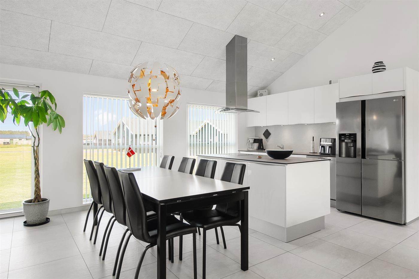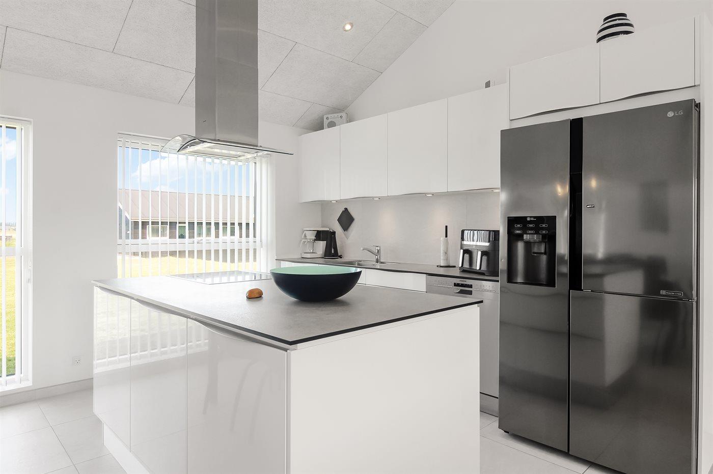 Køkkenet er udstyret med 1 amerikansk køleskab, frysekapacitet på 90 liter. Der er 4 induktionskogeplader, varmluftovn, mikrobølgeovn, airfryer, paninigrill, køkkenmaskine, samt opvaskemaskine.