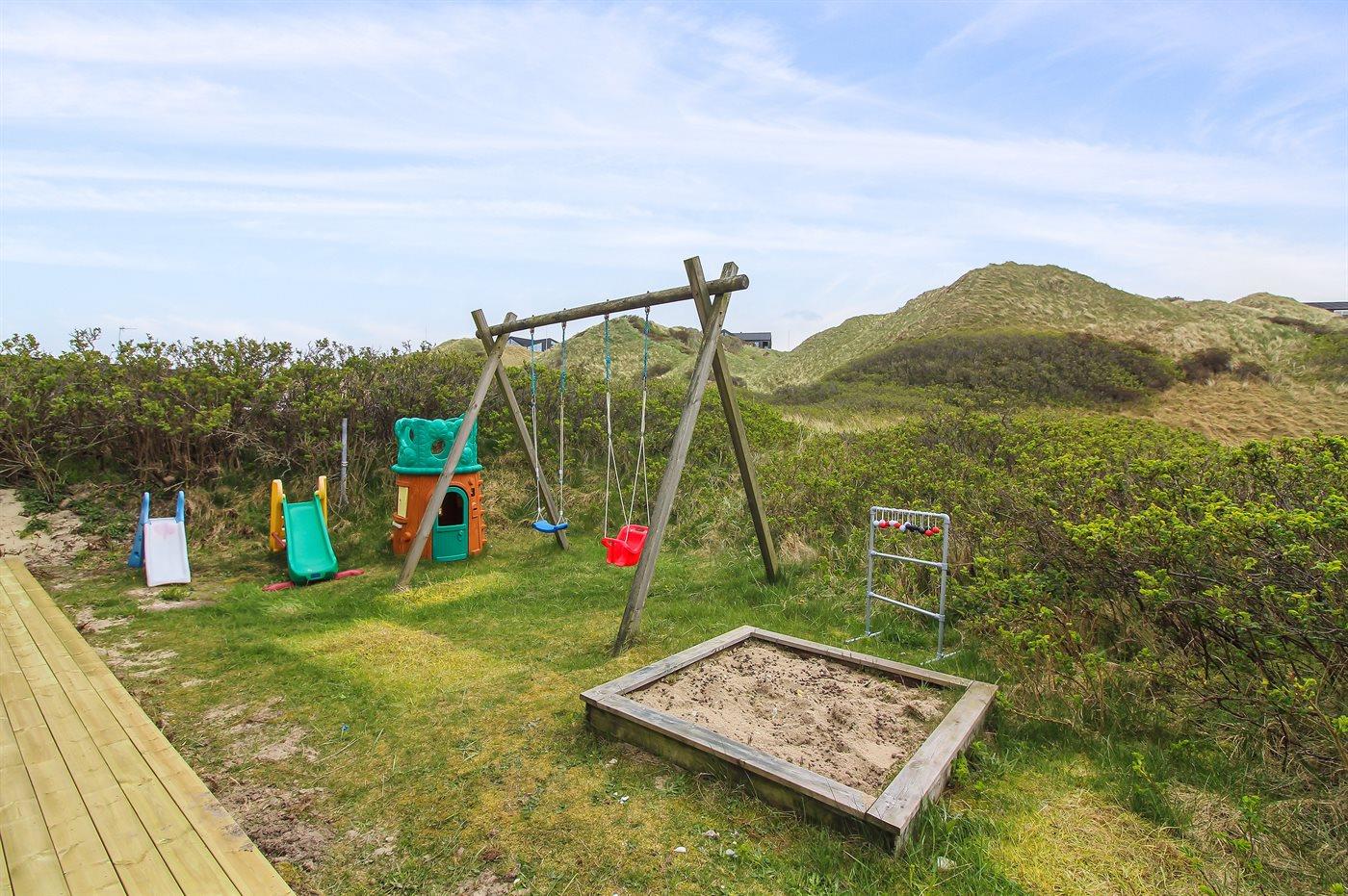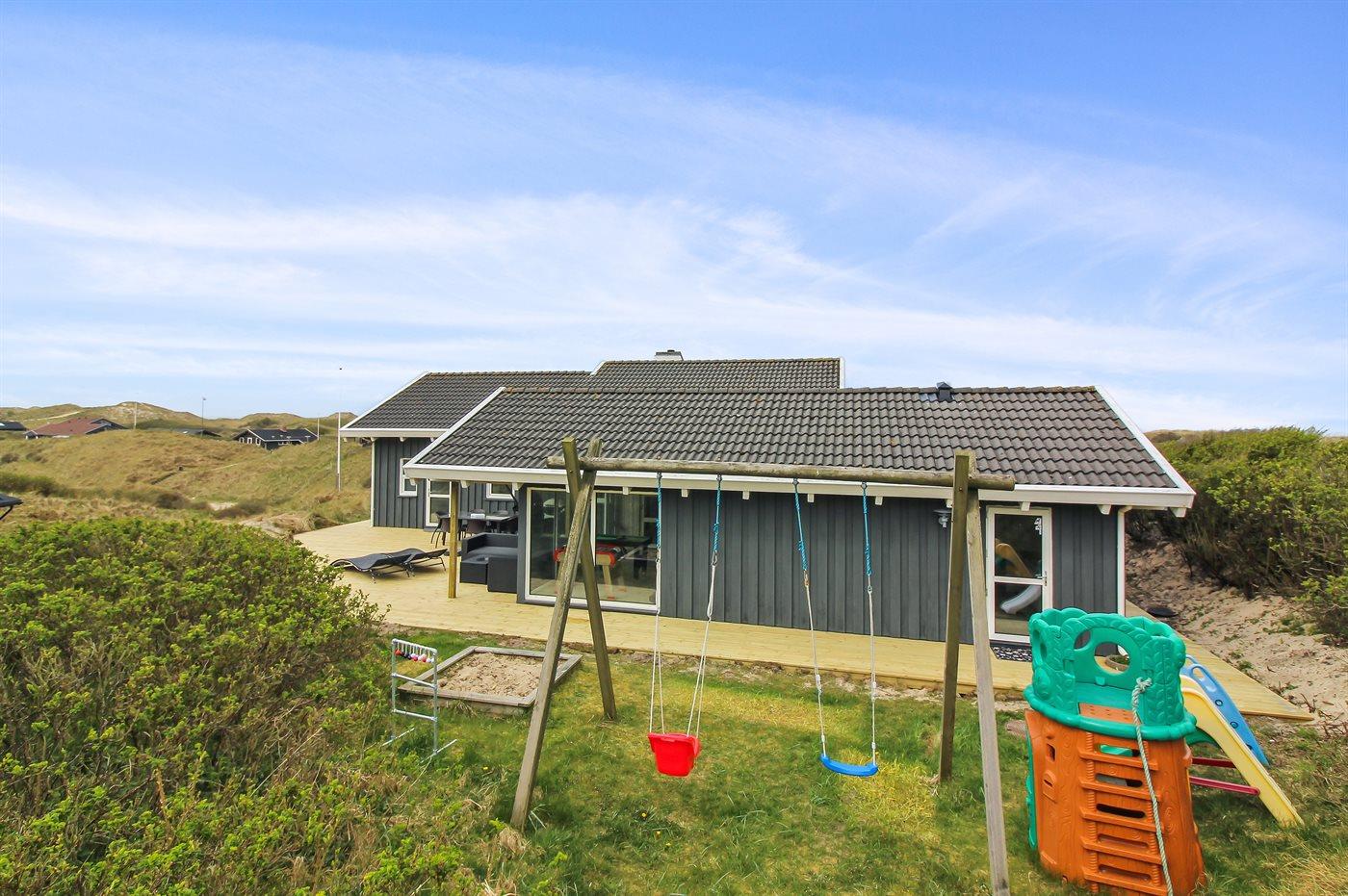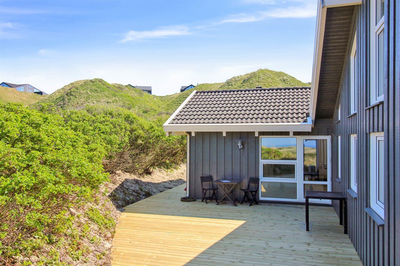 Ferieboligen er beliggende på en 2758 m² stor klitgrund. Der er 350 m til havet. Nærmeste forretning er beliggende i en afstand af 5000 m. Til ferieboligen hører 75 m² terrasseareal. Desuden er der 10 m² overdækket terrasse. Gynge. Sandkasse. Rutchebane. Grill til rådighed. Der er installeret stik til opladning af elbil. Type 2 stik.
