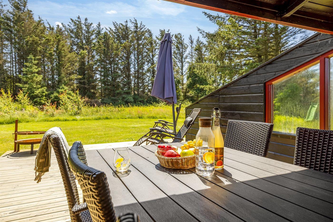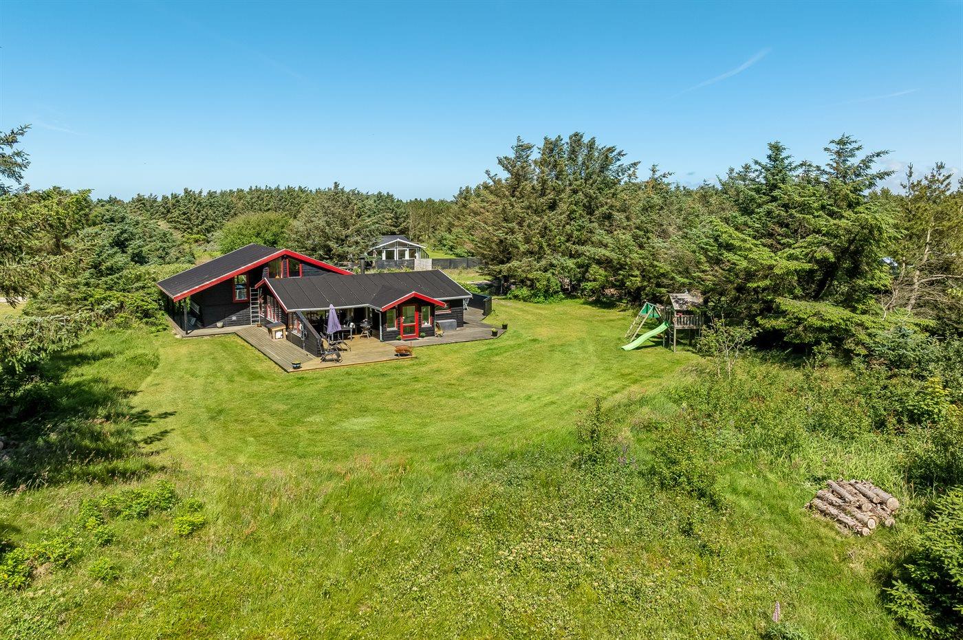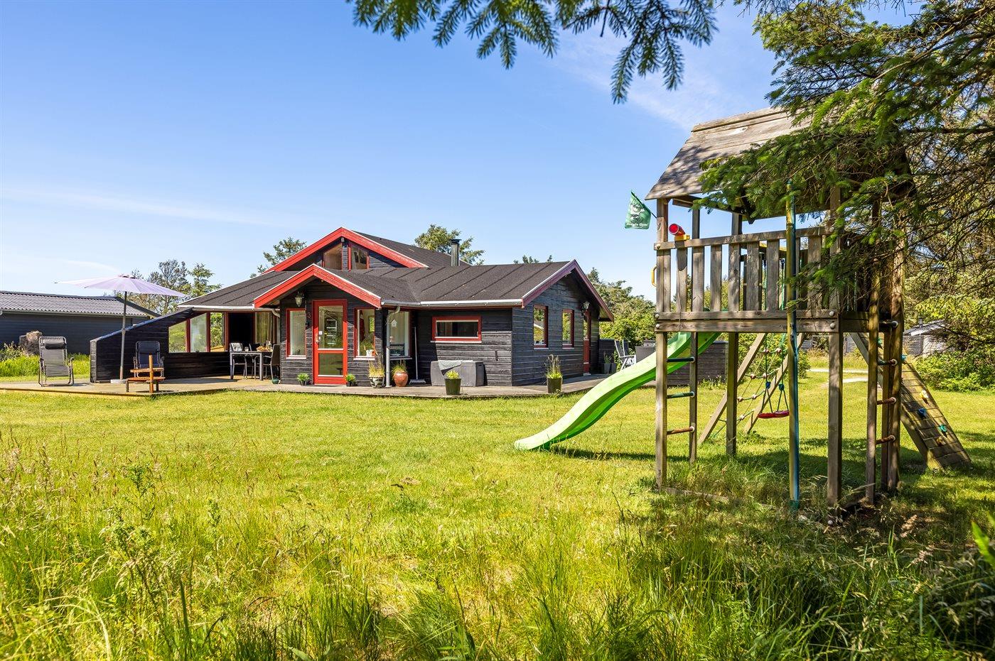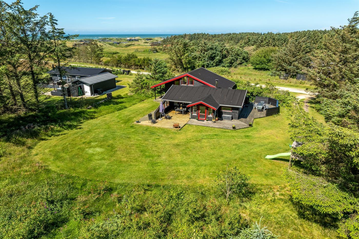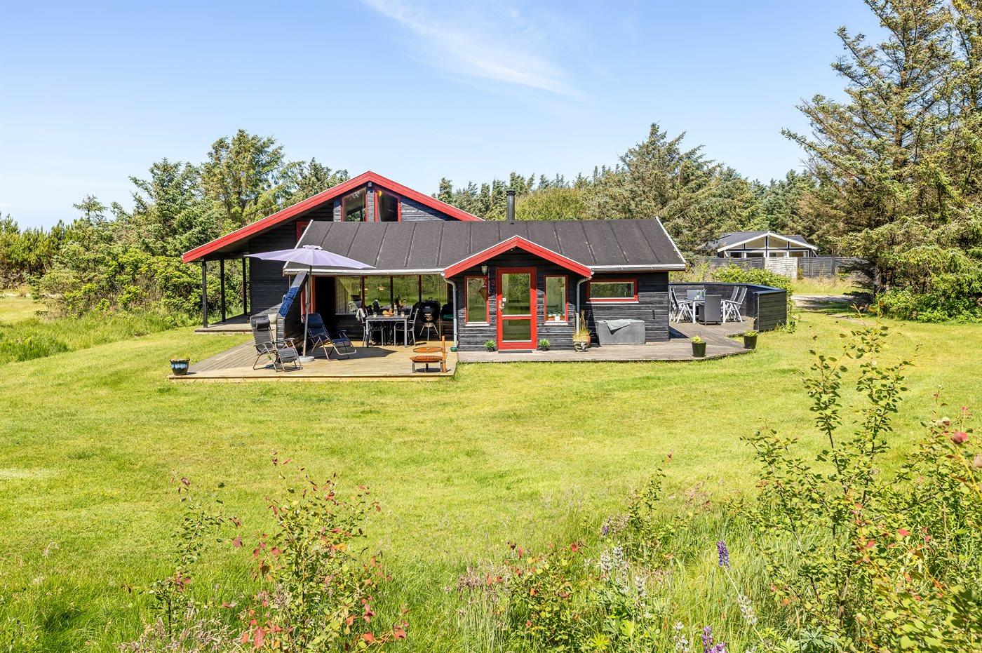 Hyggeligt sommerhus ved Vesterhavet med terrasser, brændeovn og plads til familien i naturskønne omgivelser.