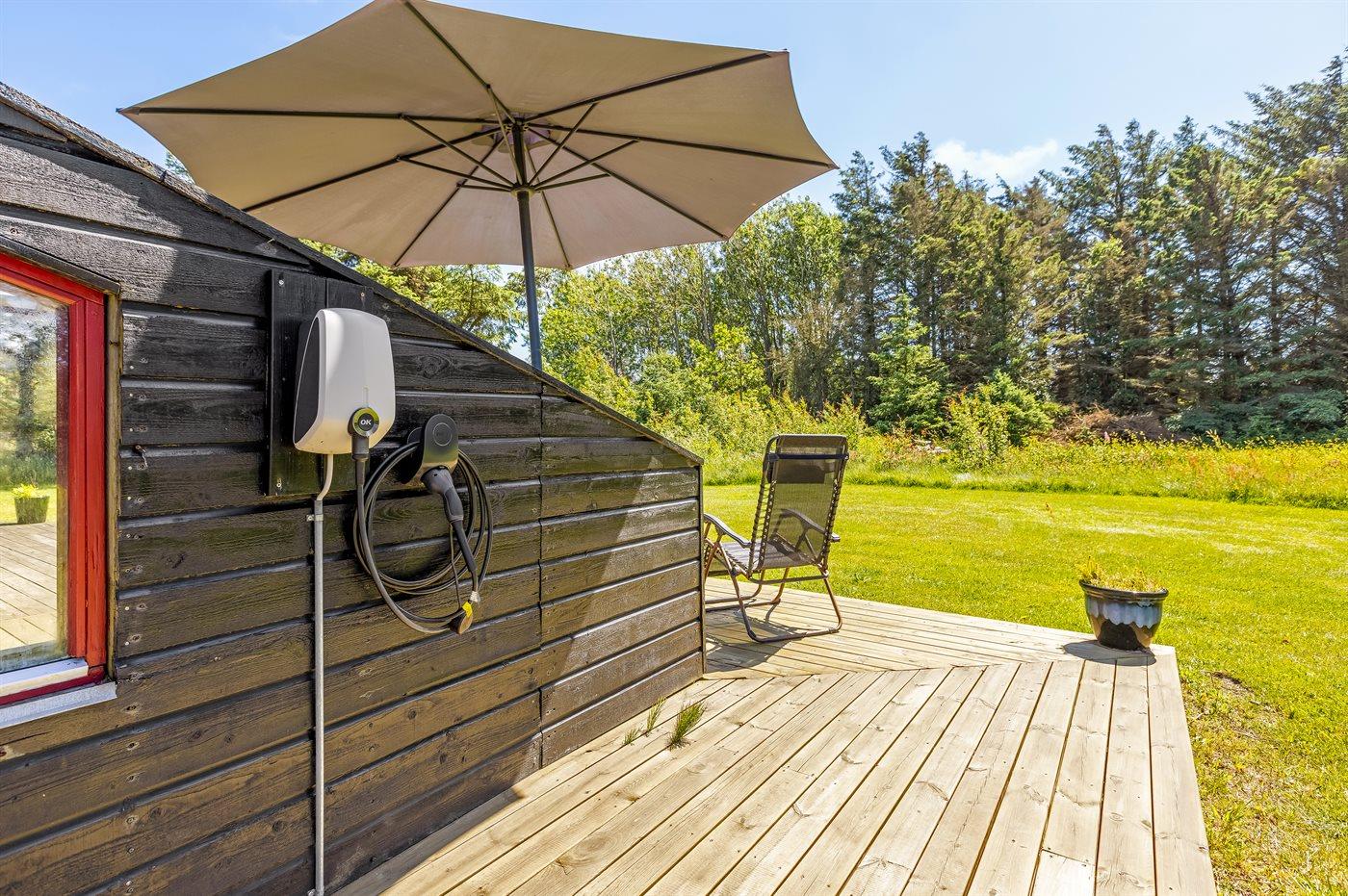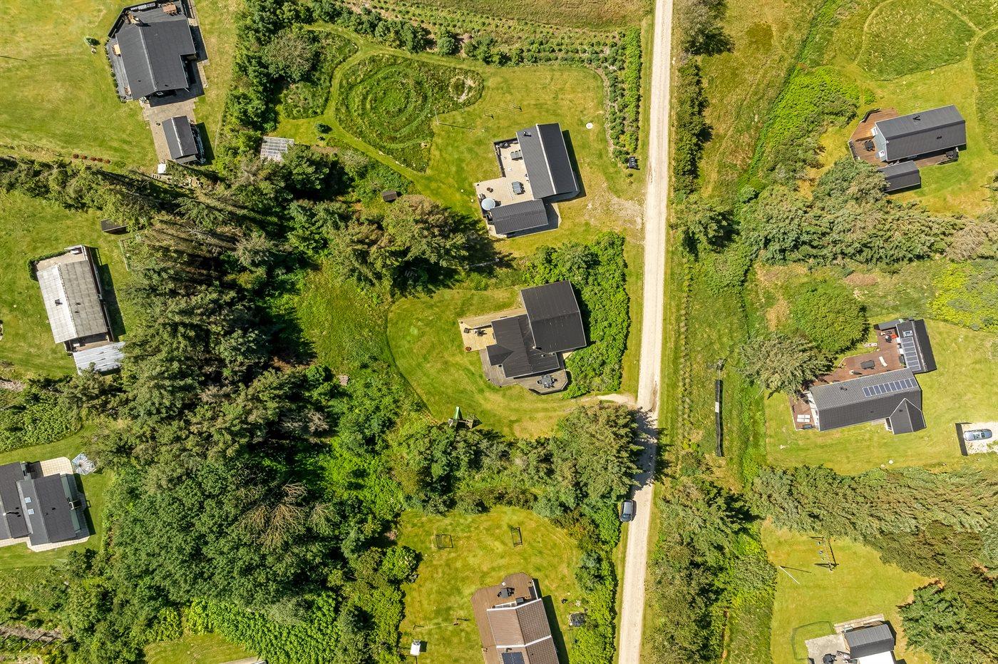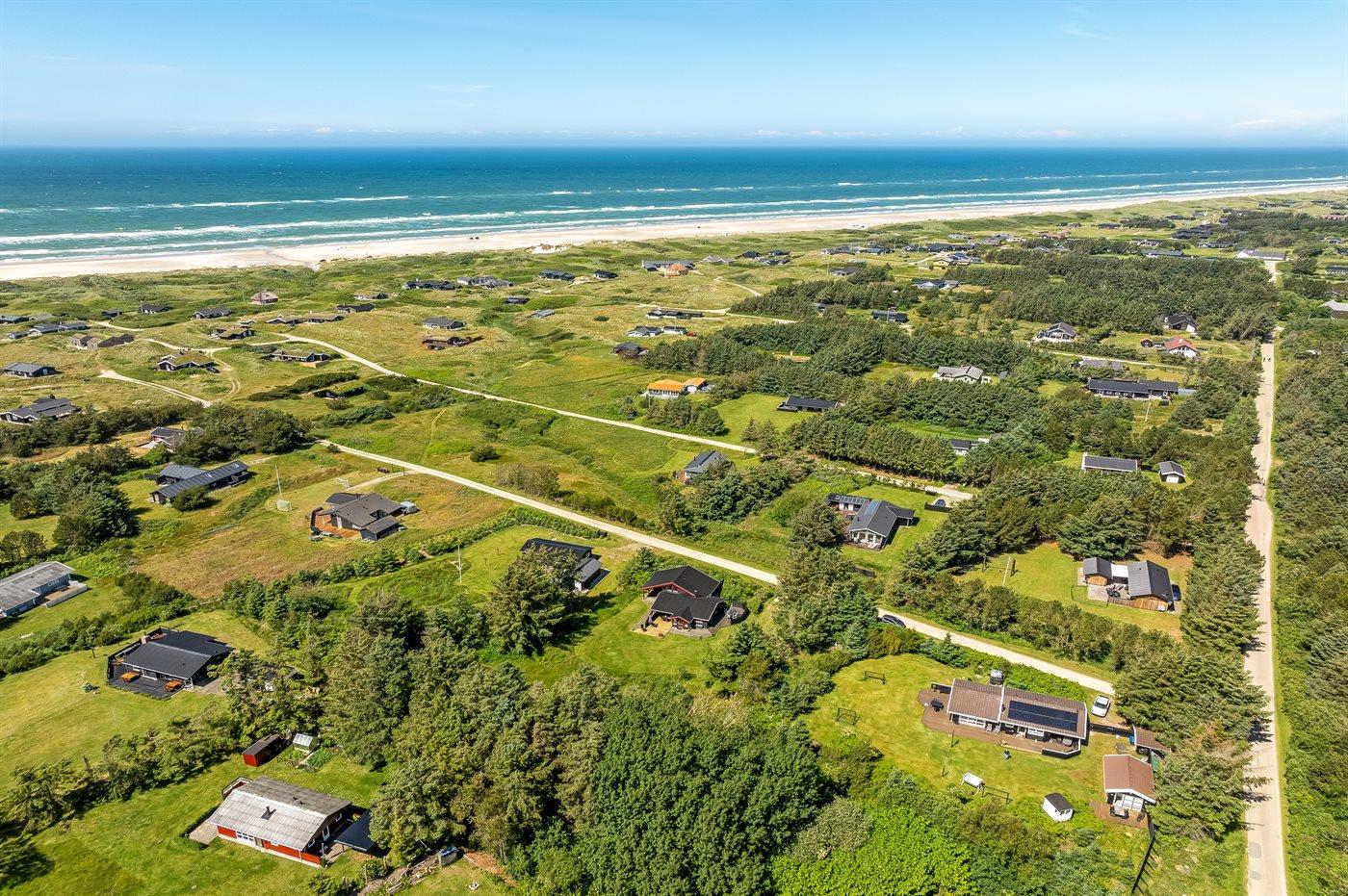 Ferieboligen er beliggende på en 2500 m² stor naturgrund. Der er 800 m til havet. Nærmeste forretning er beliggende i en afstand af 2000 m. Til ferieboligen hører 50 m² terrasseareal. Desuden er der 15 m² overdækket terrasse. Gynge. Legetårn. Udendørs bruser. Der er installeret stik til opladning af elbil. Parkering ved ferieboligen.