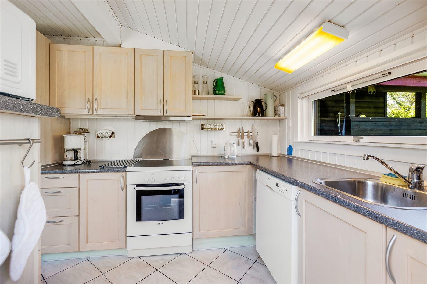 Køkkenet er udstyret med 1 køleskab. Der er 4 keramiske kogeplader, varmluftovn, mikrobølgeovn samt opvaskemaskine.