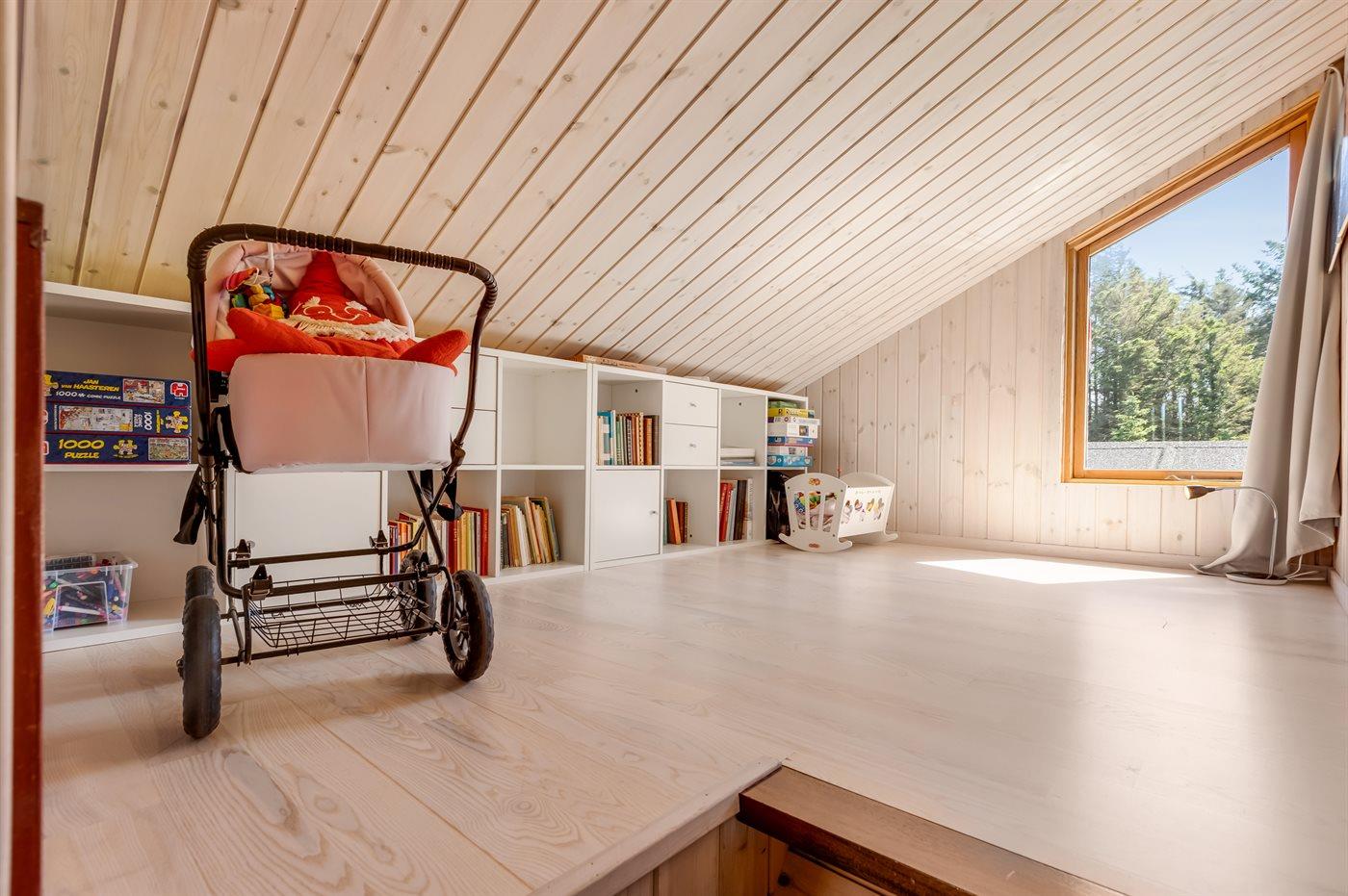 Det ene soveværelse ligger på det forskudte plan, ligesom der også er en sofagruppe i den etage. Her kan du nyde udsigt over trætoppene.